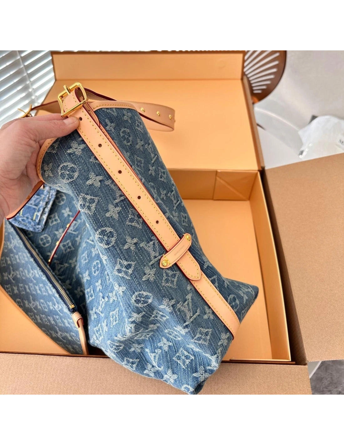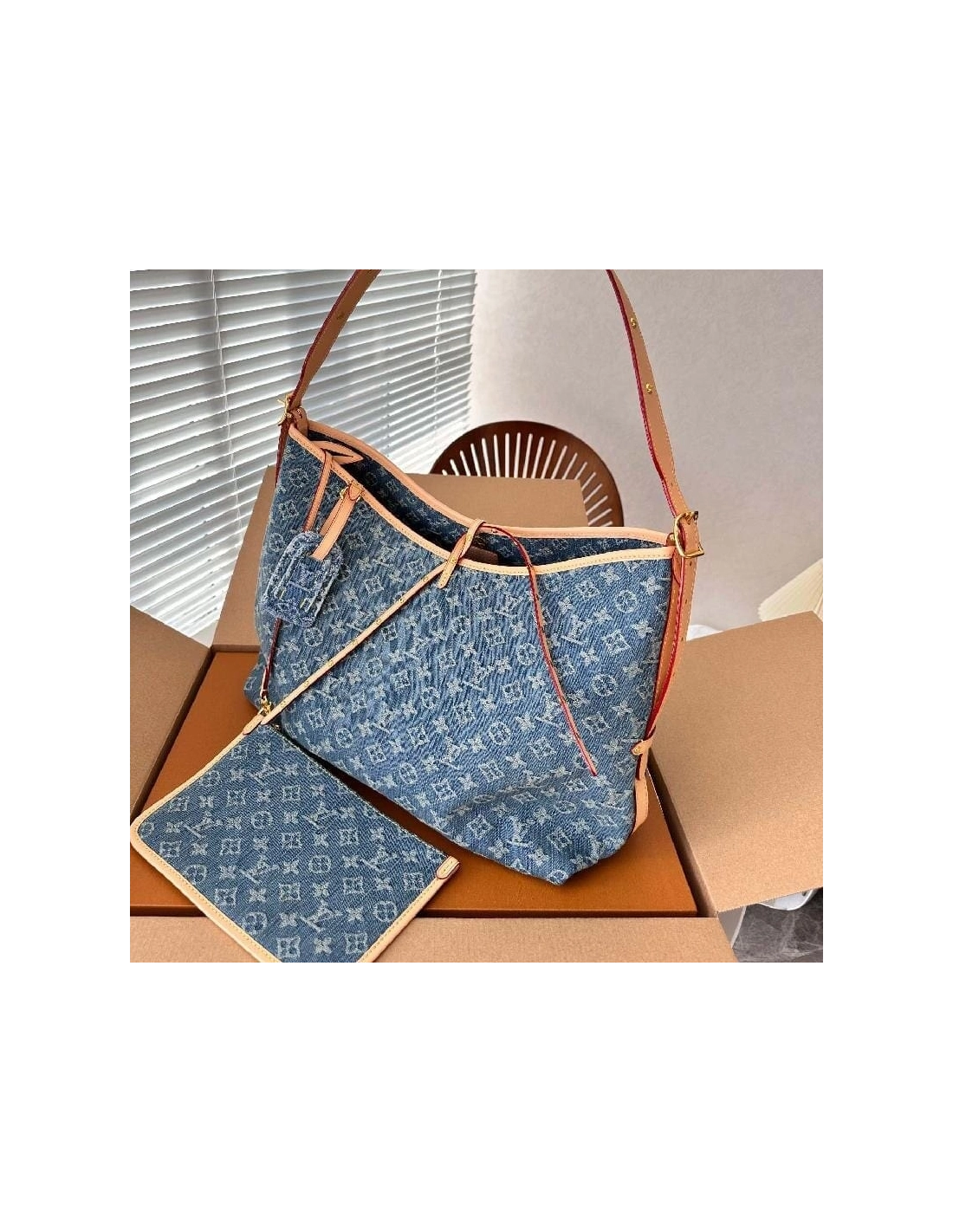 The roomy Carryall MM bag in Monogram Denim canvas with natural cowhide-leather trim combines style with functionality. The body-friendly design and spacious interior make it a versatile everyday bag. Theres an inside zipped pocket and a leather drawstring, in addition to the magnetic closure. The adjustable shoulder strap enables a comfortable carry.