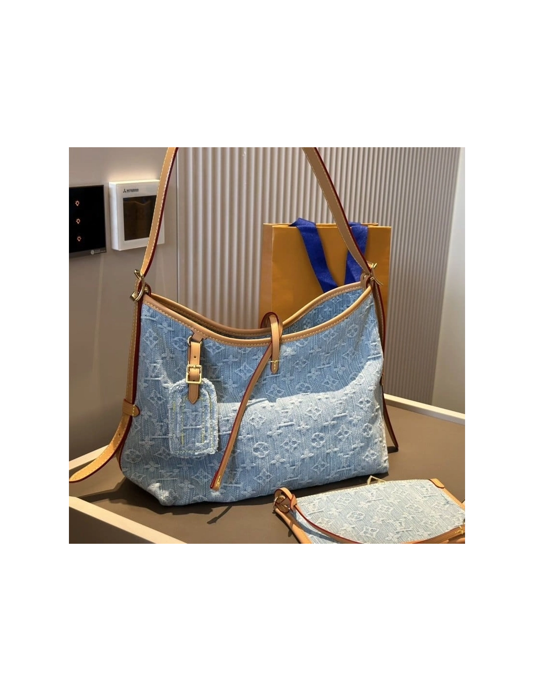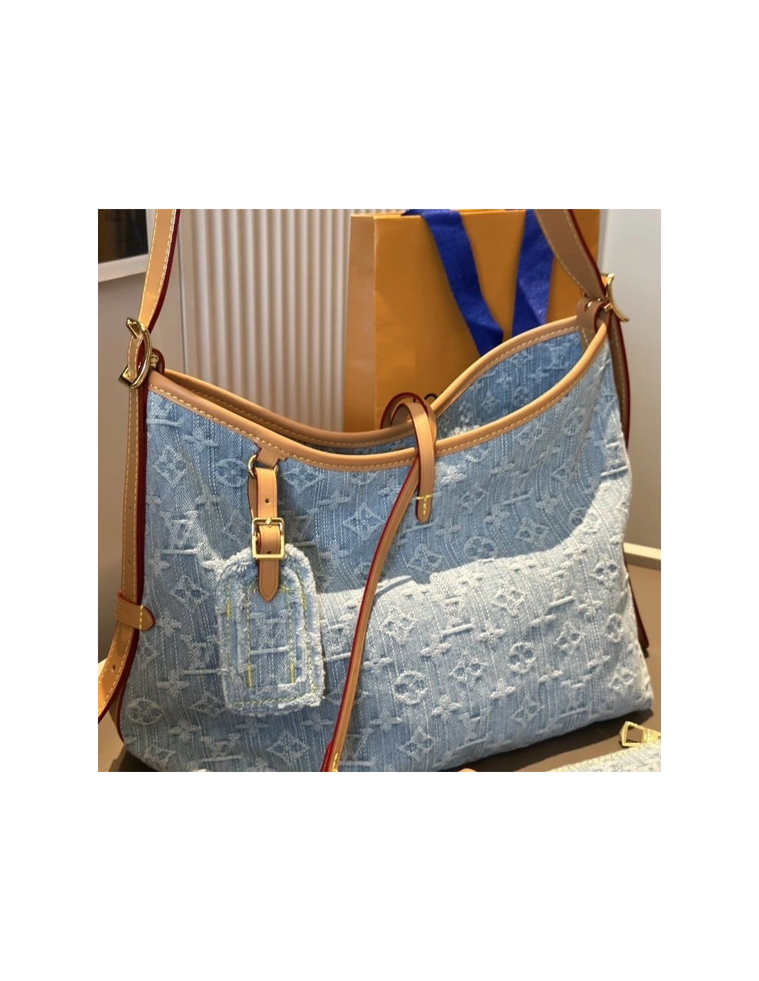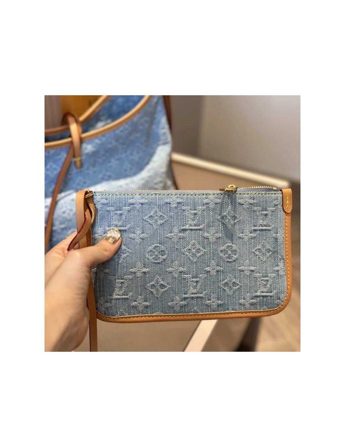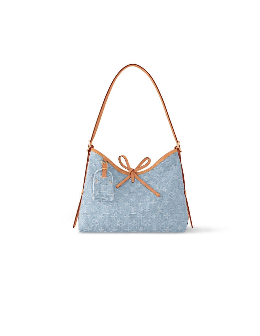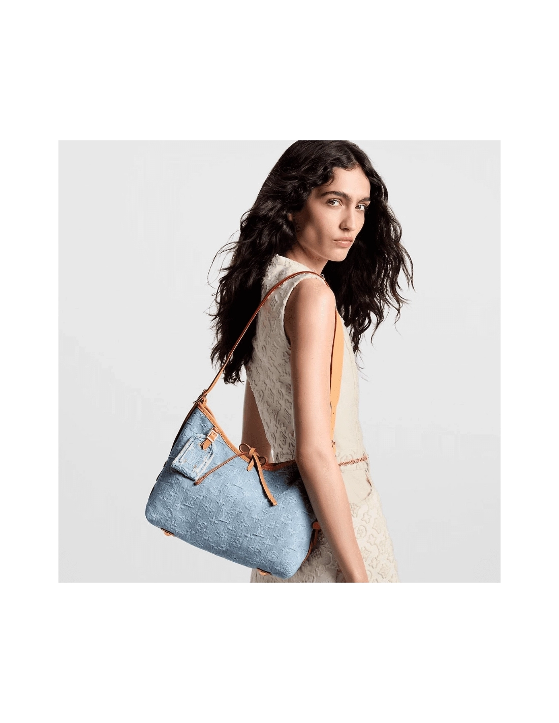 Made from 100% organic cotton, this Carryall PM in Monogram Denim is part of the LV By The Pool Collection. The stonewashed treatment of the light-blue and white Monogram gives the bag a casual elegance. The design includes a matching, removable pouch and three inside pockets. The strap adjusts for hand, shoulder, or cross-body carry.