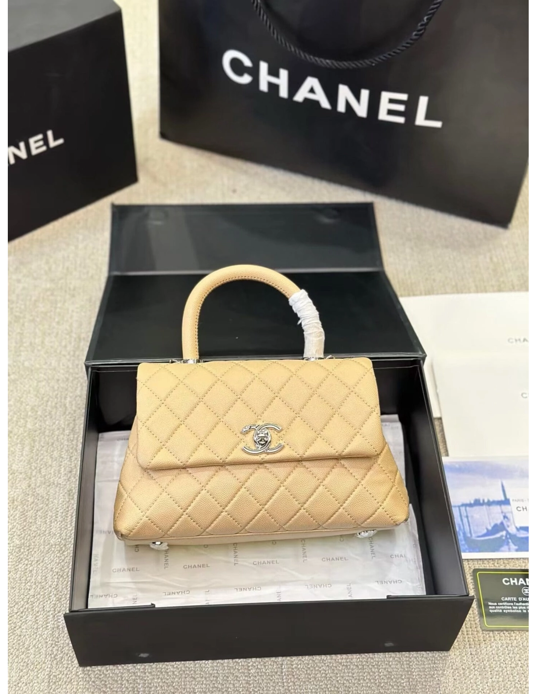 Chanel Beige Quilted Caviar Mini Coco Top Handle Pale Gold Hardware