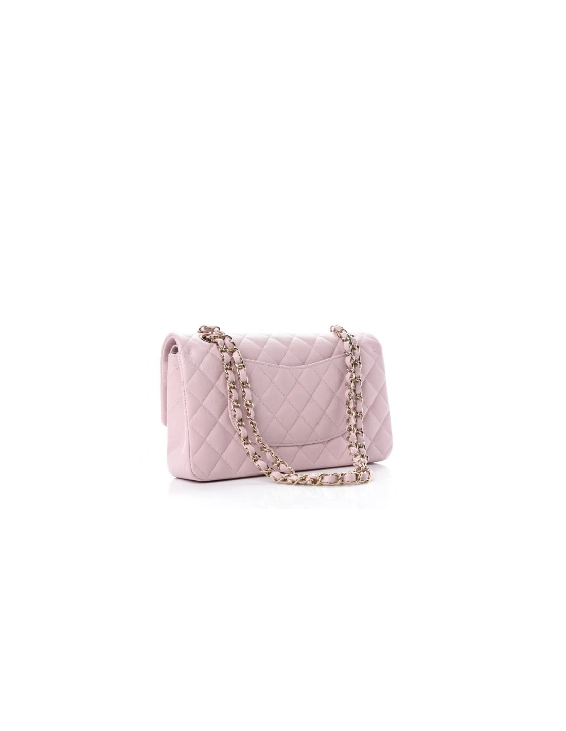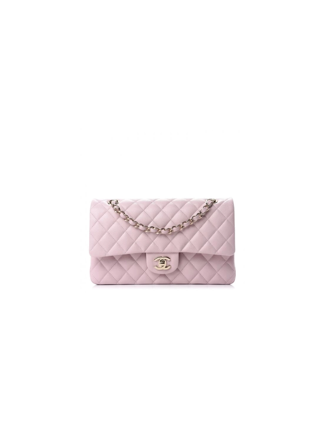 This is an CHANEL Caviar Quilted Medium Double Flap in Light Pink. This medium classic flap bag is beautifully crafted of luxurious soft pink caviar leather. The bag features a light gold chain-link shoulder strap threaded with pink leather, a crossover flap, and a light gold Chanel CC turn-lock on the front. The flap opens to reveal an inner flap and a pink leather interior with patch pockets.