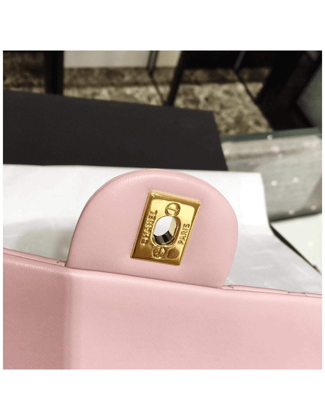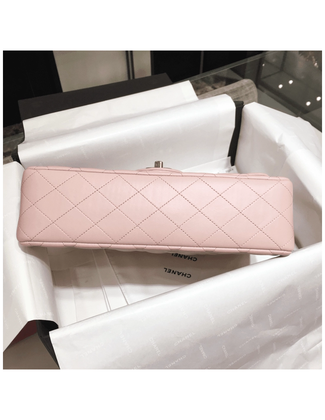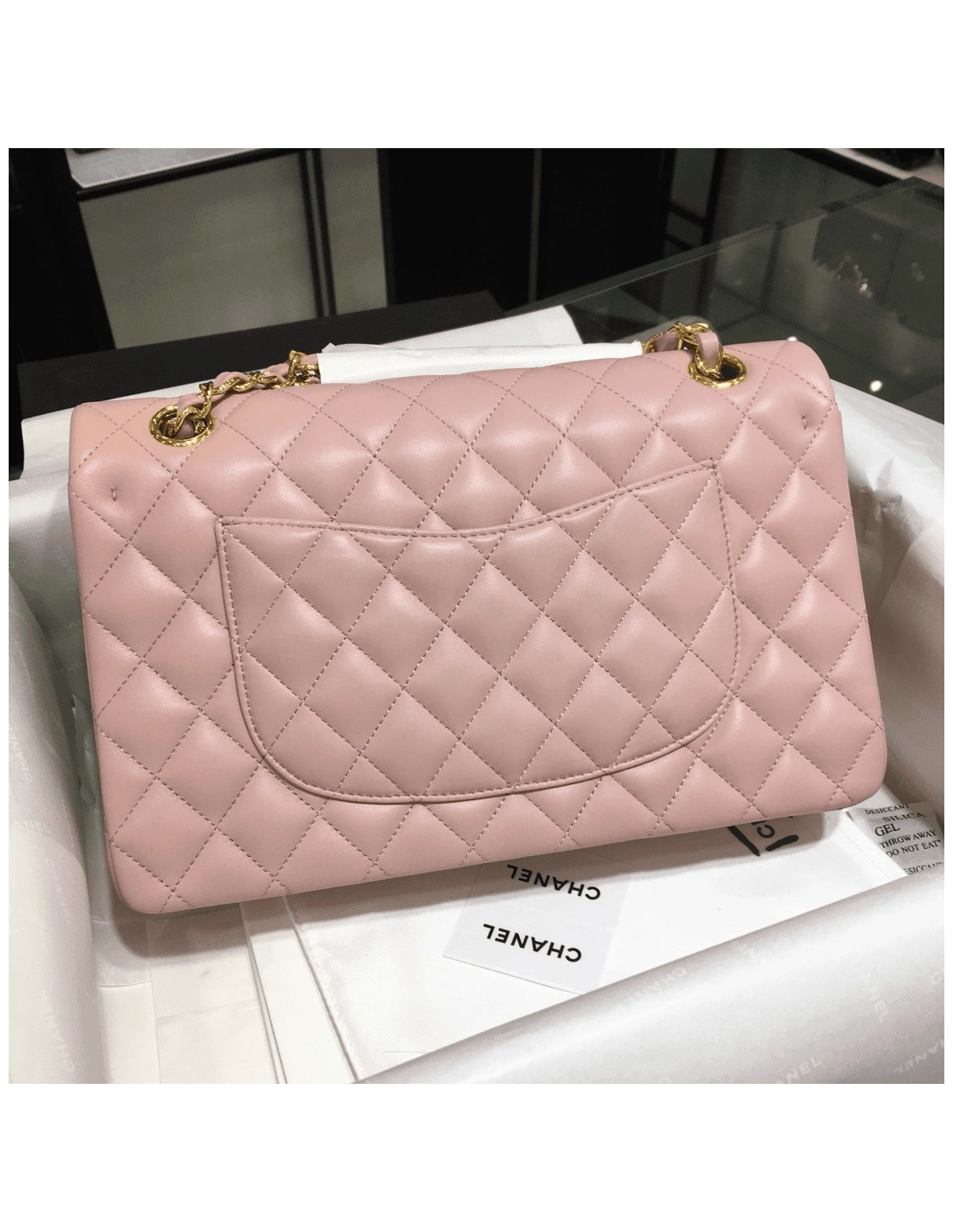 Chanel Classic Double Flap Small Shoulder Bag Pink Lambskin Pocket : Outside: Pocket x1, Inside: Zipper Pocket x1, Pocket x5 Size(cm) : 15.5 X 25.5 X 6.5 cm, Strap Drop.(Single) 42.0 cm, Strap Drop.(Double) 25.0 cm Color / Material : Pink / Lambskin Leather