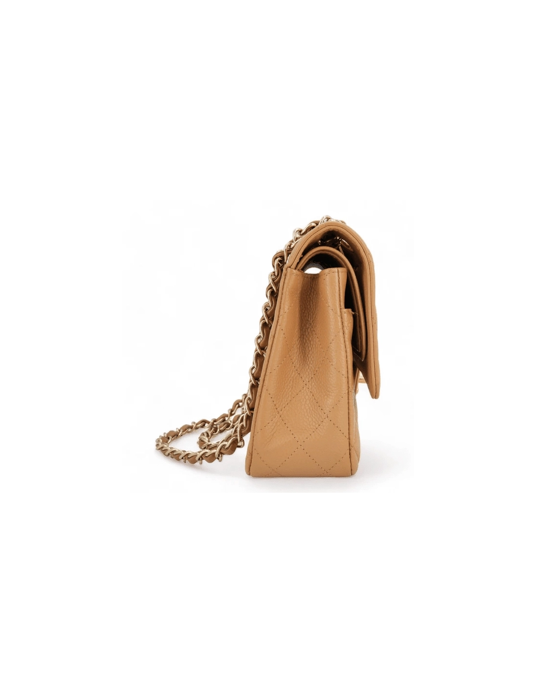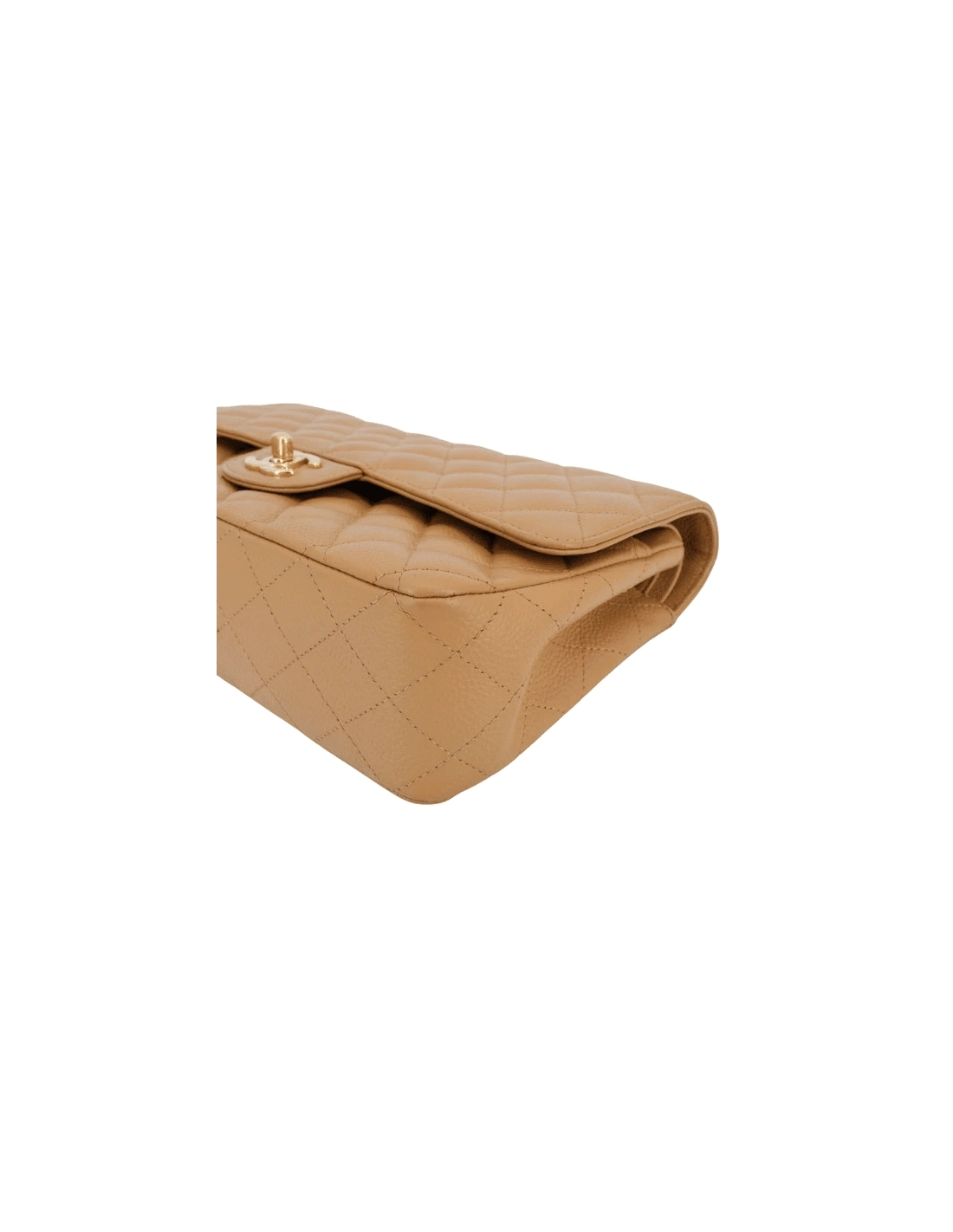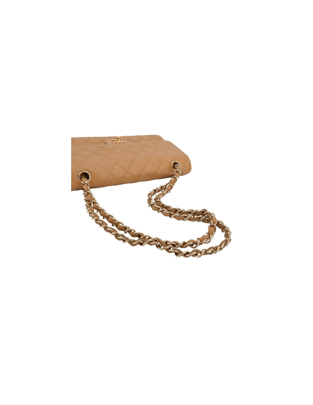 Features: ¨C Dark beige caviar leather with 24k gold-plated hardware ¨C Classic diamond quilting ¨C Timeless Chanel double flap style ¨C Single and double chain option Measurements: 25.5 x 16 x 7.5 cm Double-chain Drop: 23 cm Single-chain Drop: 44 cm