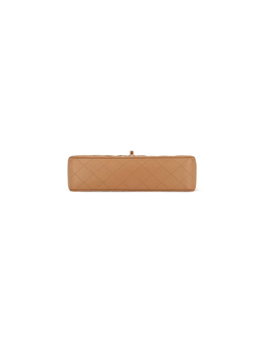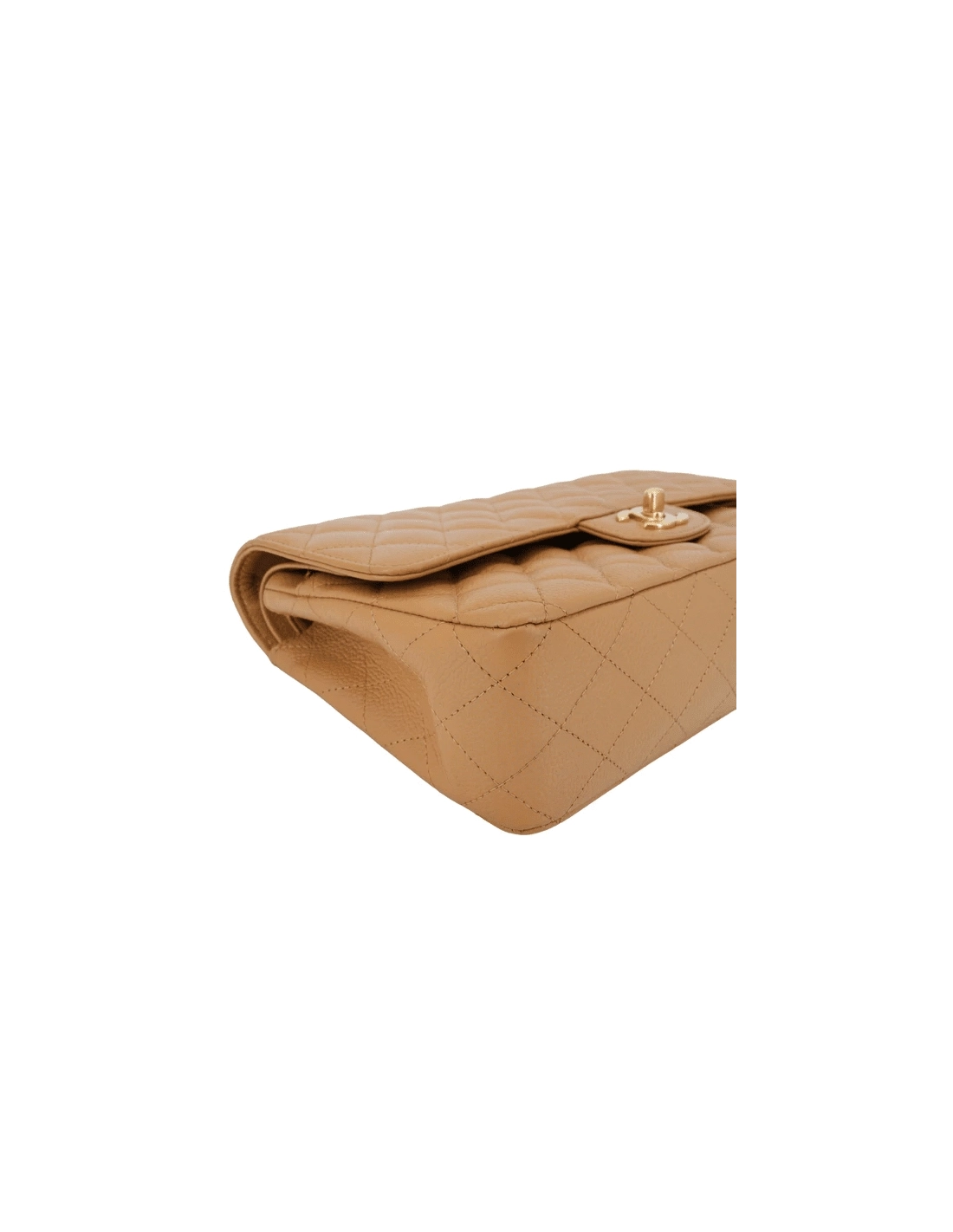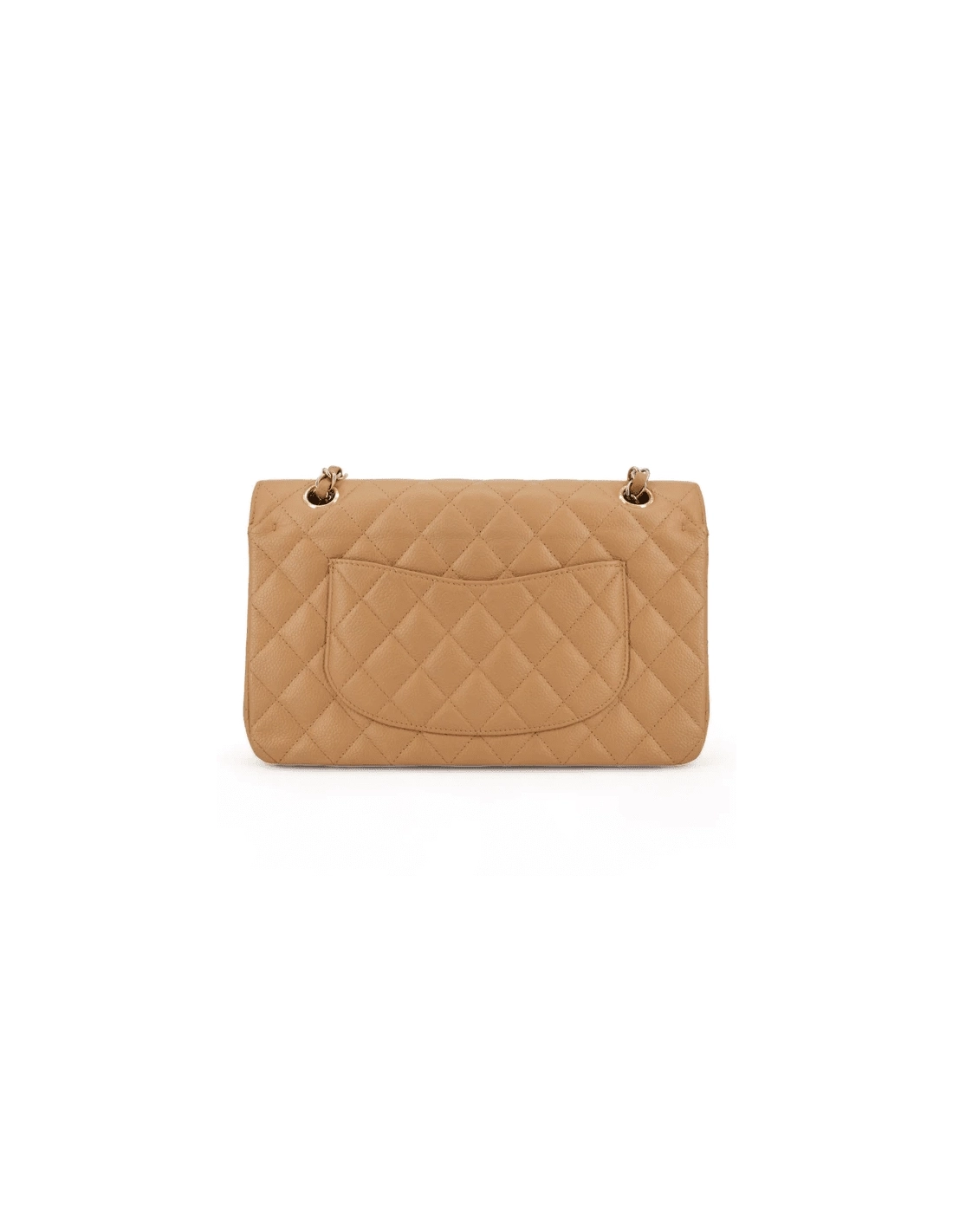 Features: ¨C Dark beige caviar leather with 24k gold-plated hardware ¨C Classic diamond quilting ¨C Timeless Chanel double flap style ¨C Single and double chain option Measurements: 25.5 x 16 x 7.5 cm Double-chain Drop: 23 cm Single-chain Drop: 44 cm