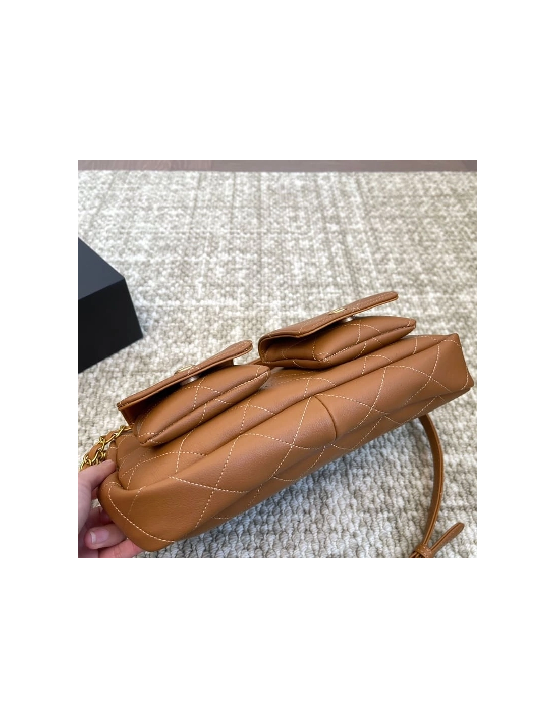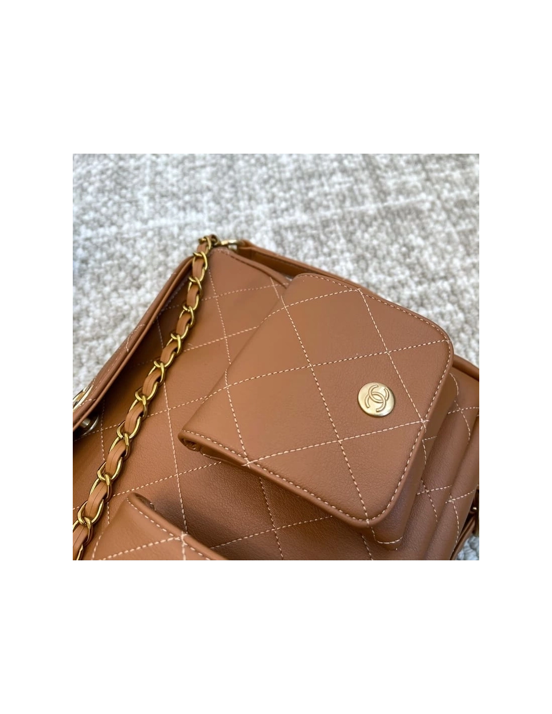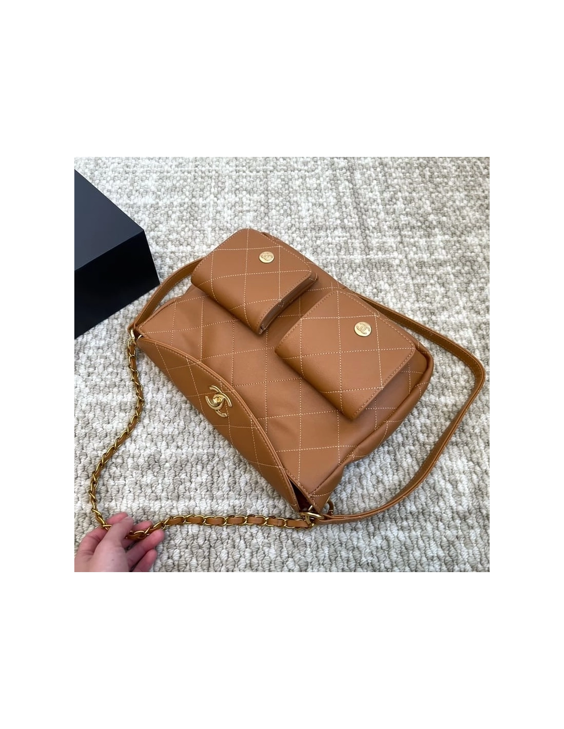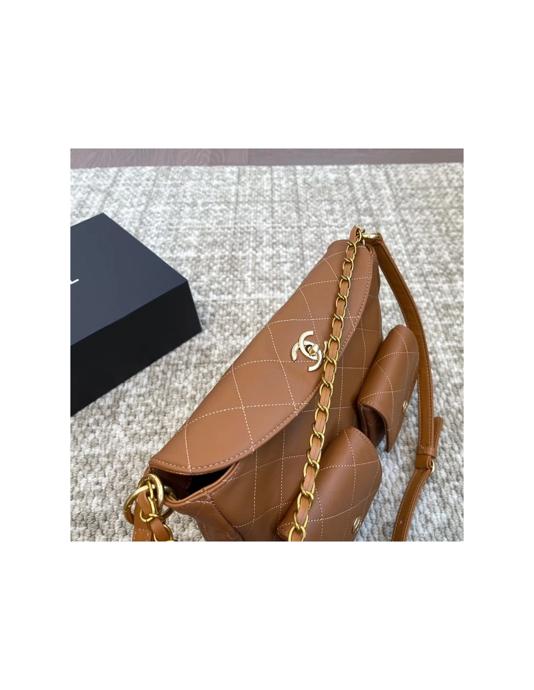 Chanel Double Pocket Hobo Bag Caramel Shiny Calfskin Brushed Gold Hardware