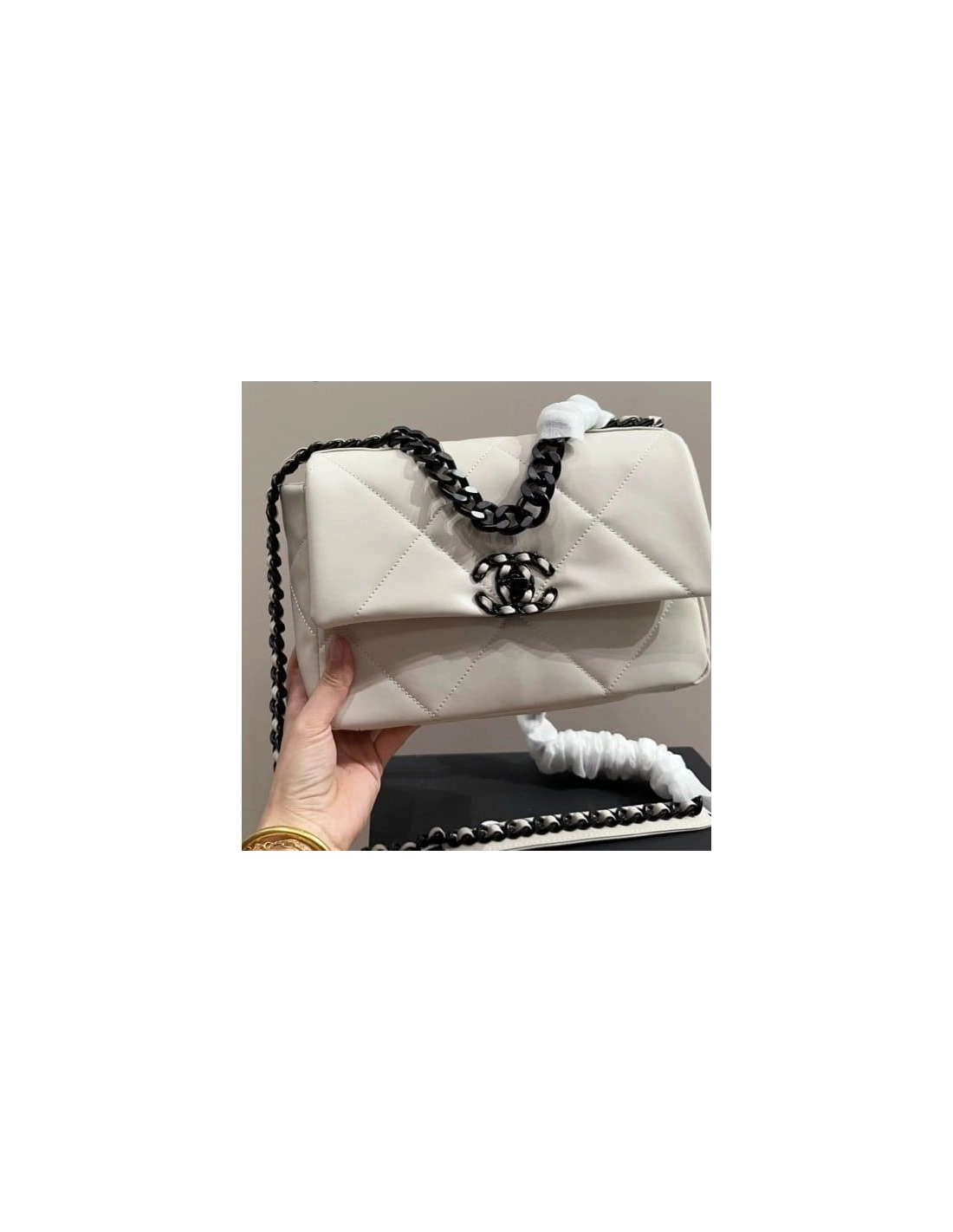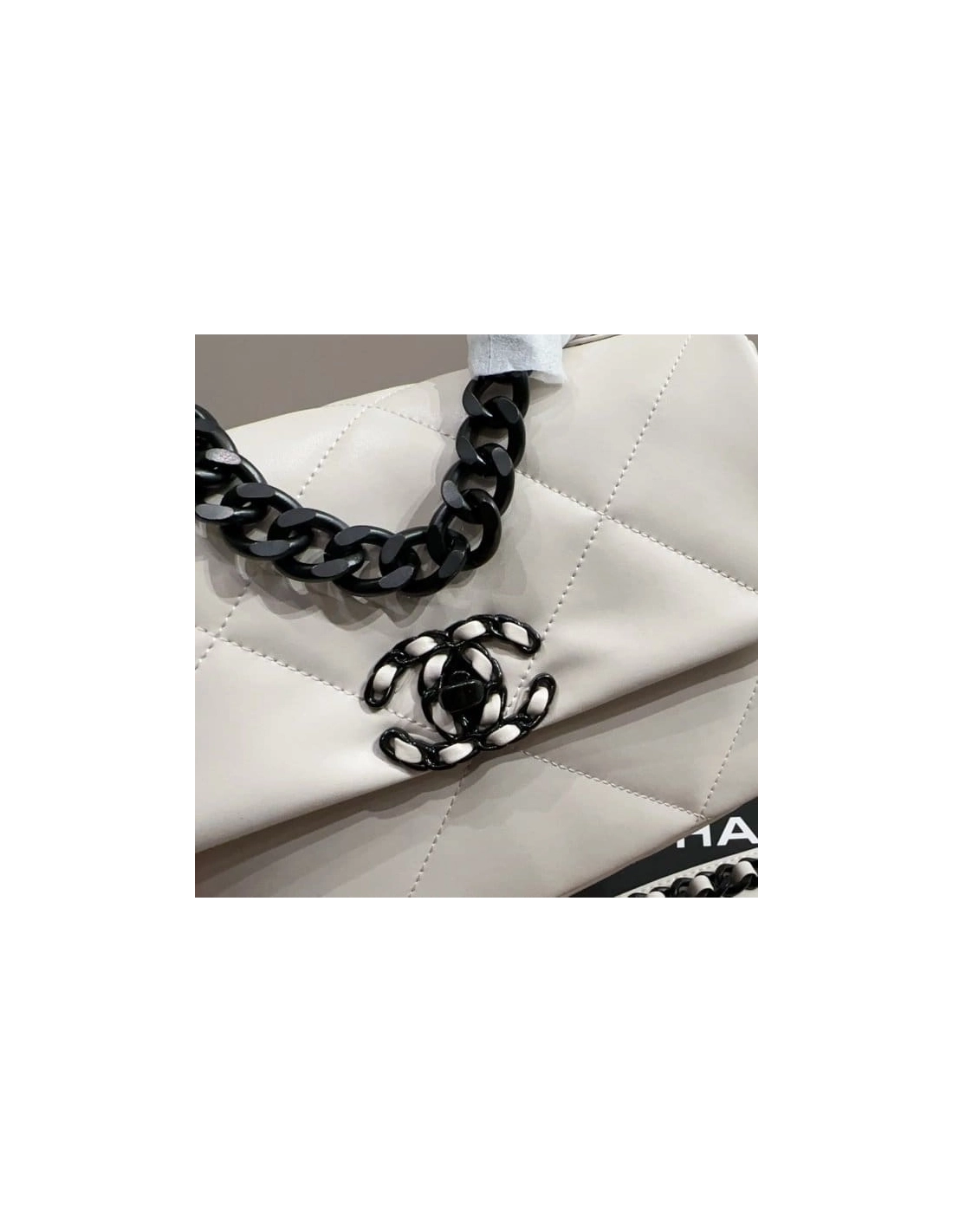 This is an authentic CHANEL Glossy Calfskin Quilted Medium Chanel 19 Flap in White and Black.?This pillowy soft shoulder bag is crafted of oversized quilted glossy calfskin leather in white. The refined bag features a black chain detail CC turn-lock on the flap, a magnetic snap pocket at the rear, and a leather threaded strap with a leather shoulder pad. The front flap opens to a black fabric interior with a zipper pocket.