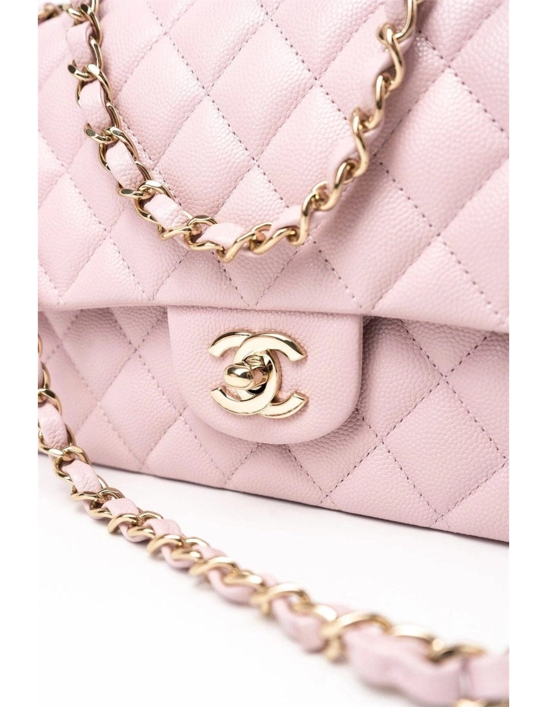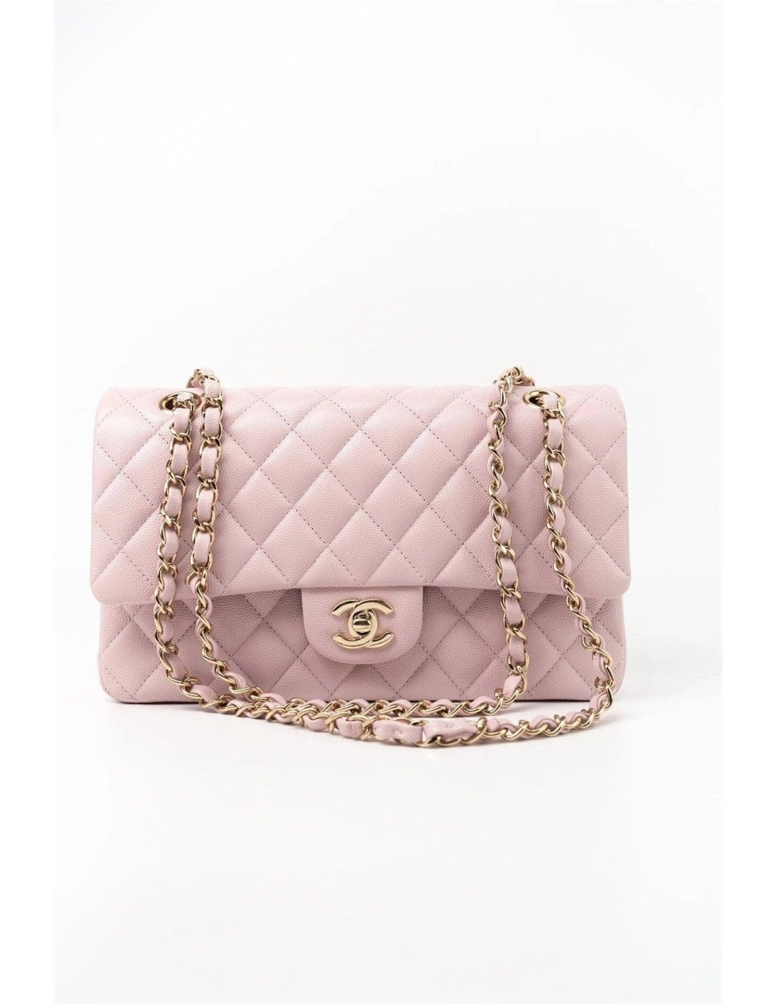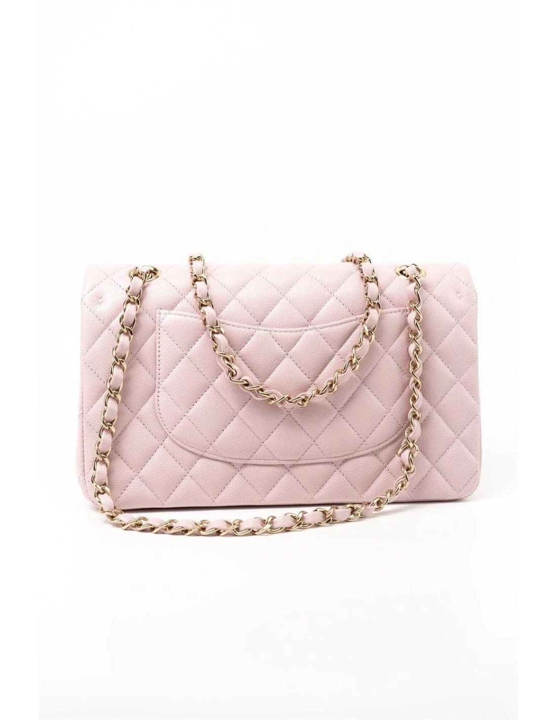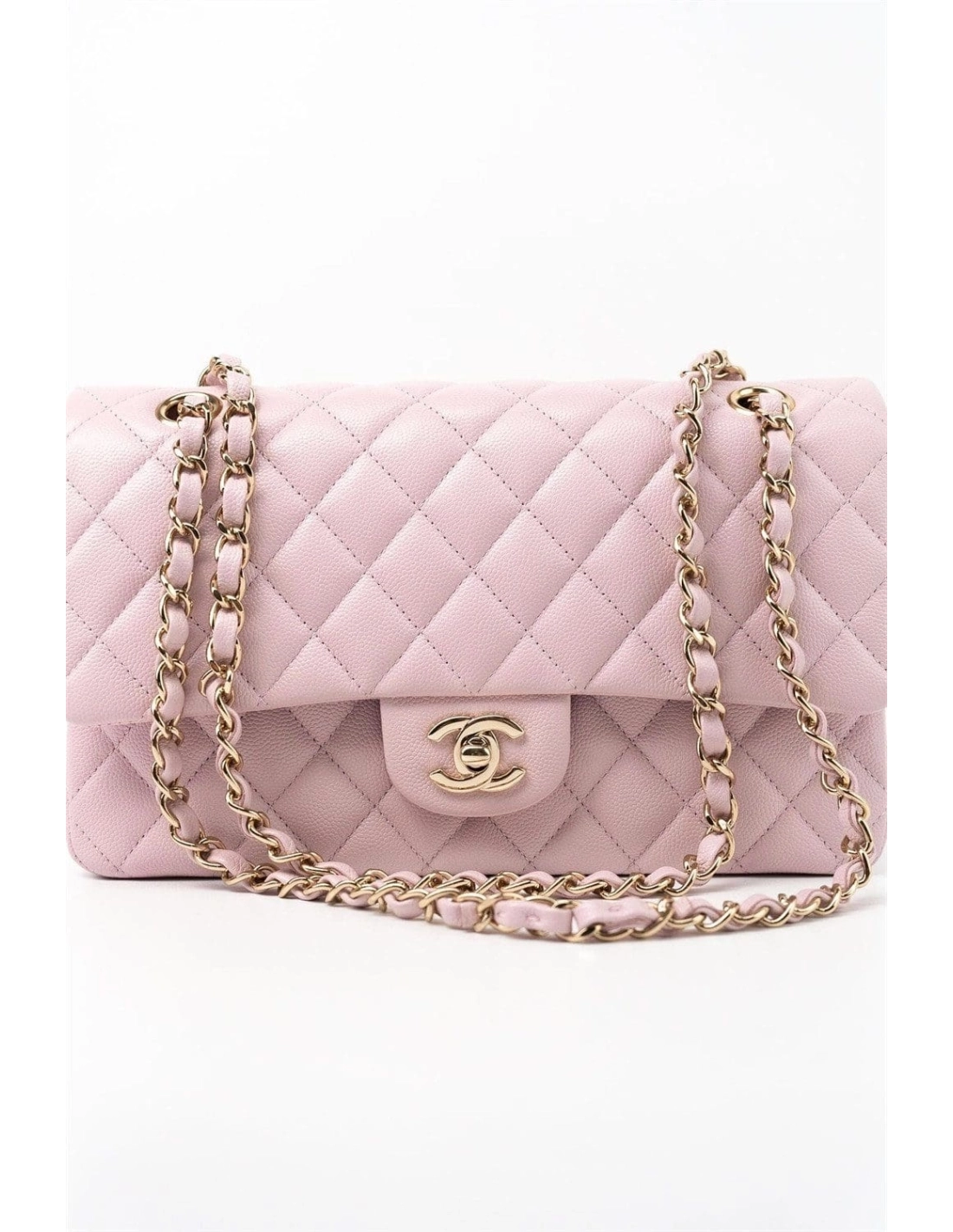 This Medium Classic Double Flap bag is in Light Pink caviar leather with light gold tone hardware and features a front flap with signature CC turnlock closure, half moon back pocket, and adjustable interwoven light gold tone chain link and light pink leather shoulder strap.