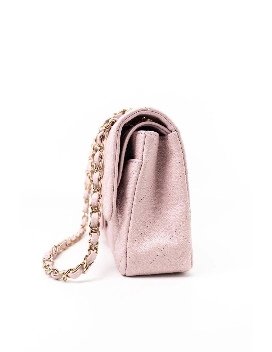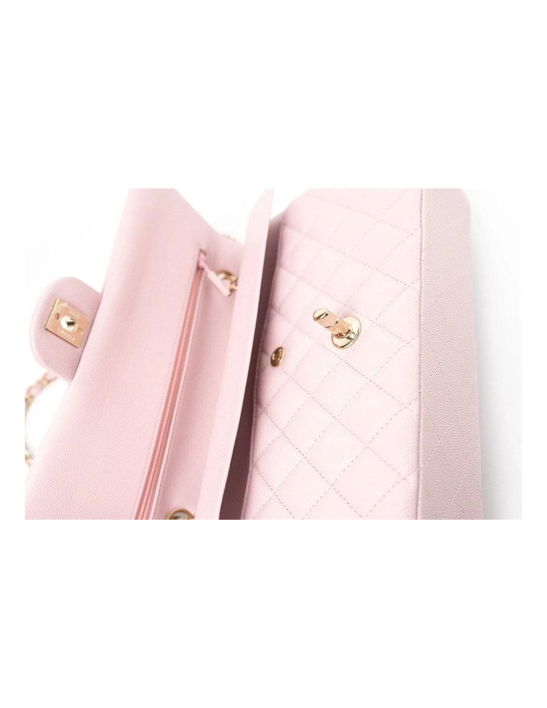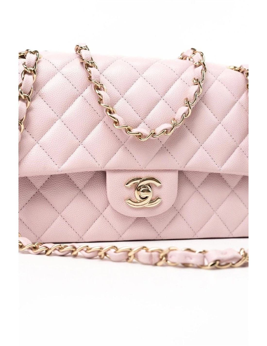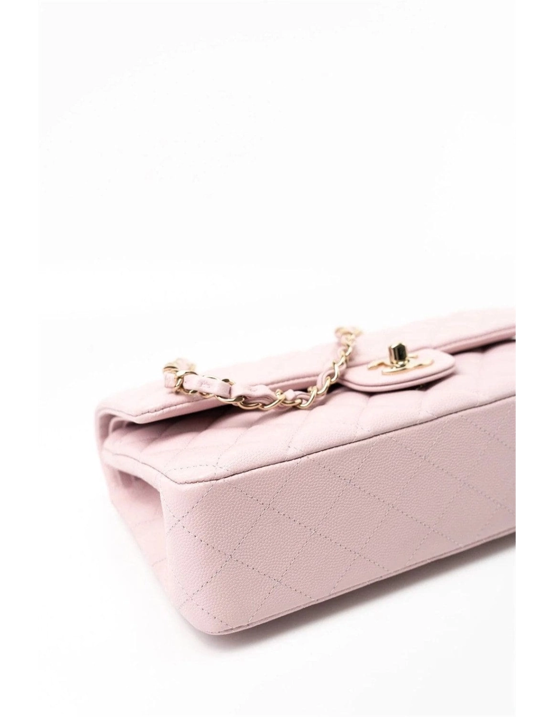 This Medium Classic Double Flap bag is in Light Pink caviar leather with light gold tone hardware and features a front flap with signature CC turnlock closure, half moon back pocket, and adjustable interwoven light gold tone chain link and light pink leather shoulder strap.