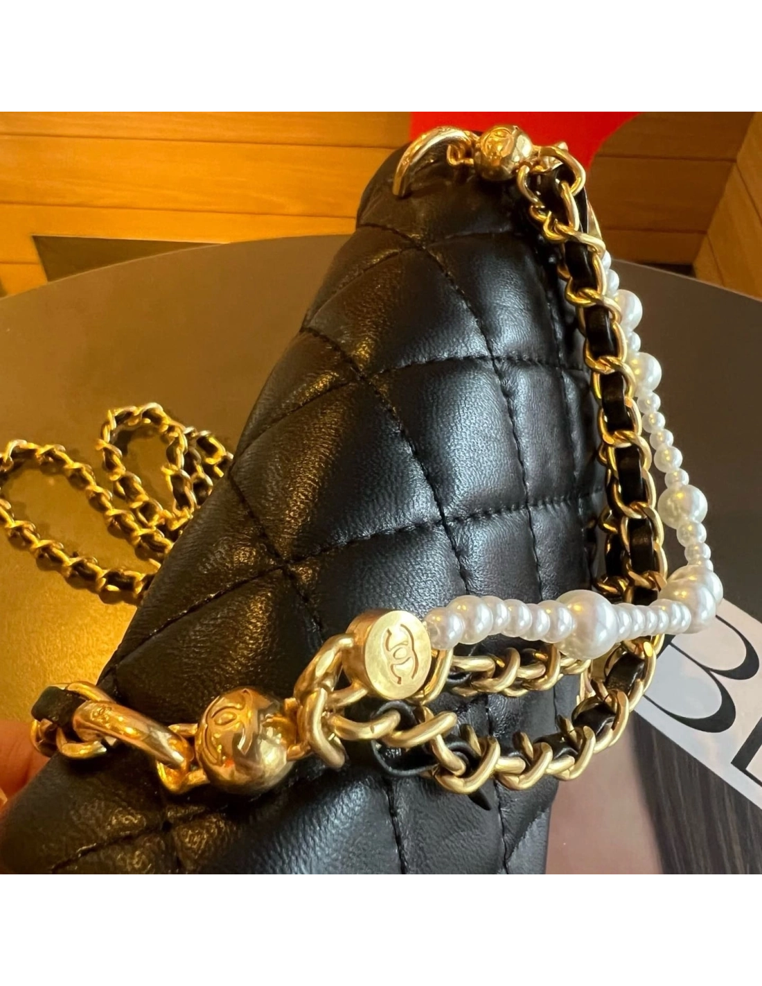 This Mini Square Pearl Crush Flap Bag is of black lambskin leather with brushed gold tone hardware. It has a front flap with signature CC turnlock closure, tonal stitching, rear half moon pocket, a single interwoven black leather and brushed gold tone chain link shoulder/crossbody strap and faux pearl top handle strap.