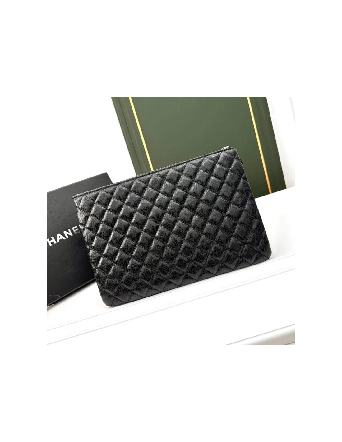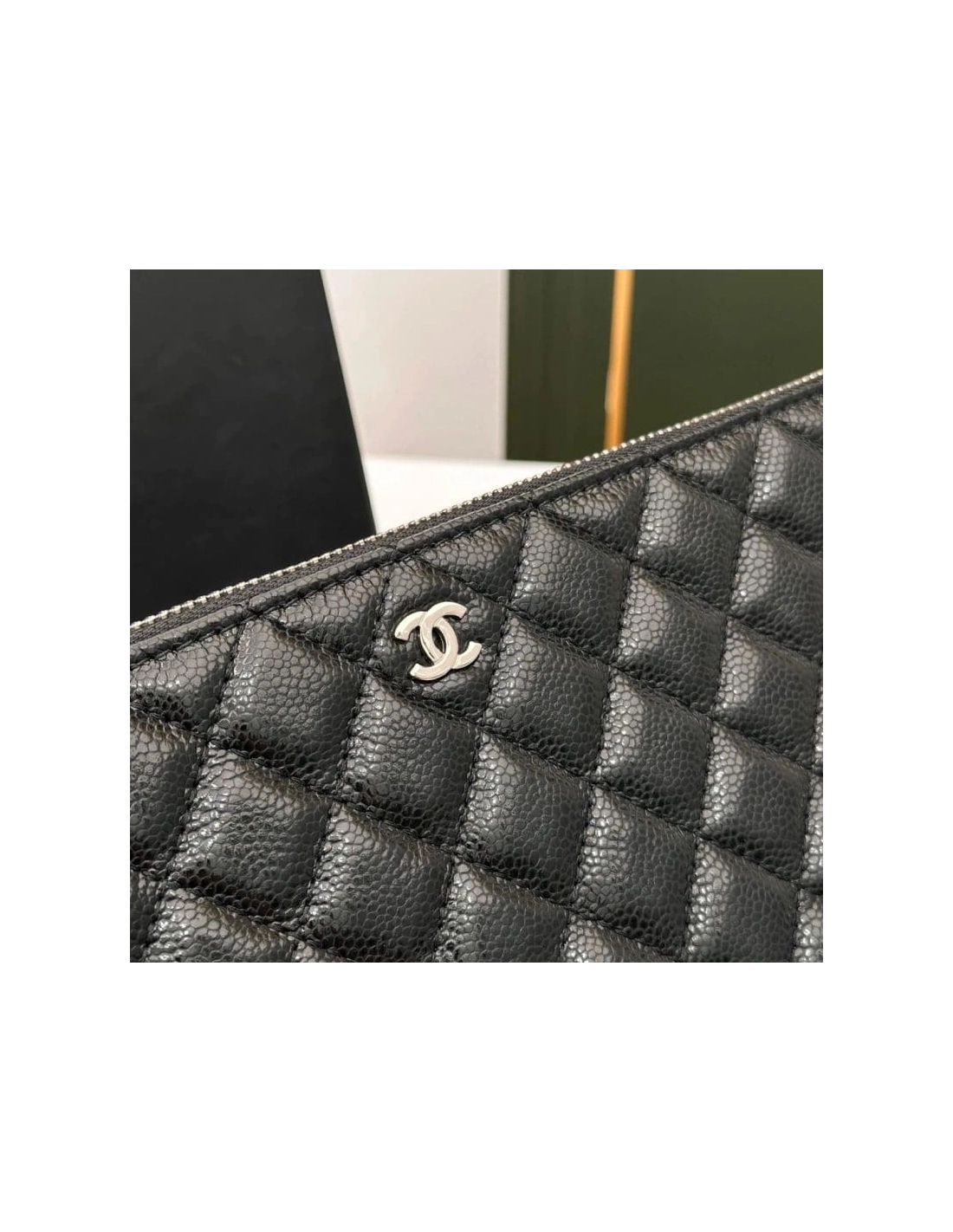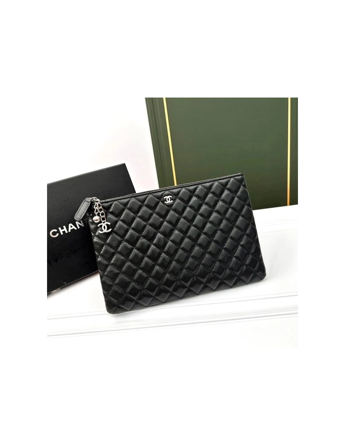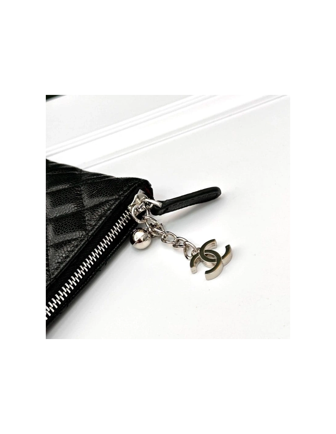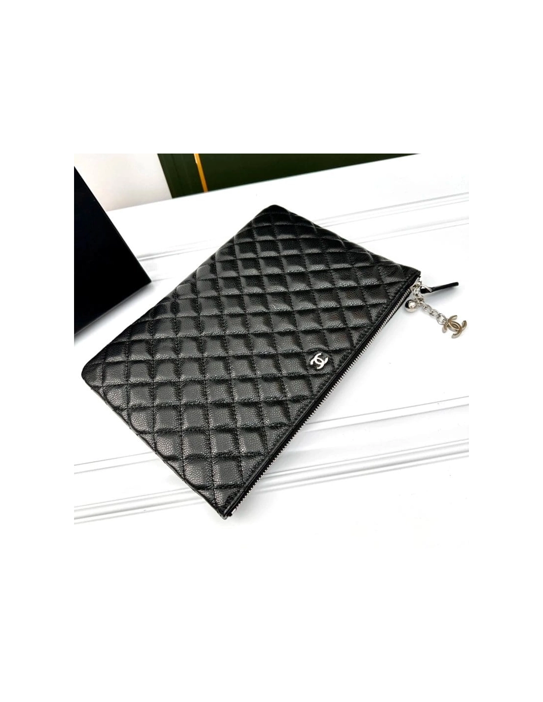 This is an CHANEL Caviar Quilted Large Cosmetic Case in Black. This stylish large cosmetic pouch is crafted of shiny diamond quilted caviar leather in black with a small ruthenium Chanel CC embellishment at the top. The top zipper opens to a spacious burgundy nylon interior.