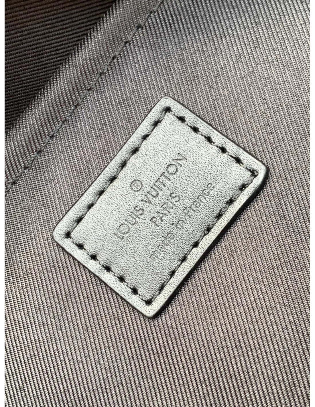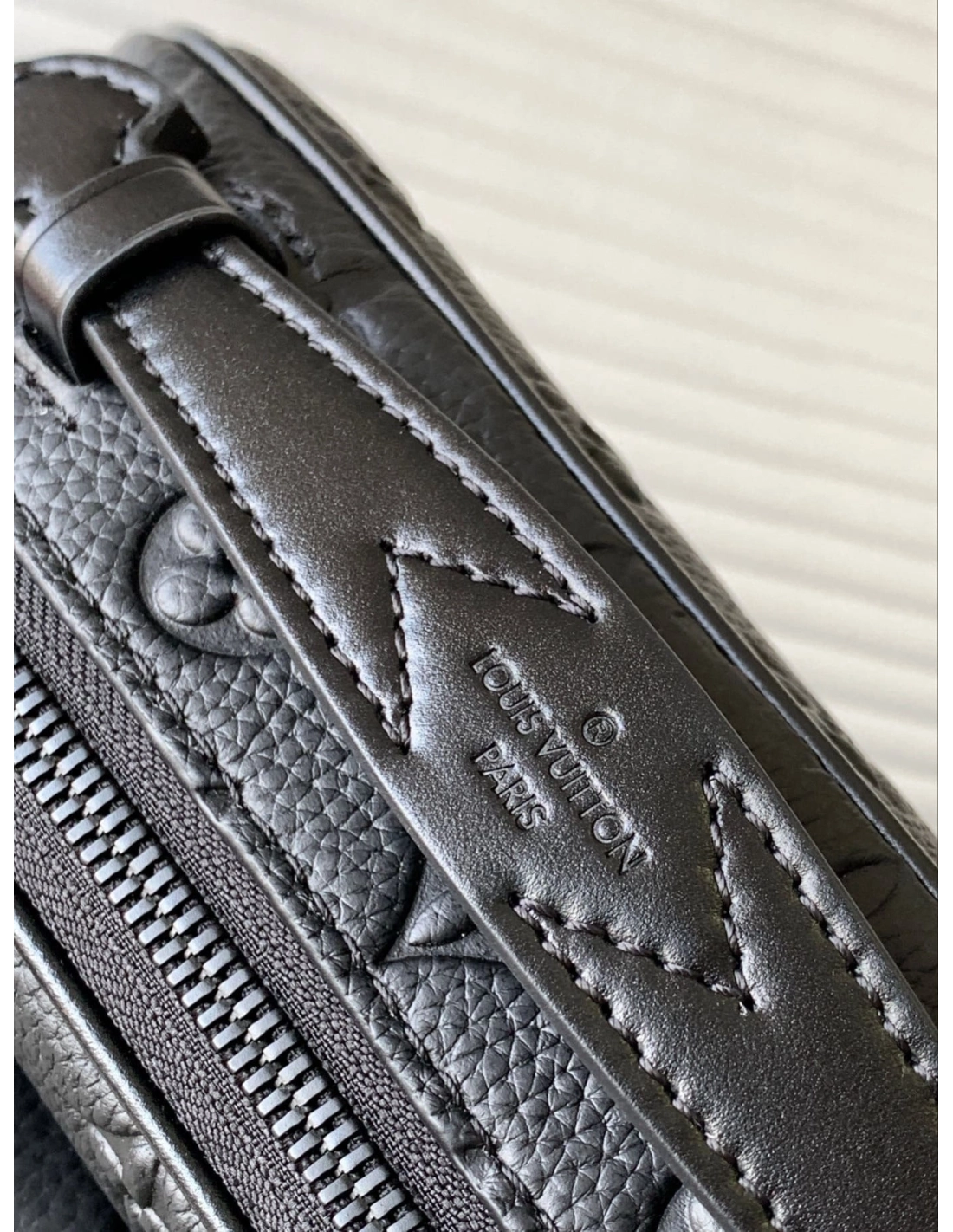 V stitching and embossed signature on the leather handle