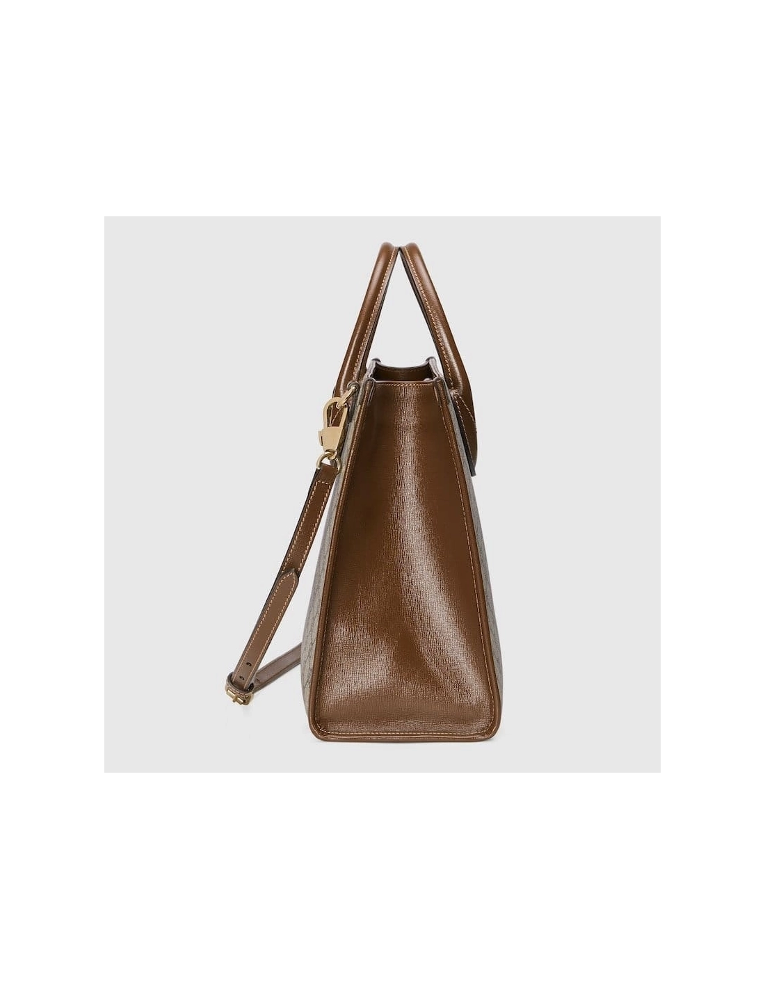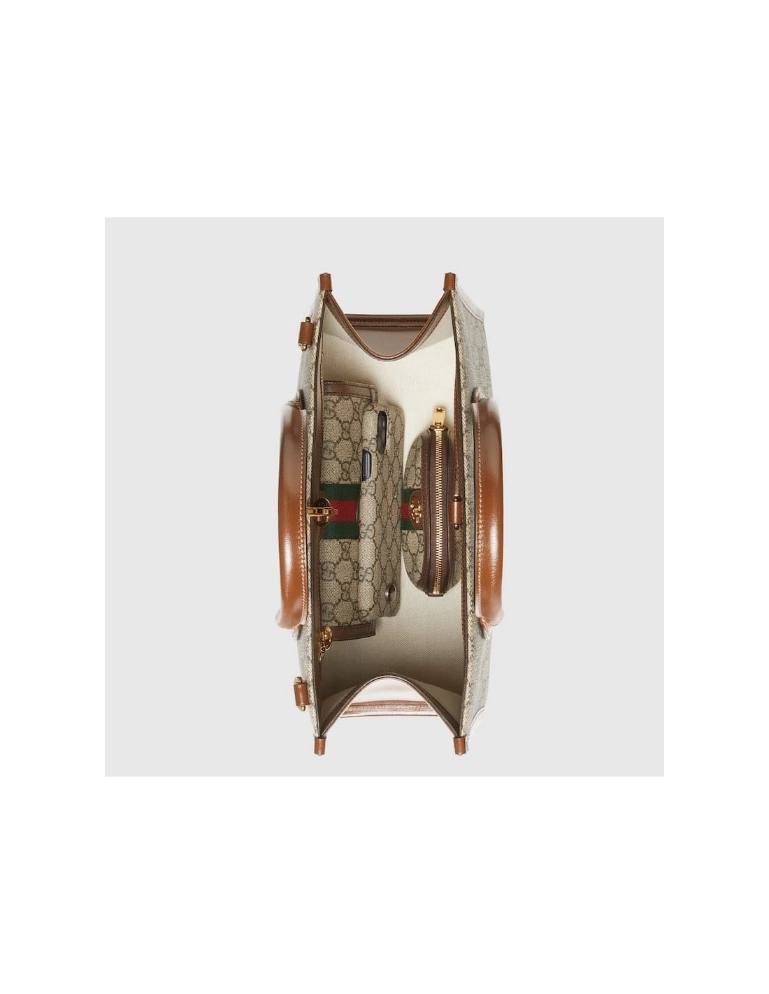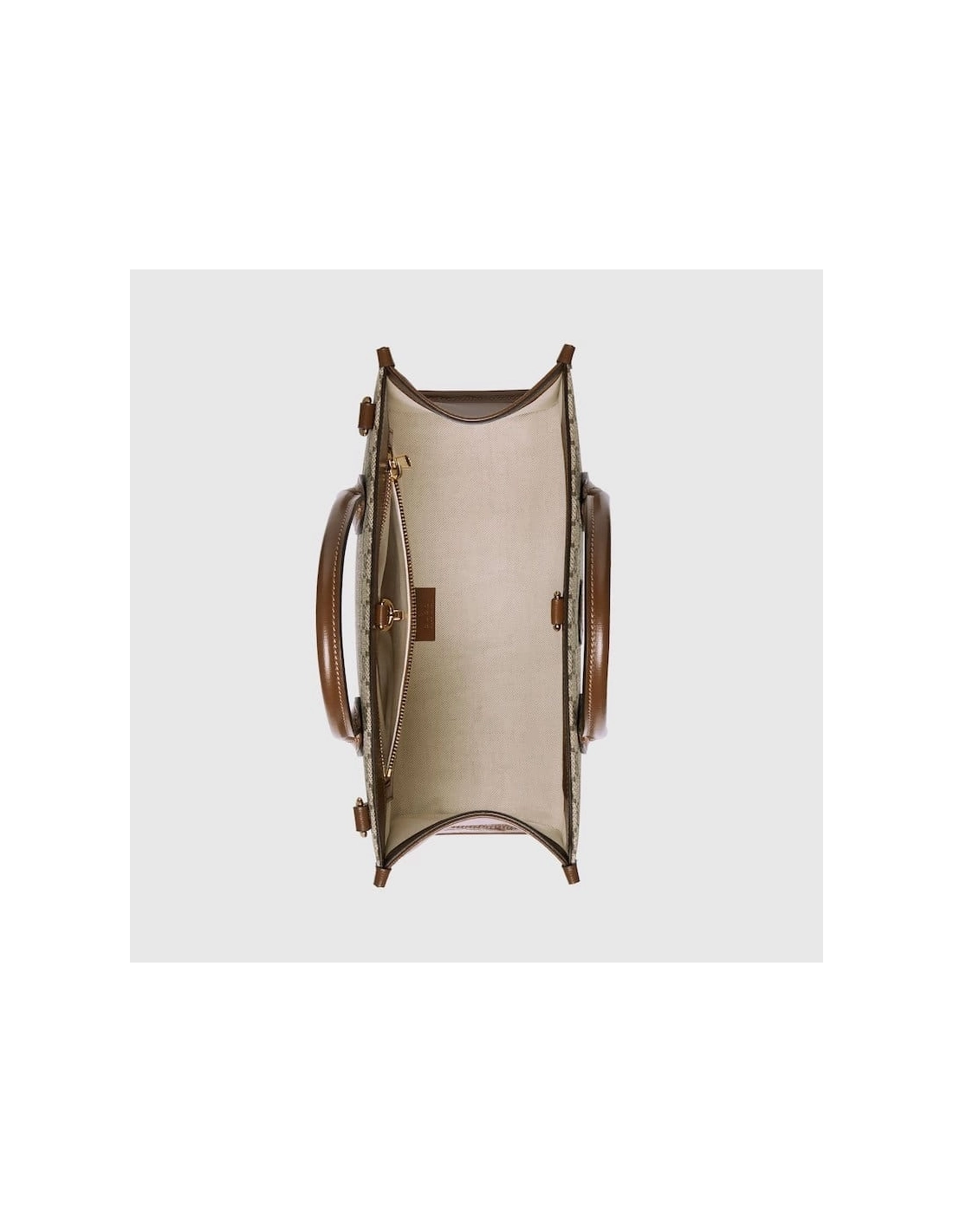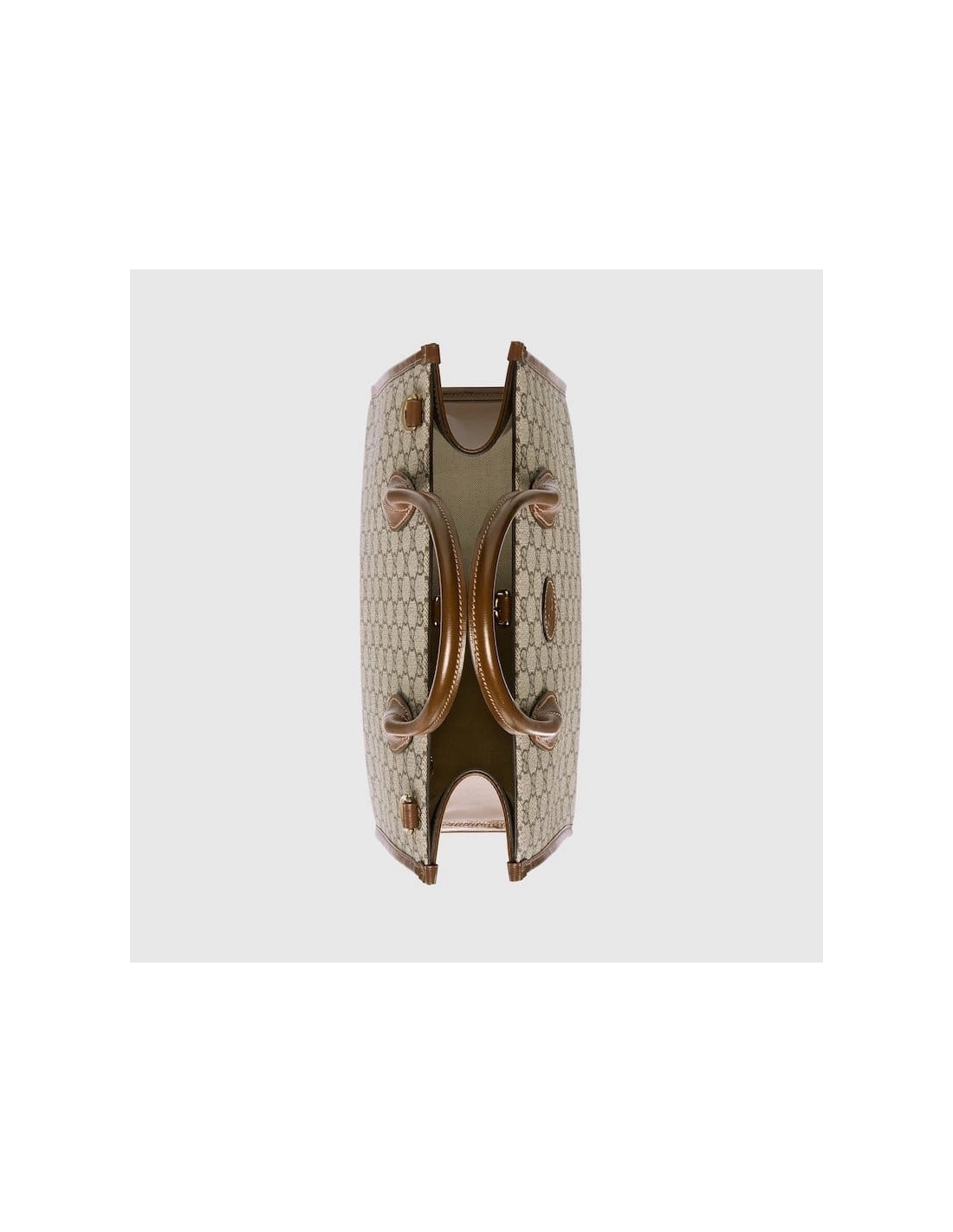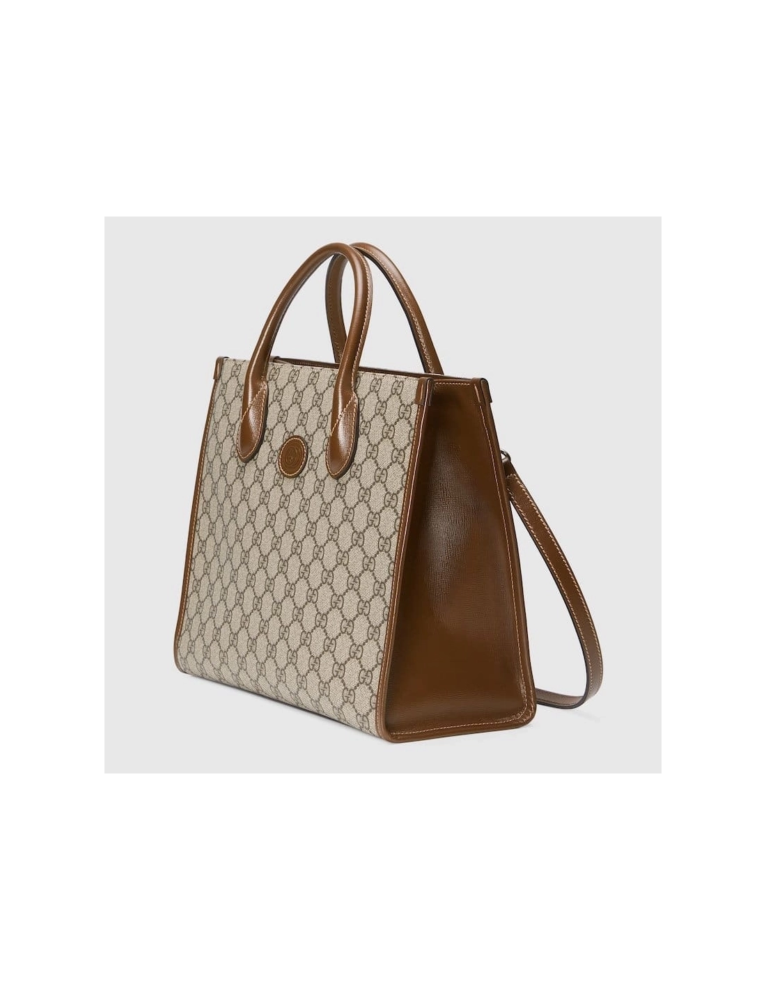 Designed in a structured shape, this small tote bag is crafted from GG Supreme canvas with brown leather trim, the small size double-handled silhouette has a top handle and shoulder strap.