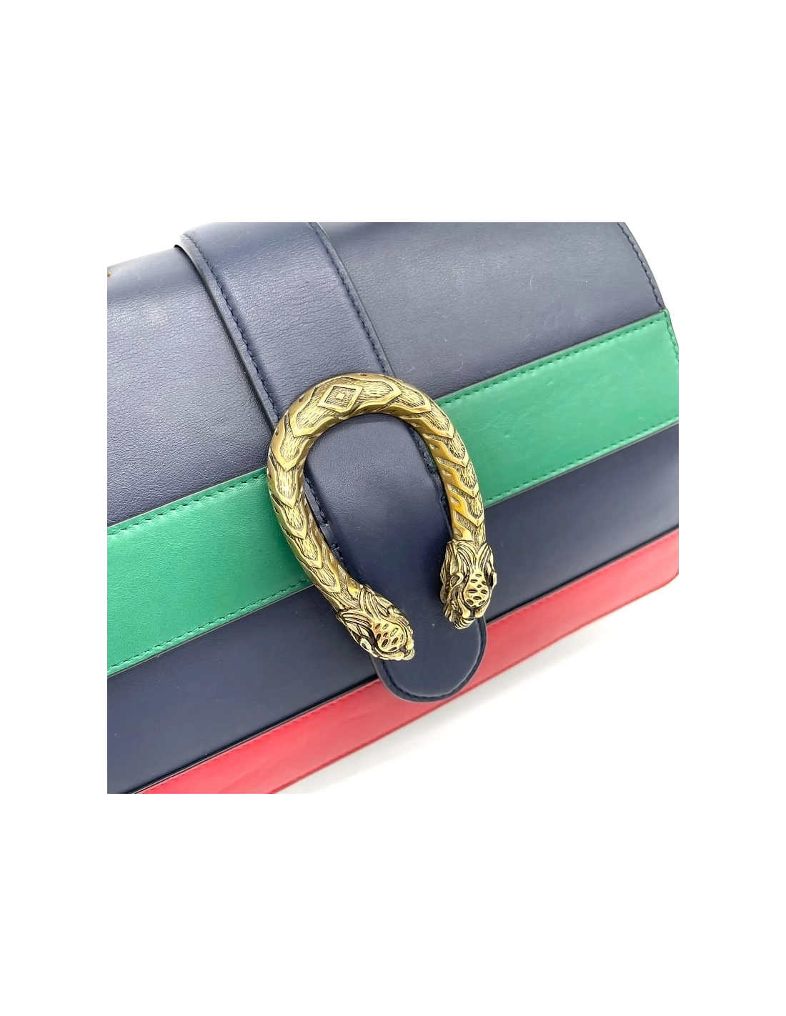 This bag is crafted of black with green and red calfskin leather and aged gold hardware. The flap opens to a beige fabric interior.