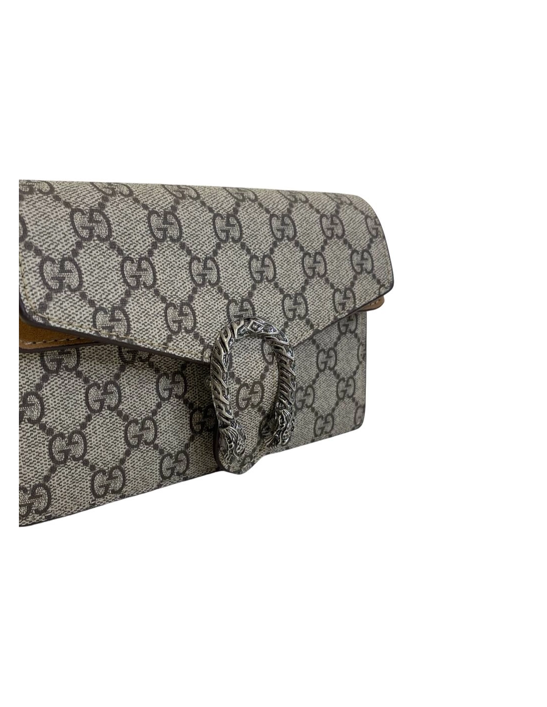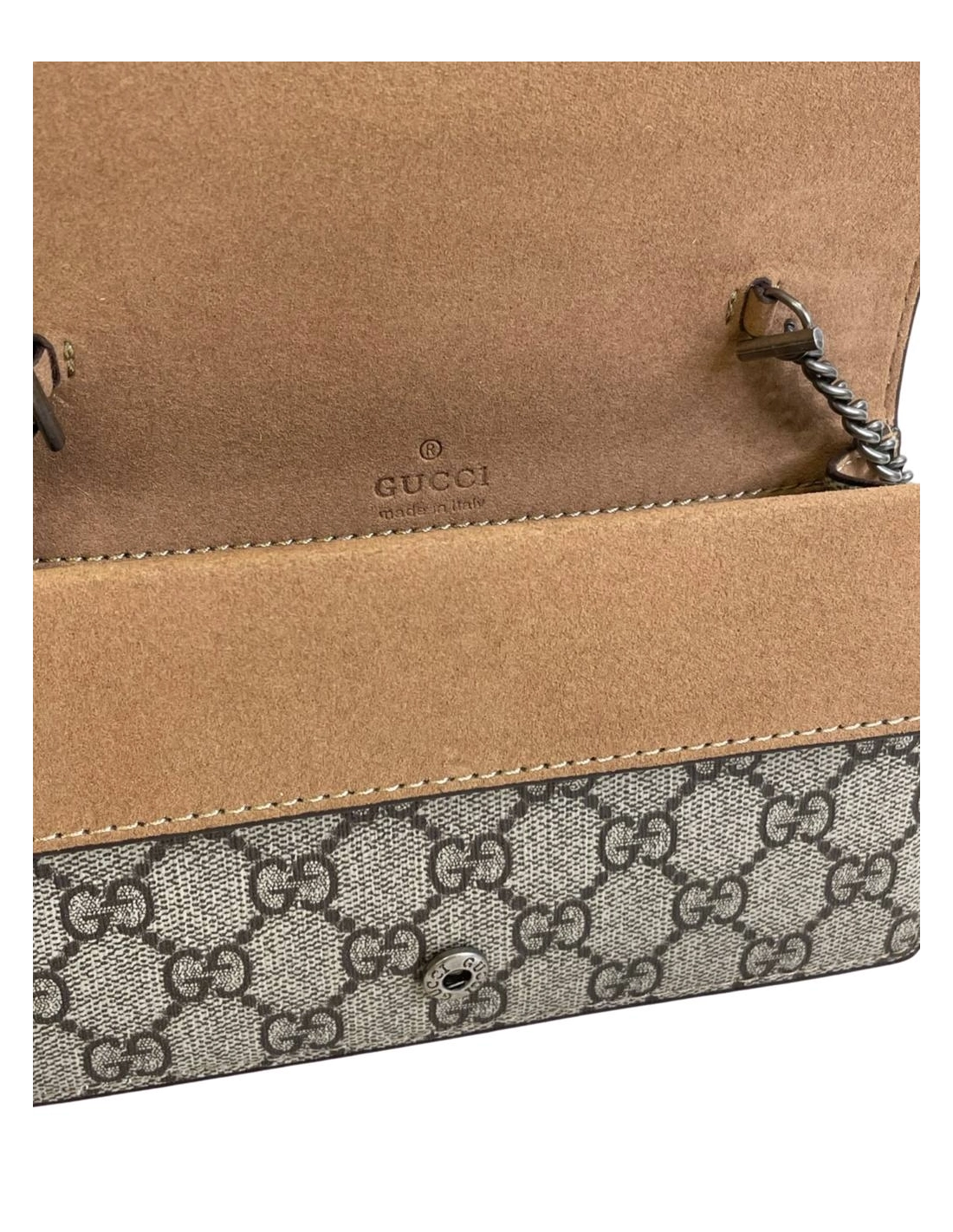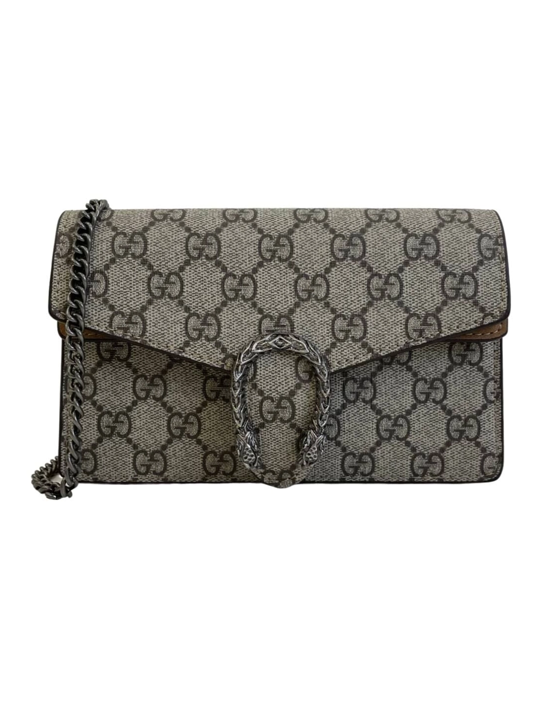 Dionysus Gucci Supreme Super?Large Bag GG Supreme canvas, made using an earth-conscious process, with taupe suede detail. Tiger head. Palladium-toned hardware. Attached key ring that can attach to a separate bag. Chain shoulder strap. Pin closure with side release. Size: 28 x 18cm.
