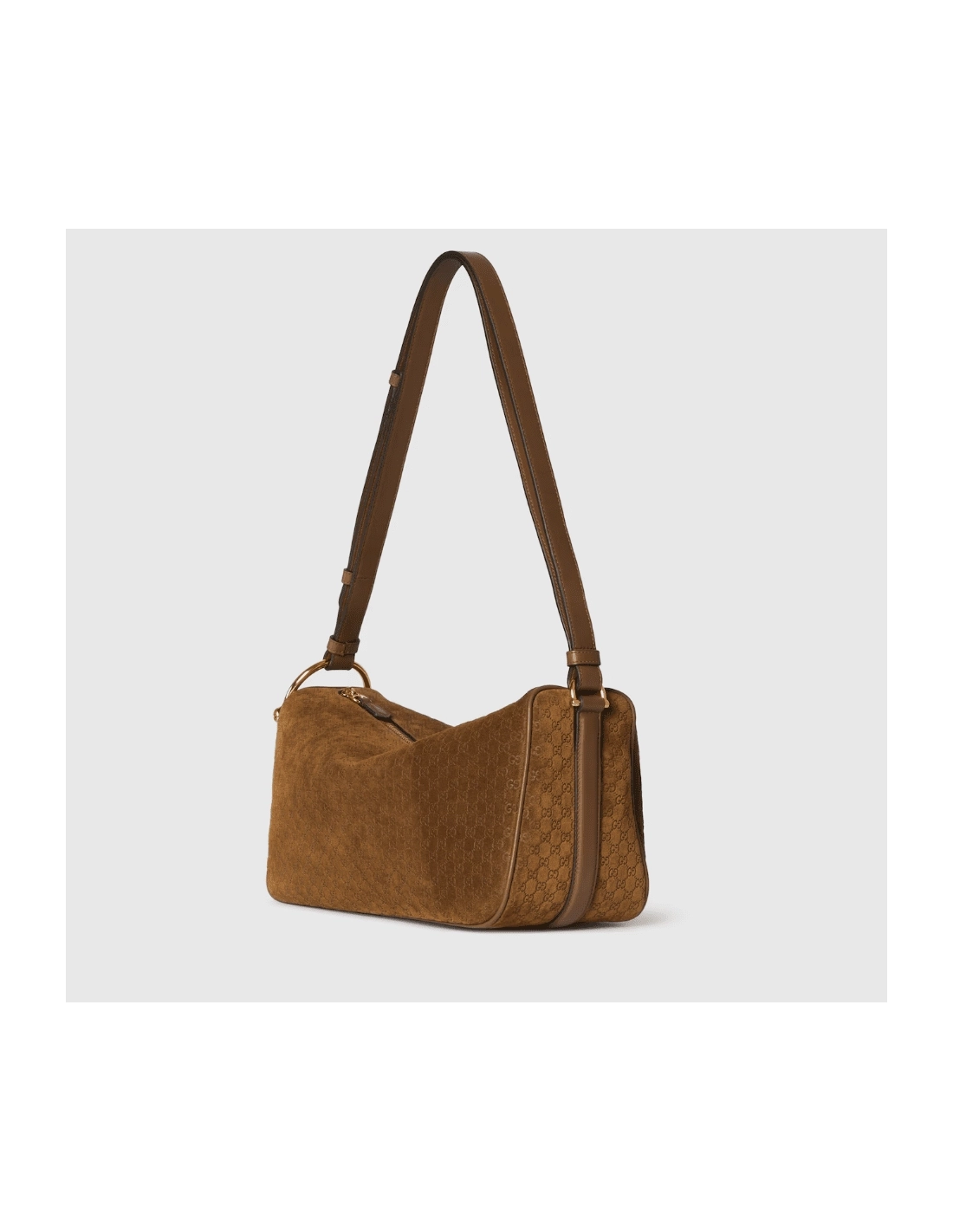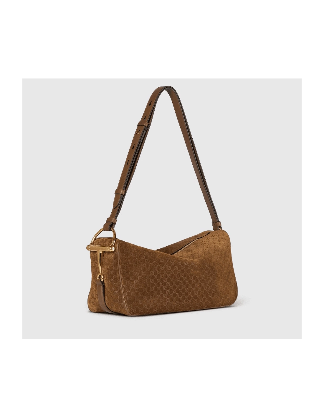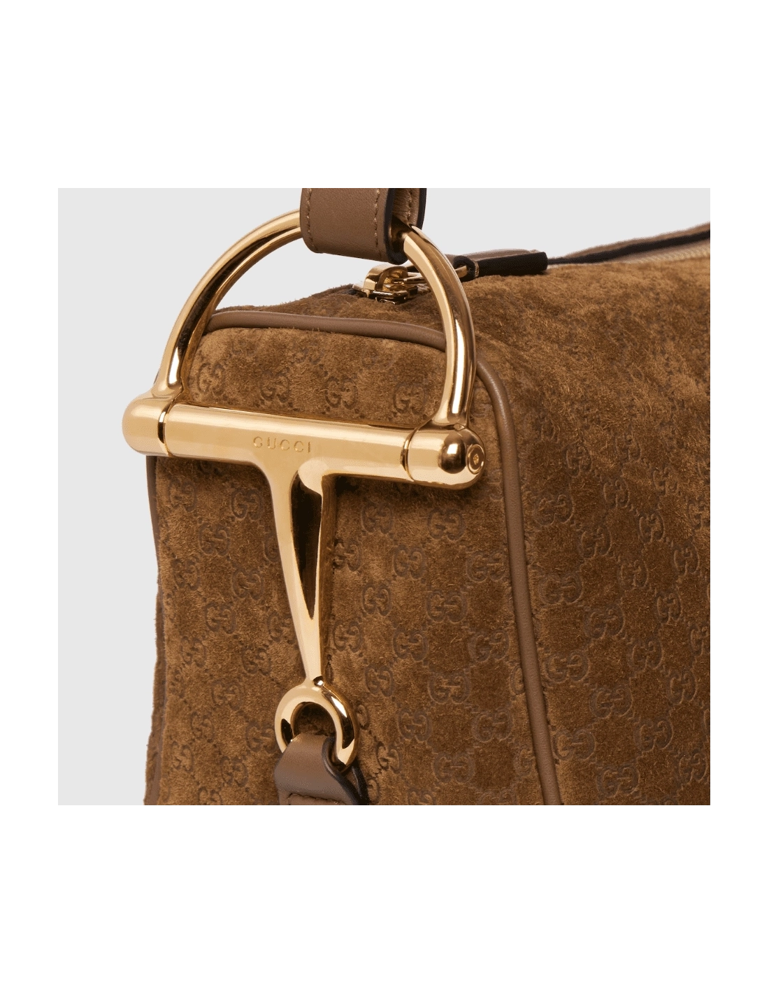Brown embossed GG suede Gold-toned hardware Brown cotton linen lining Half Horsebit Inside: 1 open pocket Adjustable leather shoulder strap drop 12.6 ¨C 13.4; length: 26 ¨C 28.7 Zip closure 12.4W x 6.7H x 4.7D Weight: 1.5lbs approximately Fits iPhone Pro Max/Plus, Airpods, long wallet, and lipstick