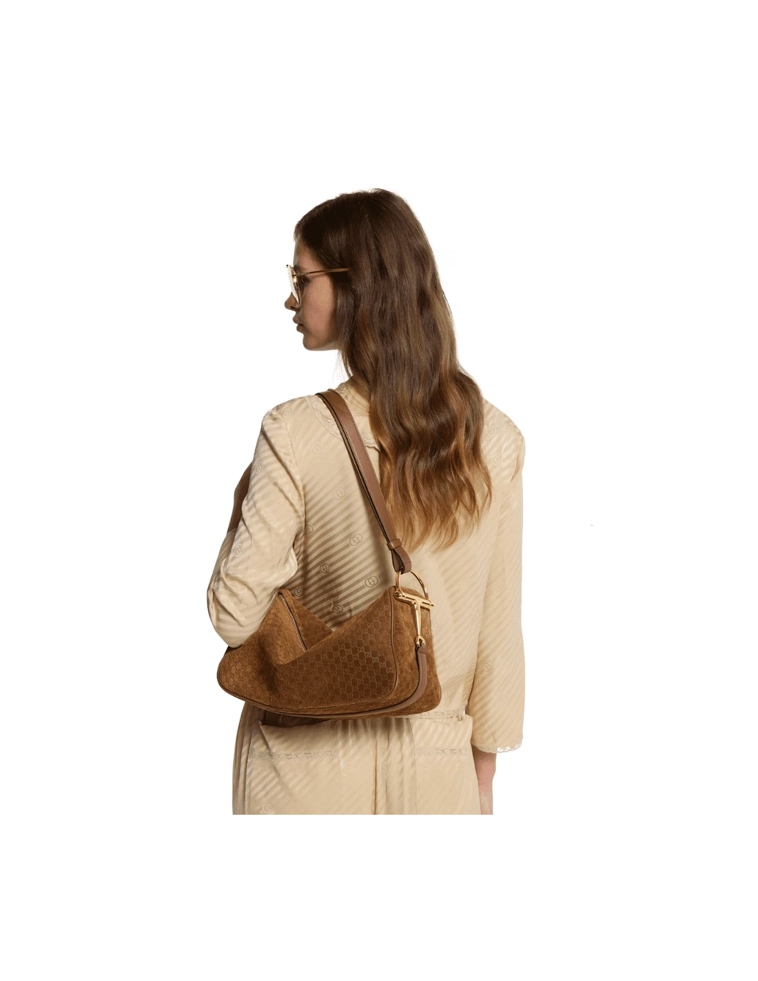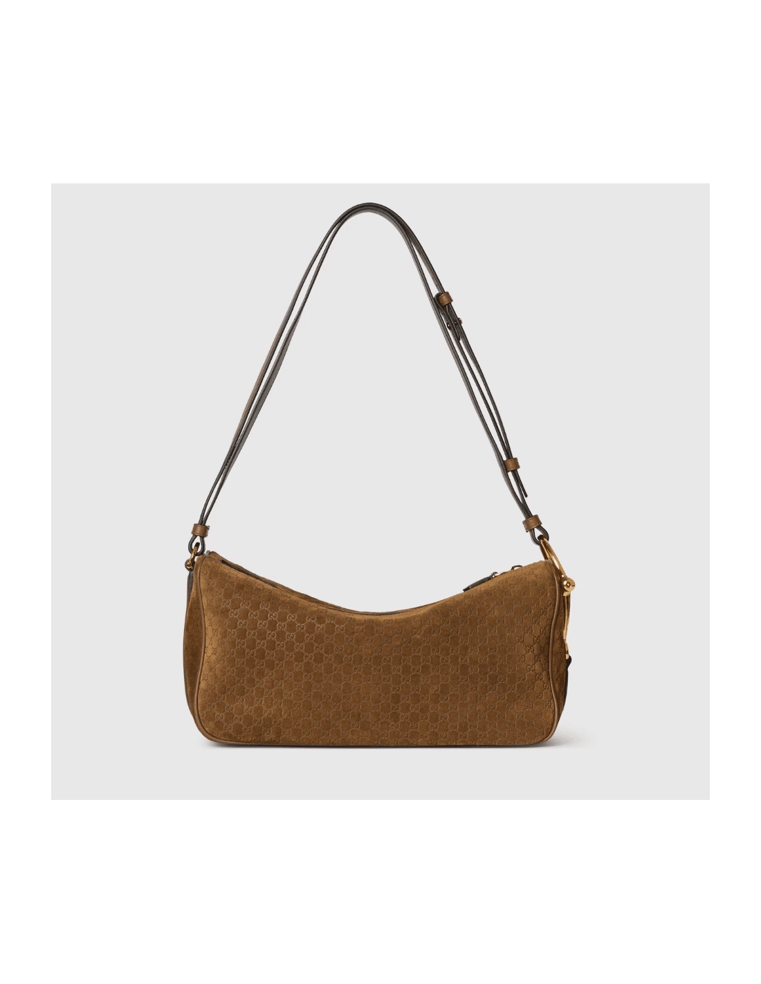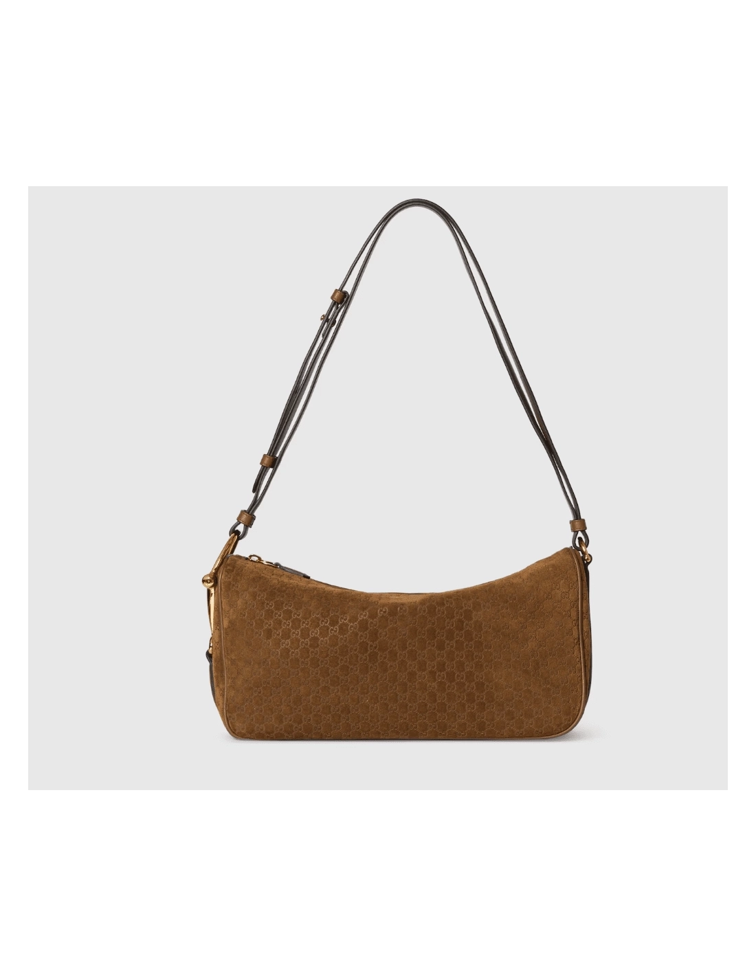 Brown embossed GG suede Gold-toned hardware Brown cotton linen lining Half Horsebit Inside: 1 open pocket Adjustable leather shoulder strap drop 12.6 ¨C 13.4; length: 26 ¨C 28.7 Zip closure 12.4W x 6.7H x 4.7D Weight: 1.5lbs approximately Fits iPhone Pro Max/Plus, Airpods, long wallet, and lipstick