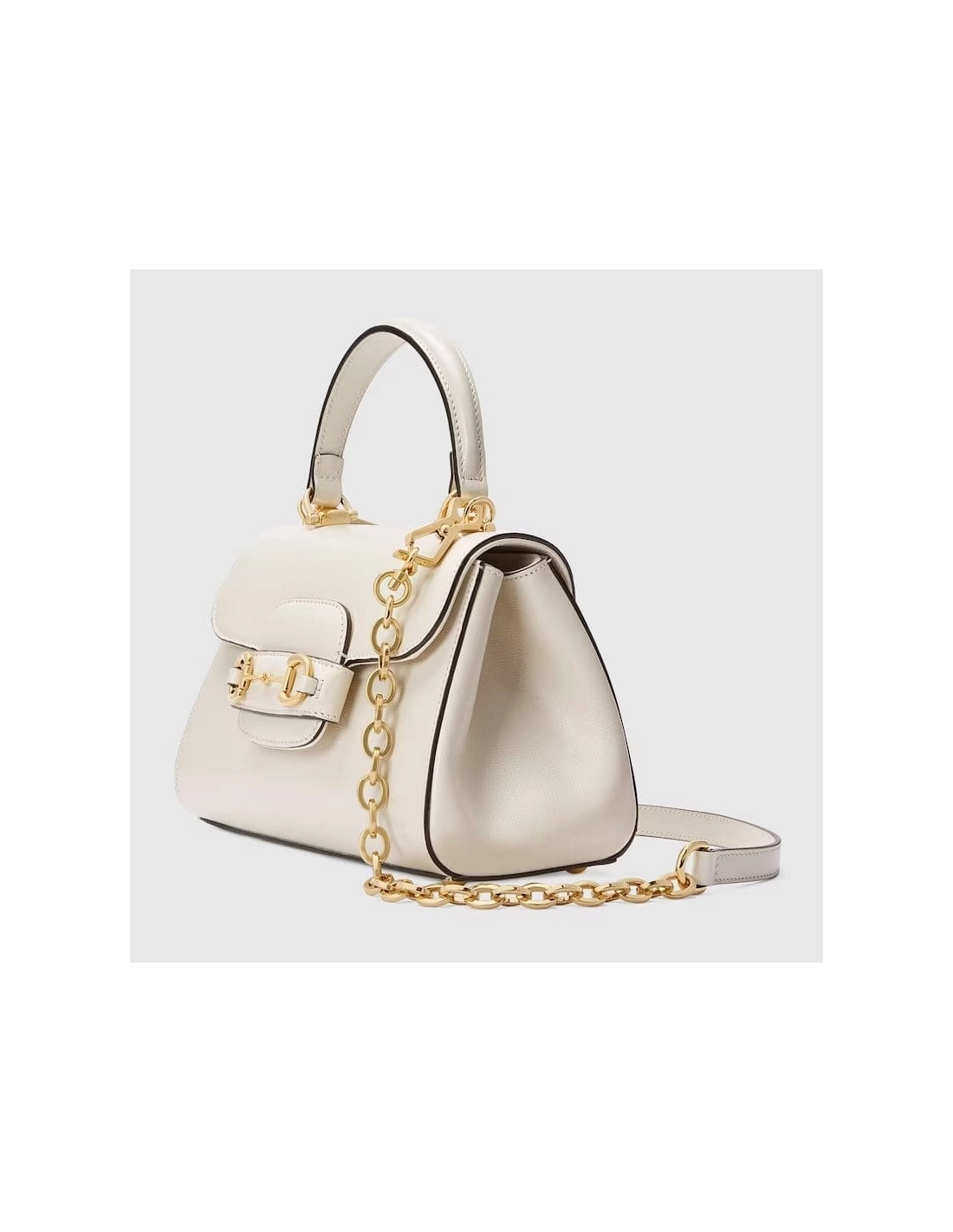 The Gucci Horsebit 1955 is presented as a top handle bag in white leather. The collection unifies details first introduced on the original bag that inspired the line from over six decades ago with a modern spirit, highlighting the Horsebit. Part of Guccis genetic code, the double ring and bar design has been established as one of the most distinctive elements among the House symbols borrowed from the equestrian world.