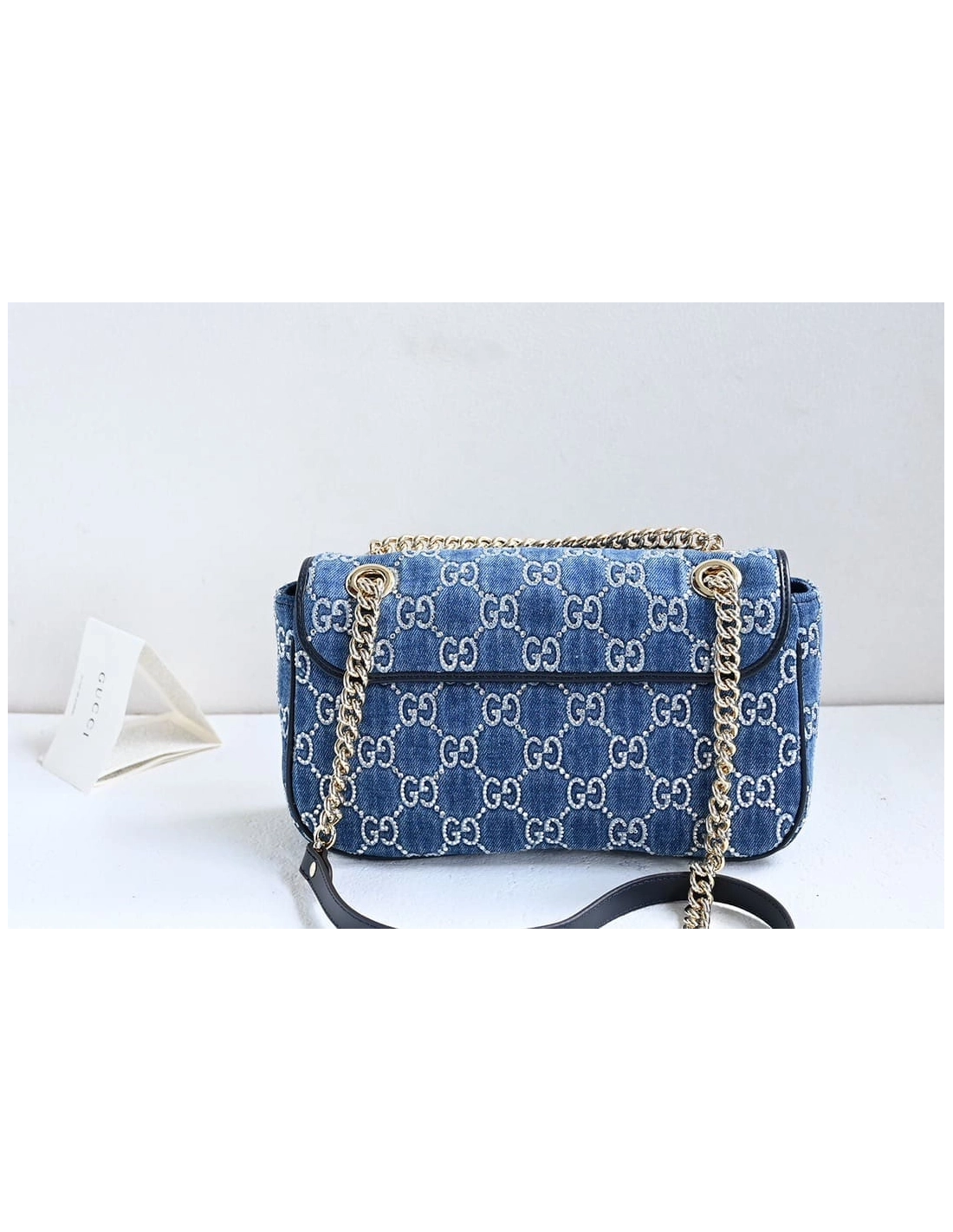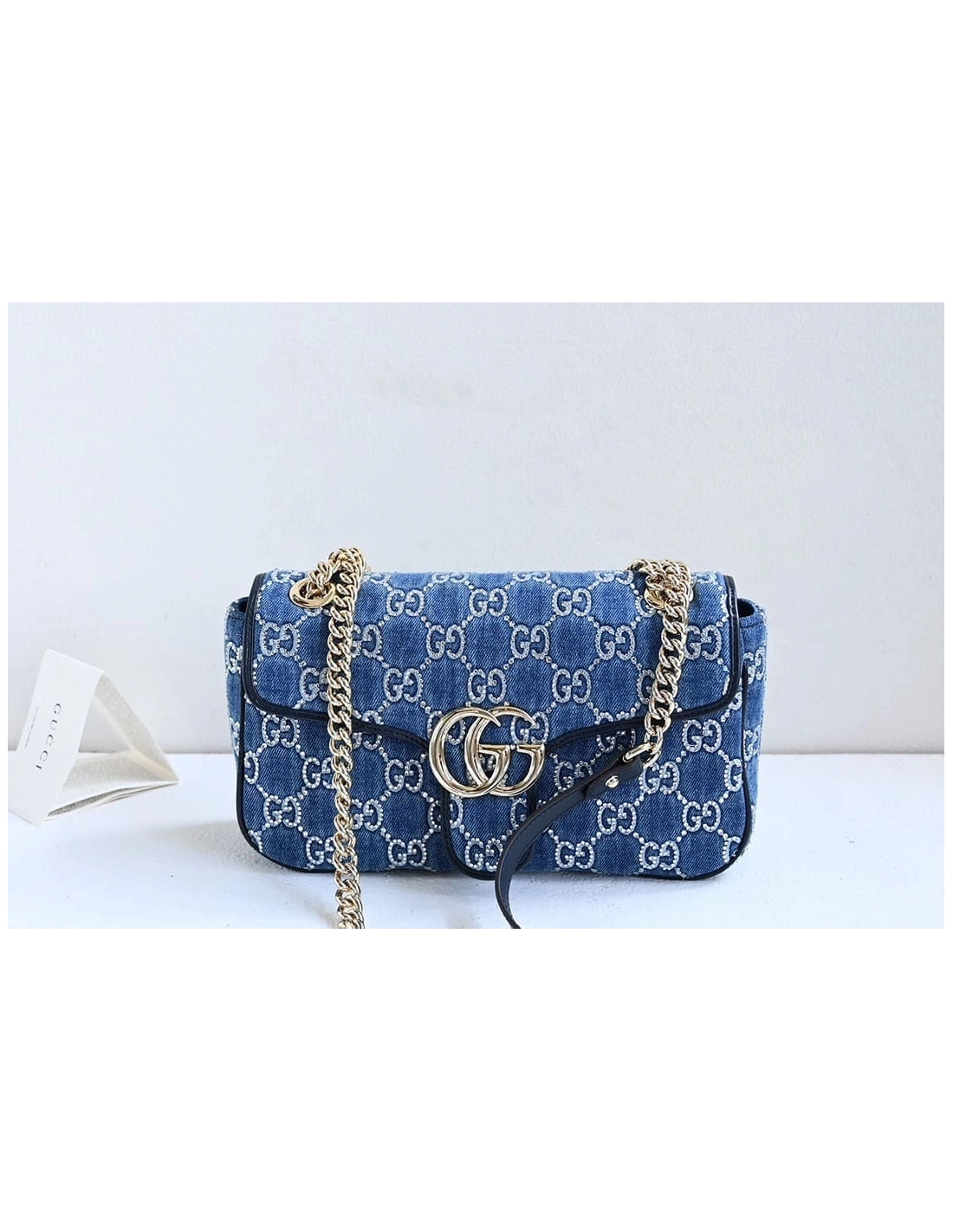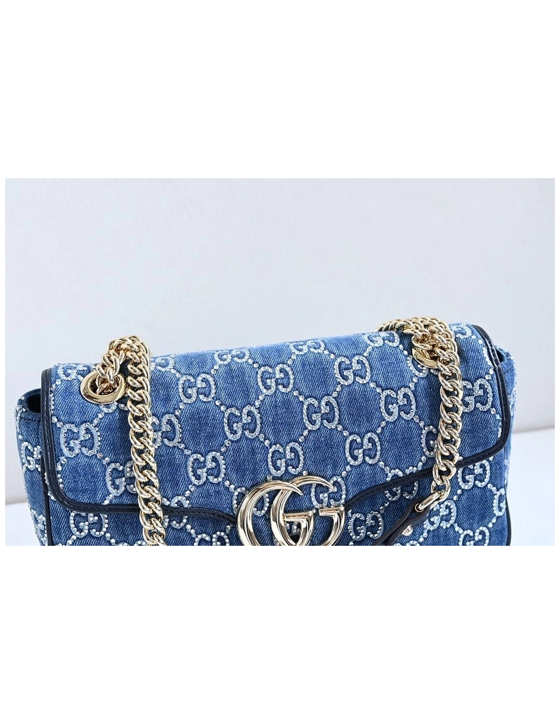 Inspired by the summer spirit and beach clubs on the Italian coast, this item is part of Gucci Lido. The small GG Marmont chain shoulder bag has a softly structured shape and an oversized flap closure with Double G hardware. The sliding chain strap can be worn multiple ways, changing between a shoulder and a top handle bag. Made in blue GG denim with a tonal dark blue trim.