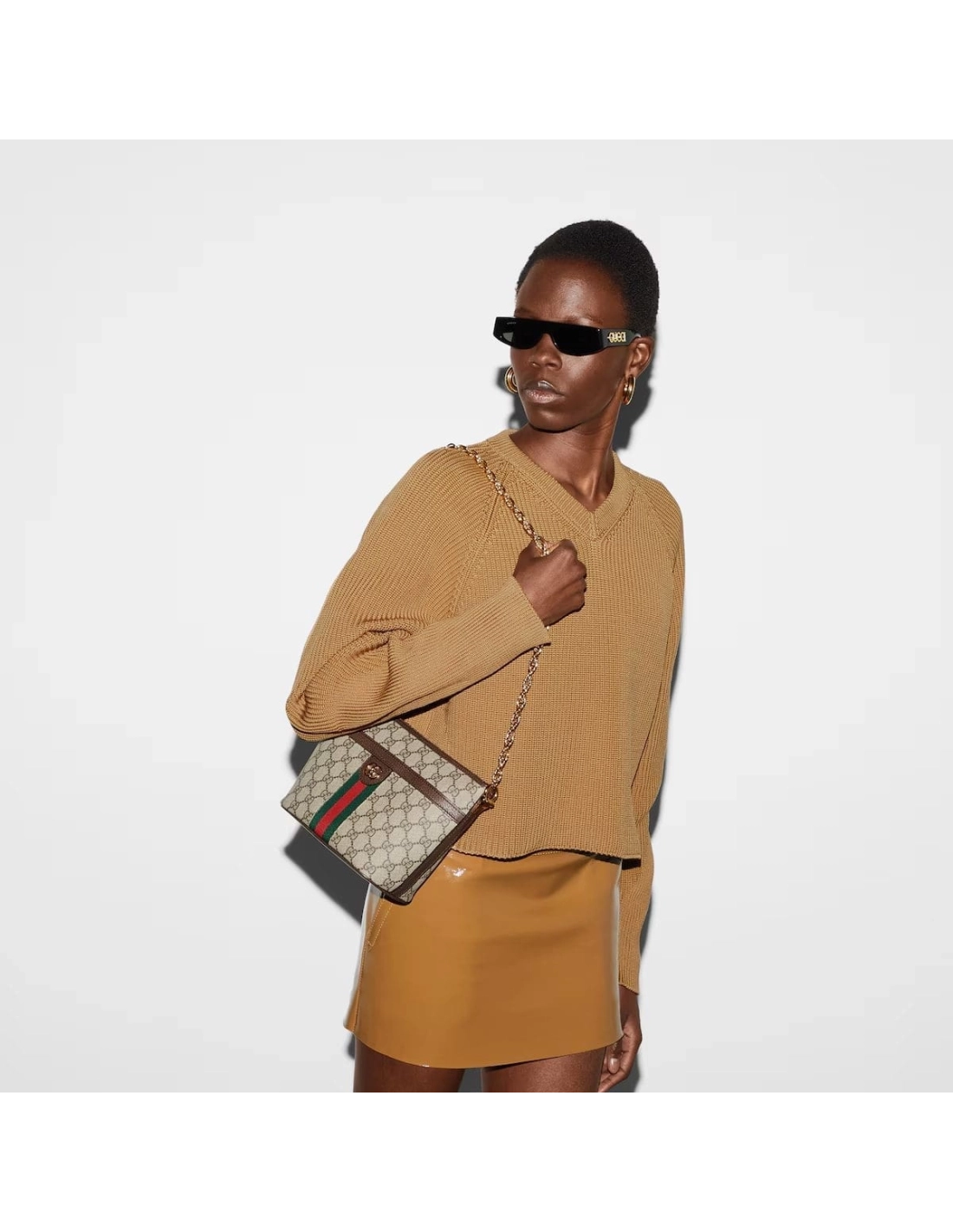 A new take on the classic shoulder bag silhouette, this mini shoulder bag is a refreshing take on the Ophidia collection. This design is made from GG Supreme canvas in the Houses signature beige and ebony colorways.