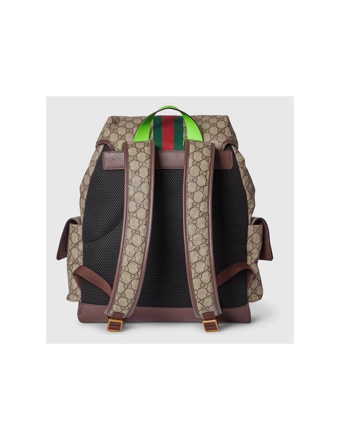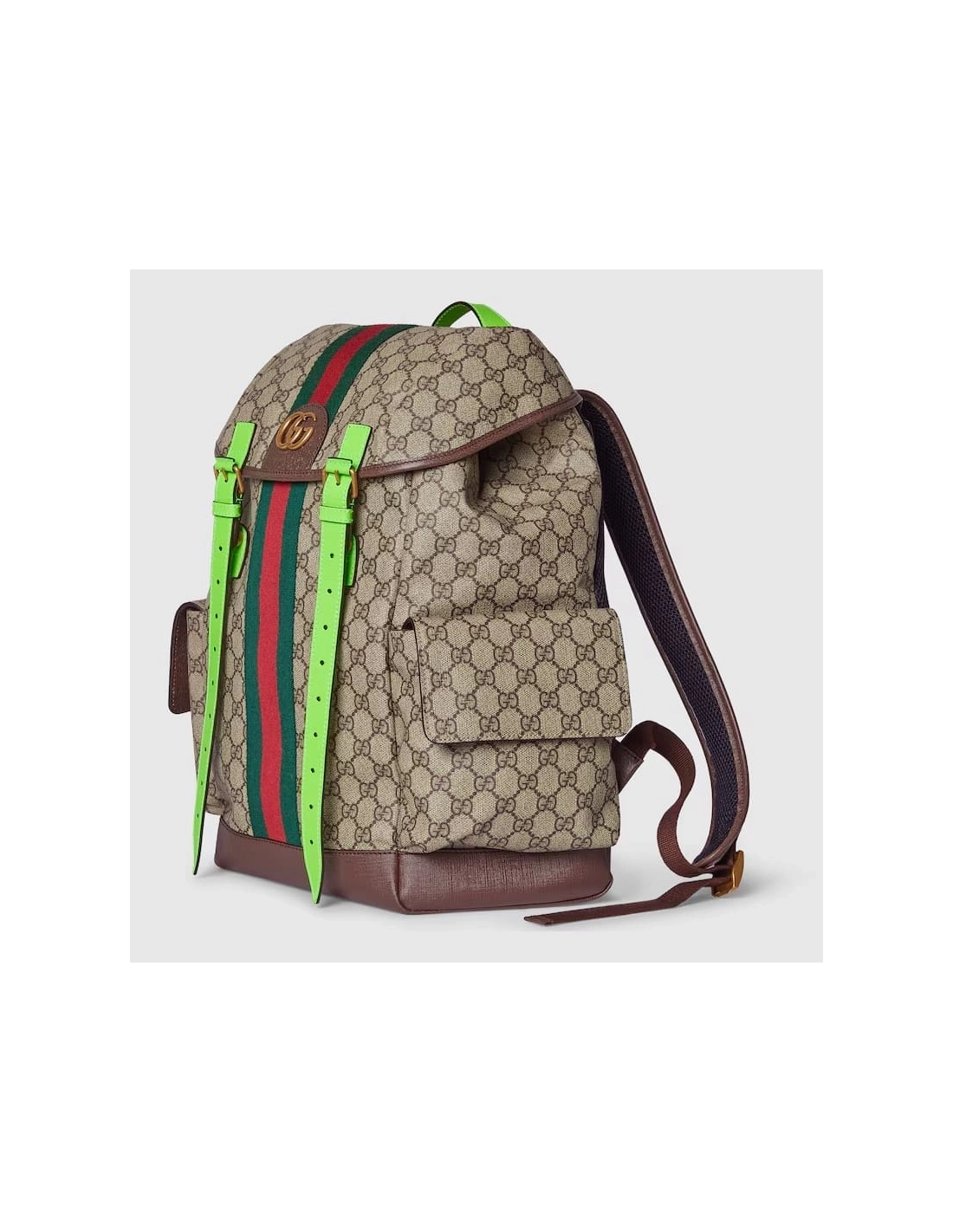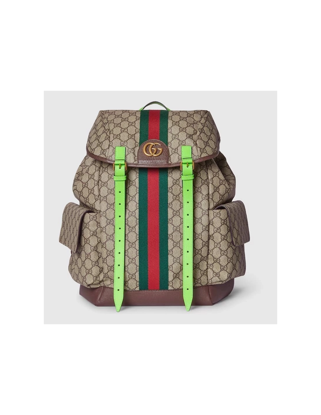 Reflecting the Creative Directors contemporary vision, the Ophidia lines come to life with a pop of fluorescent green. Combining the GG motif and Web stripe with a modern hue launches signature travel pieces into the metropolis, such as this backpack complete with side pockets.