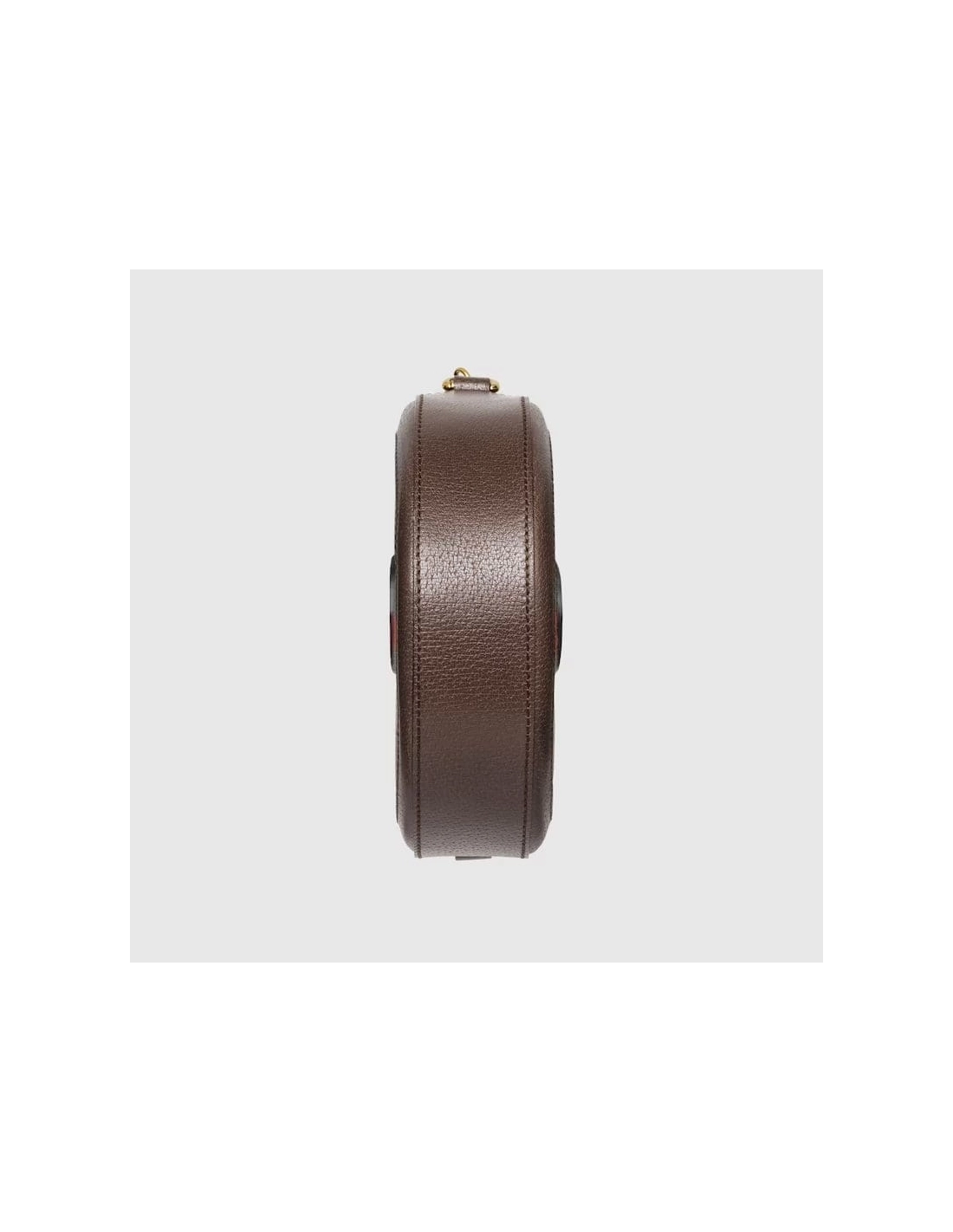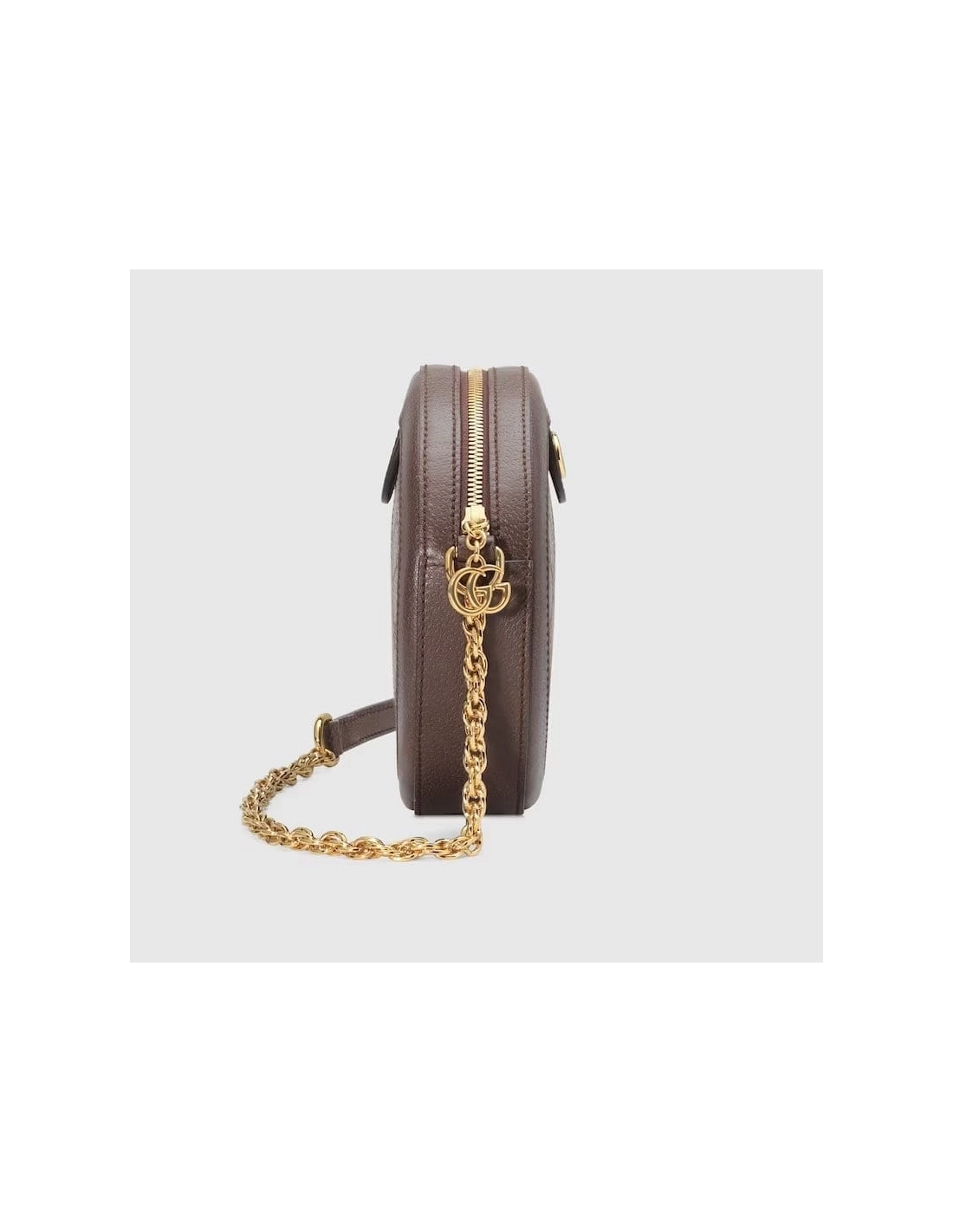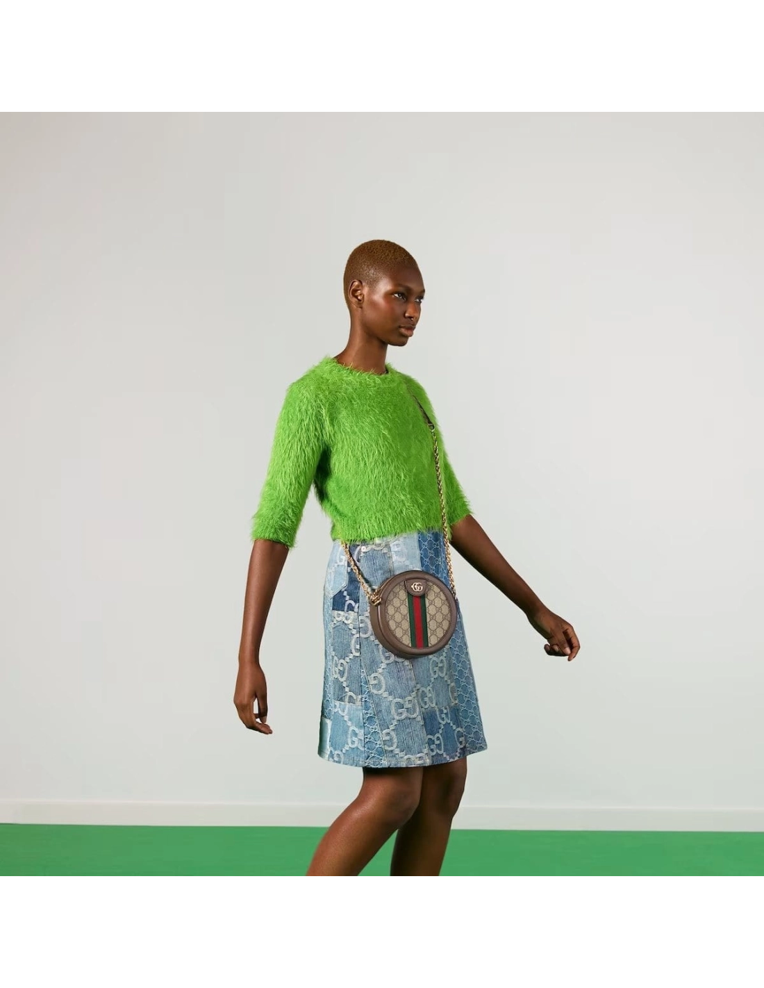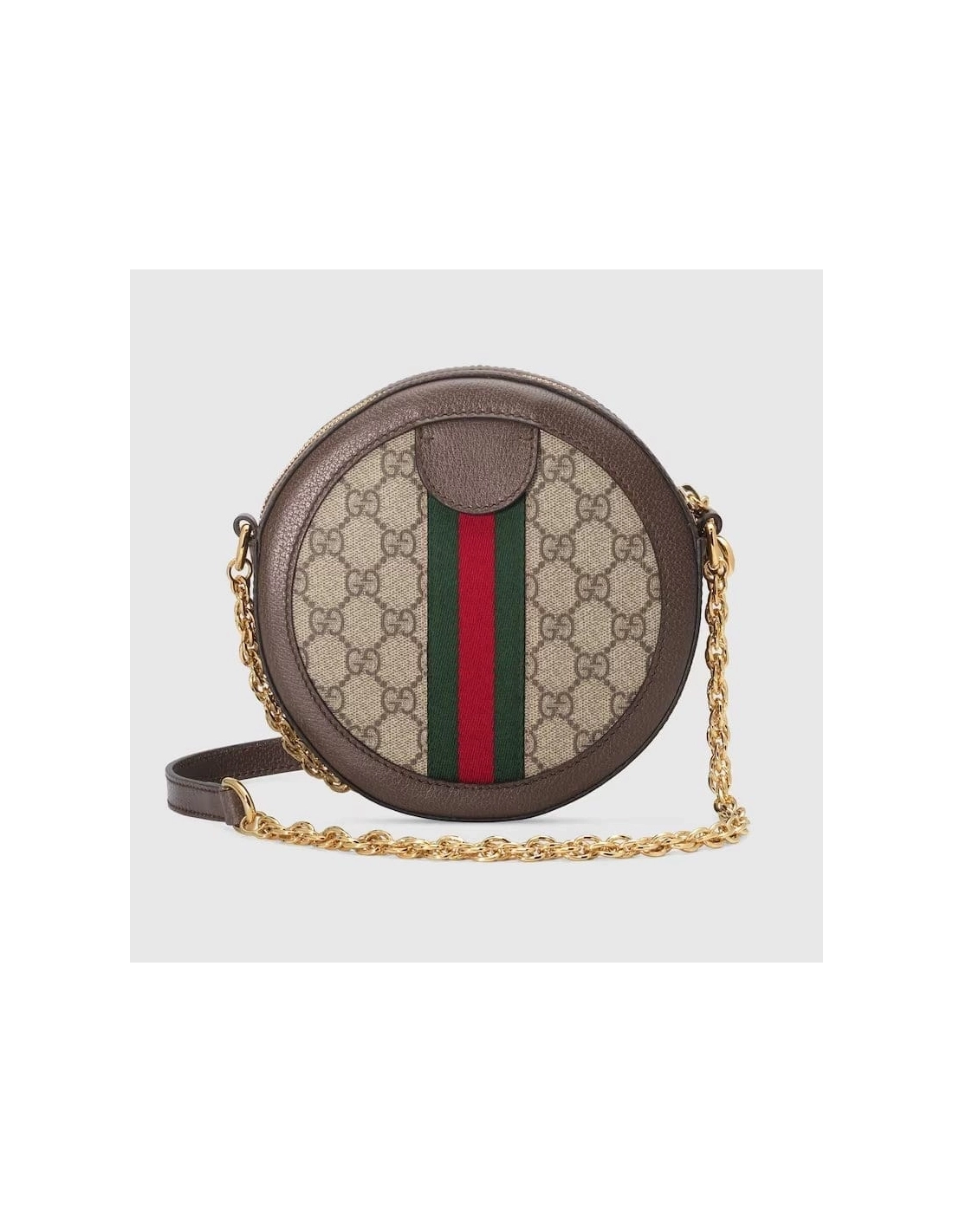 The world of Ophidia evolves with the introduction of a round mini bag with a chain shoulder strap. Crafted in GG Supreme canvas with inlaid green and red Web stripe, the accessory is enhanced by a petite play on the Double G, an archival Gucci code from the 70s that appears atop a leather tab detail and on the zipper pull.