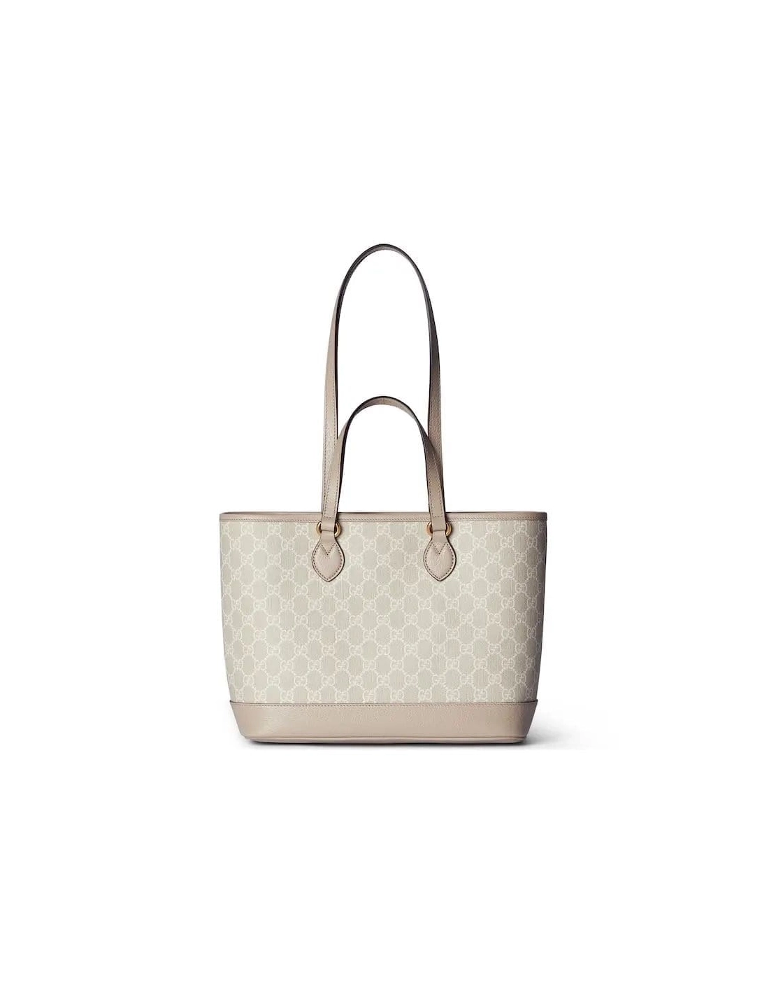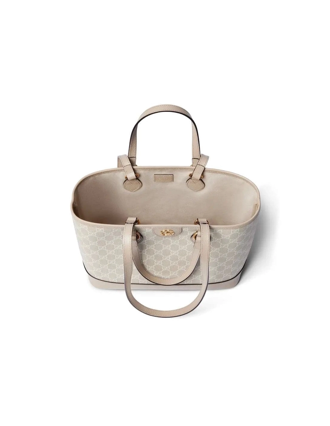 The Ophidia collection is reinterpreted in new sizes and styles, with a handle and shoulder strap integrated into one, allowing for a variety of carrying options. This tote is crafted from beige and white GG Supreme canvas, with the iconic Double G hardware adding to the appeal.