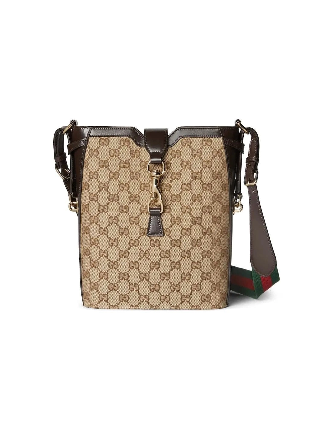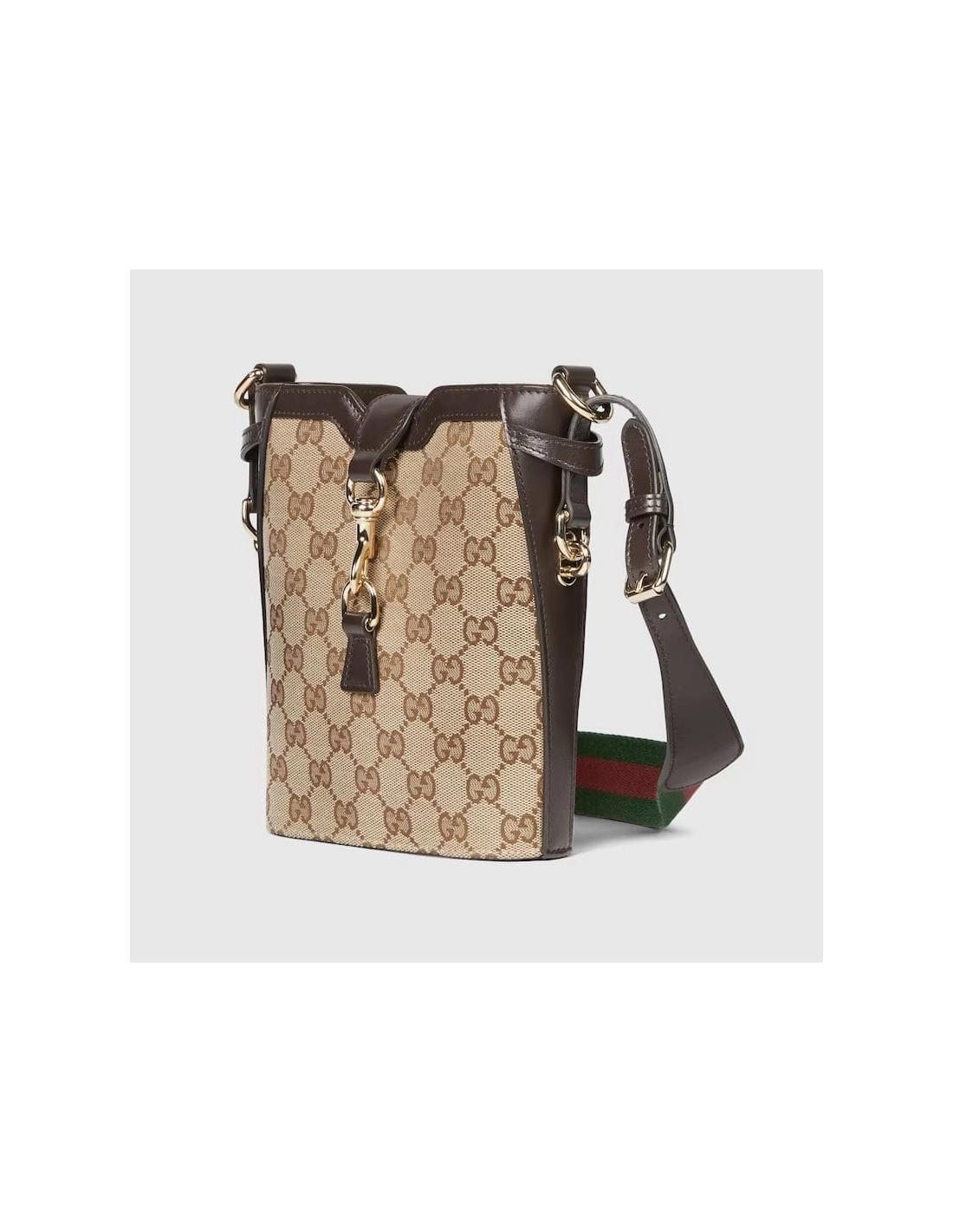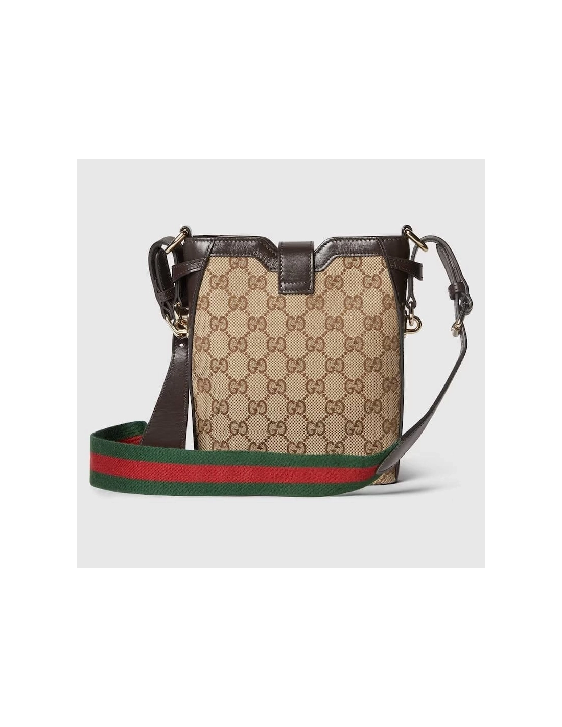 The Original GG canvas lends itself to this small bucket bag design. The beige and ebony motif is accentuated by dark brown leather trim and light gold-toned hardware. The green and red stripe Web is adjustable and detachable through a leather loop and hardware ring on the sides, giving the bag additional function and structure.