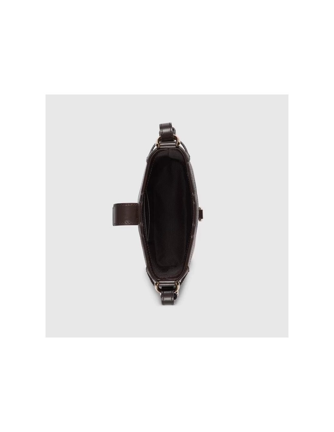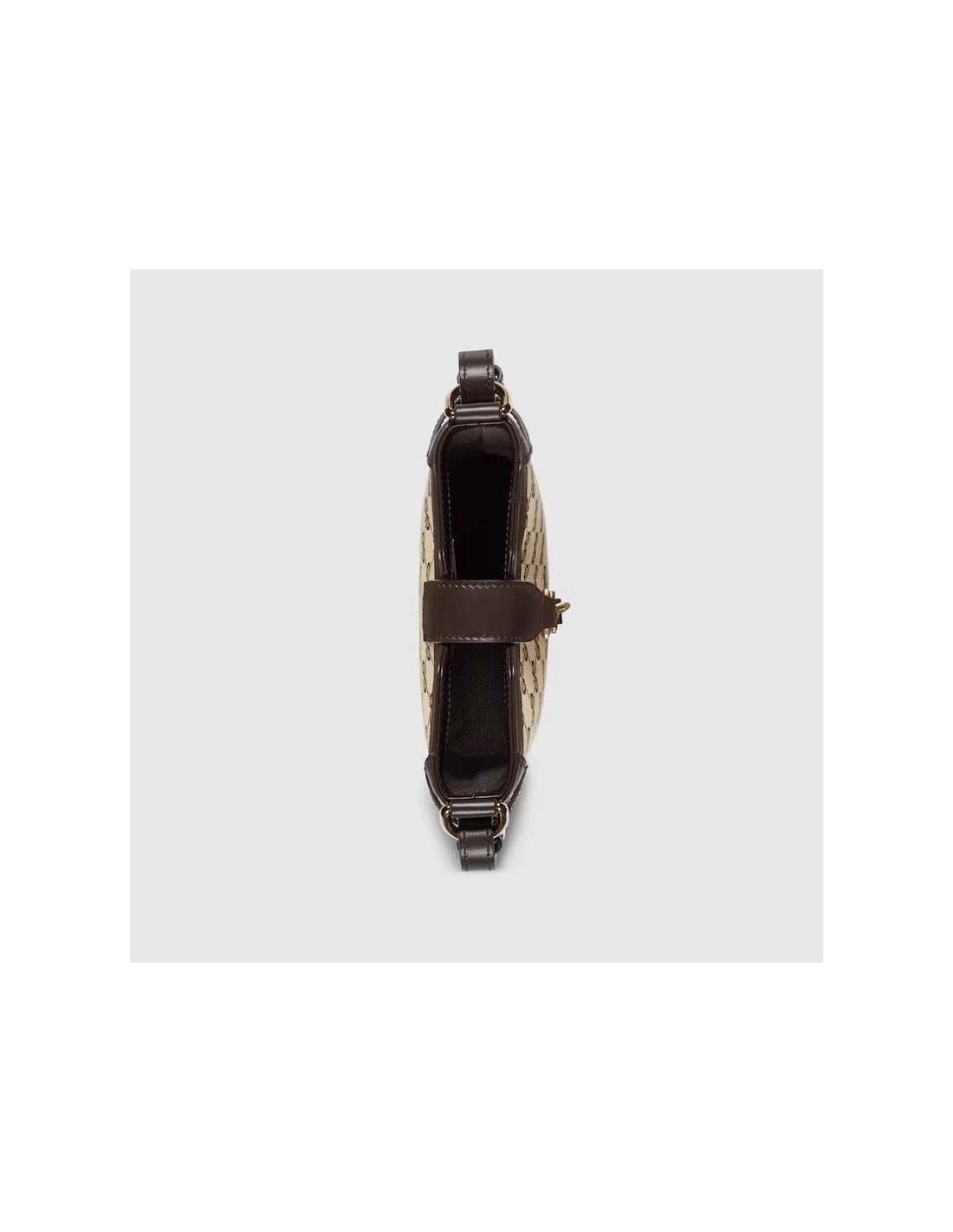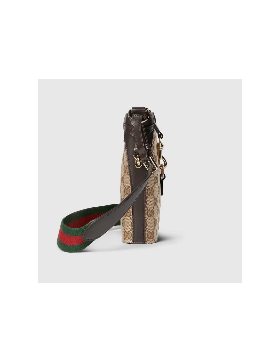 The Original GG canvas lends itself to this small bucket bag design. The beige and ebony motif is accentuated by dark brown leather trim and light gold-toned hardware. The green and red stripe Web is adjustable and detachable through a leather loop and hardware ring on the sides, giving the bag additional function and structure.