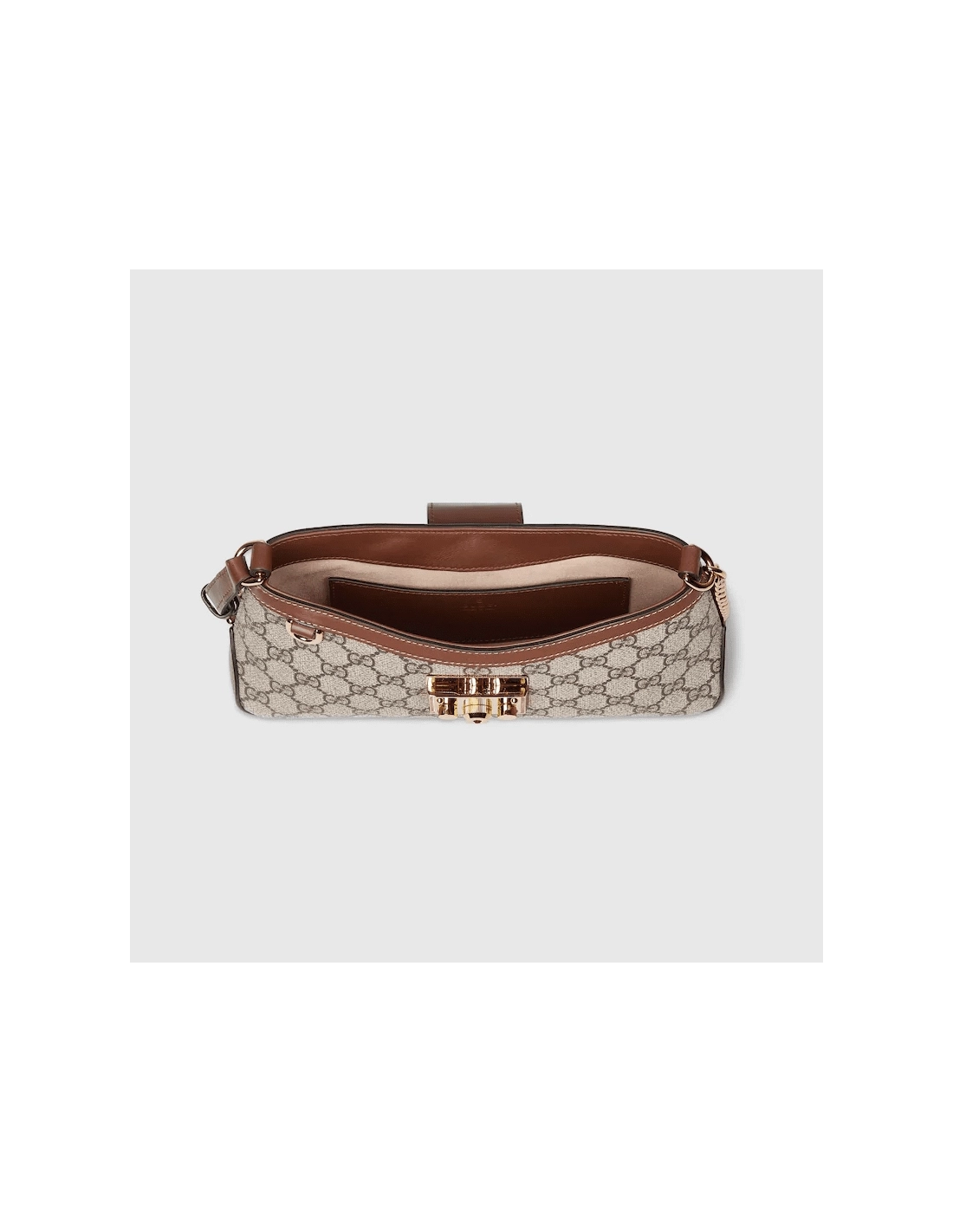 Drawing from the Houses origins as an artisanal luggage atelier, the Padlock closure features prominently on this small shoulder bag in beige and ebony GG Supreme canvas, with brown leather trim, and a new adjustable leather and chain strap. It is complete with gold-toned hardware and key with leather holder.