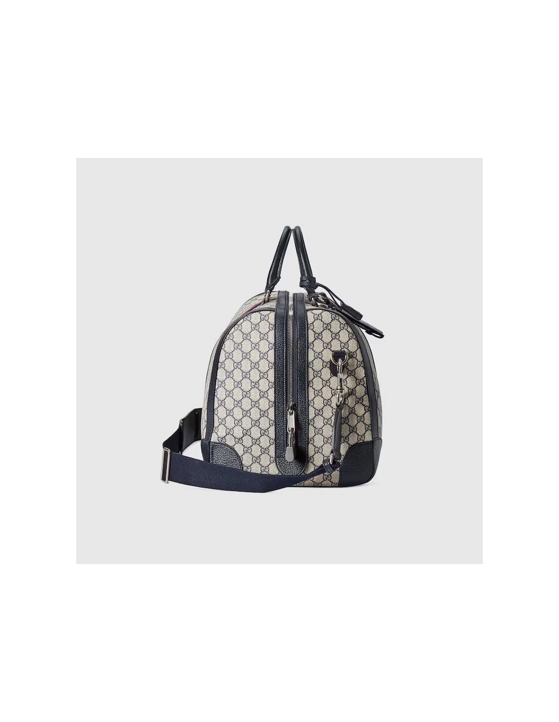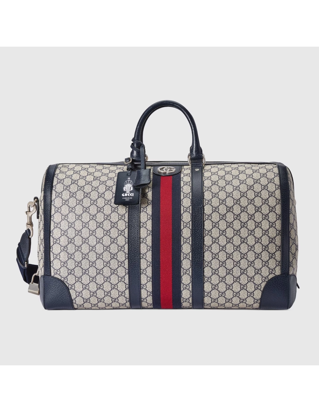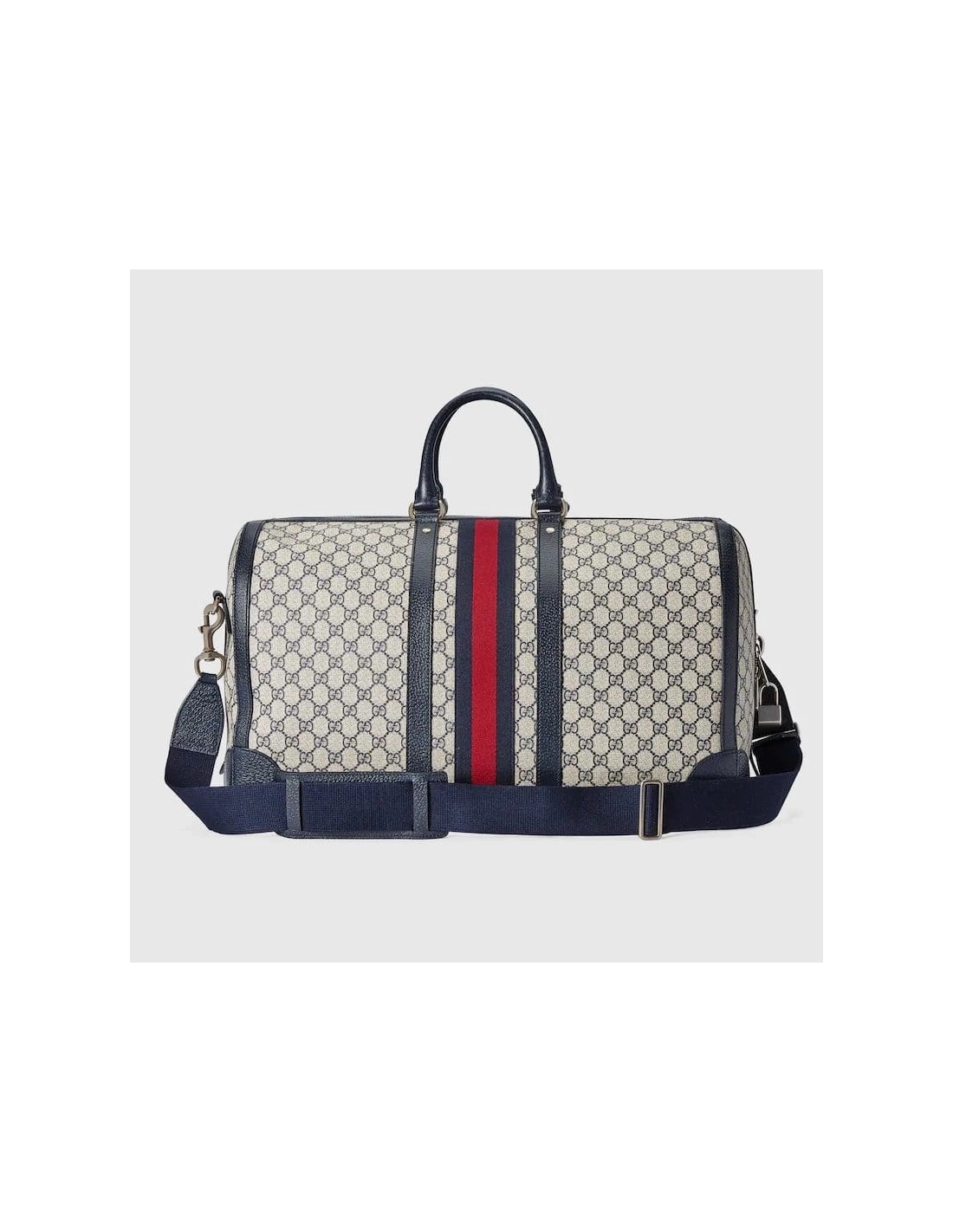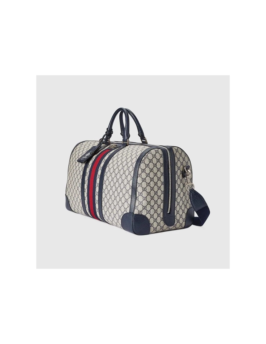 Introduced within the Gucci Savoy line, this duffle bag is crafted from beige and blue GG Supreme canvas combined with the distinctive combination of the House Web with Double G hardware. The top-handle shape is also equipped with an adjustable canvas strap so it can be worn on the shoulder. A secure zipper closure completes the silhouette.