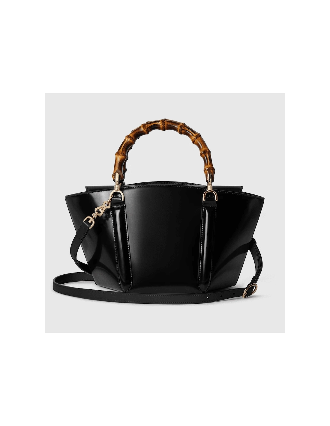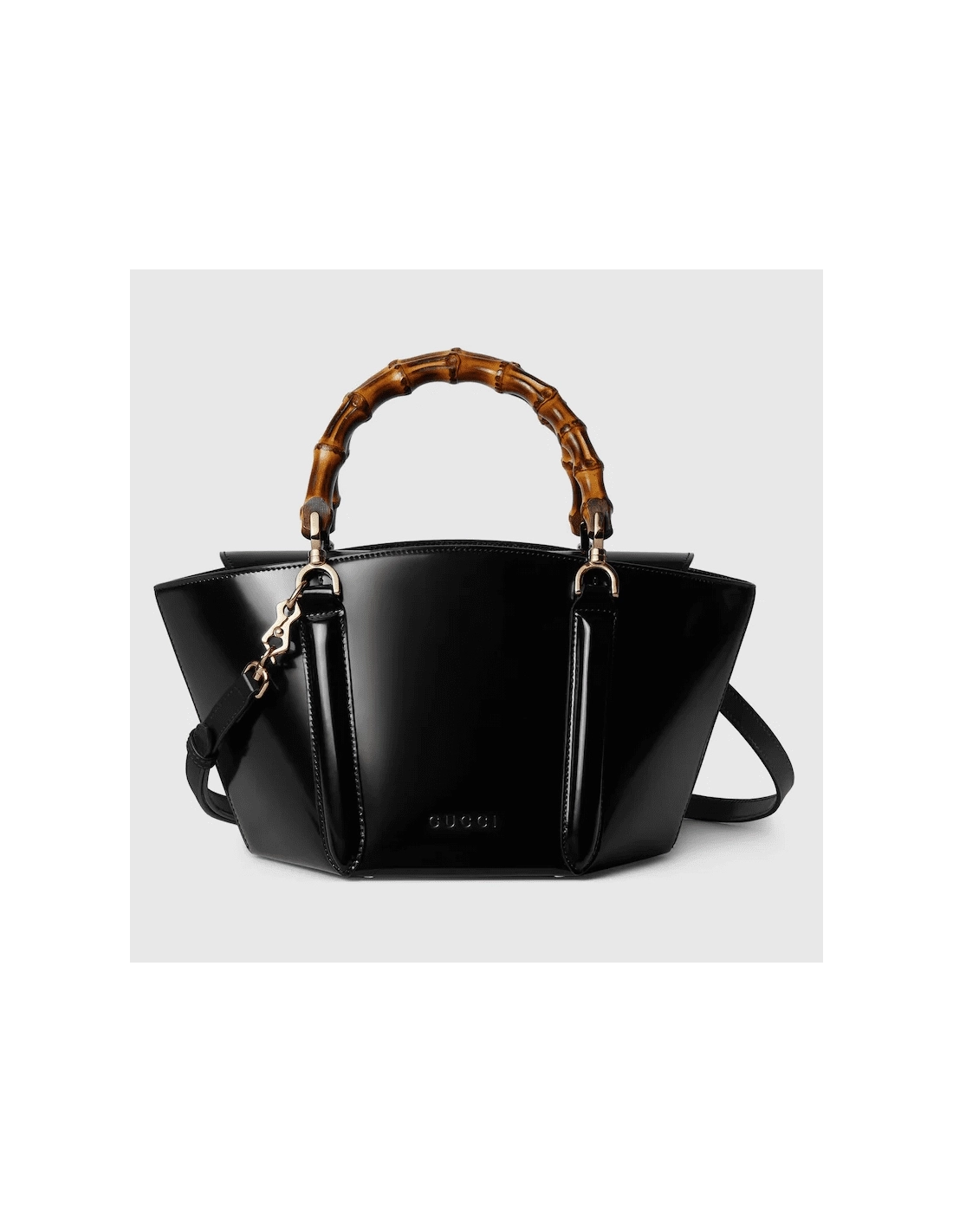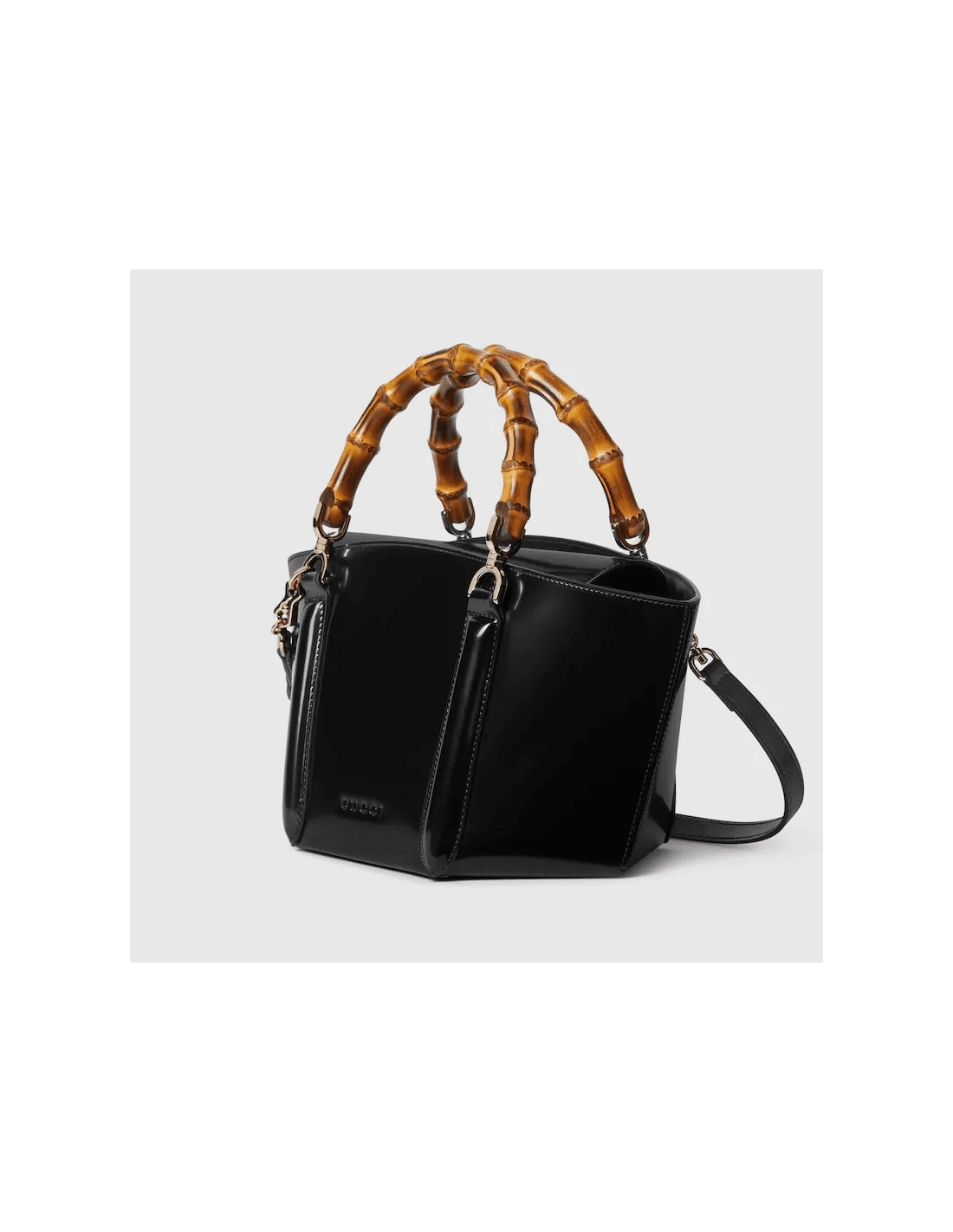 Introducing a bamboo top handle bag, this style from the womens Fall Winter 2024 runway blends the Houses expert craftsmanship with its iconic motif. The basket-shaped bag reveals a hexagonal base, highlighting its artisanal construction. The small size in black is complete with a detachable shoulder strap.