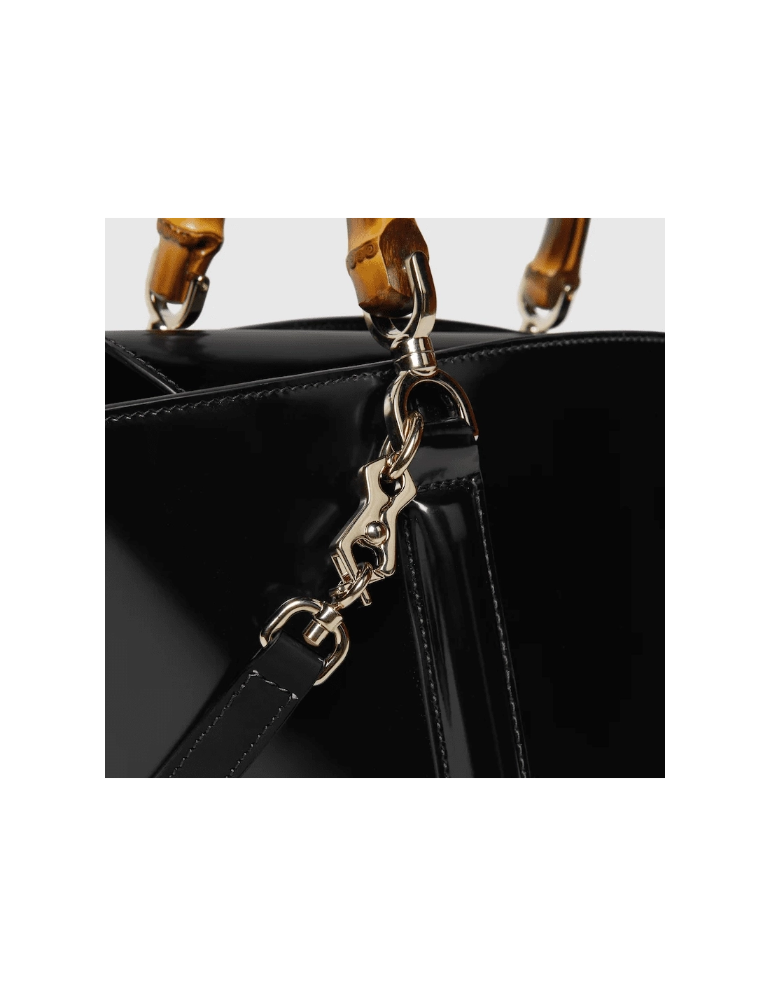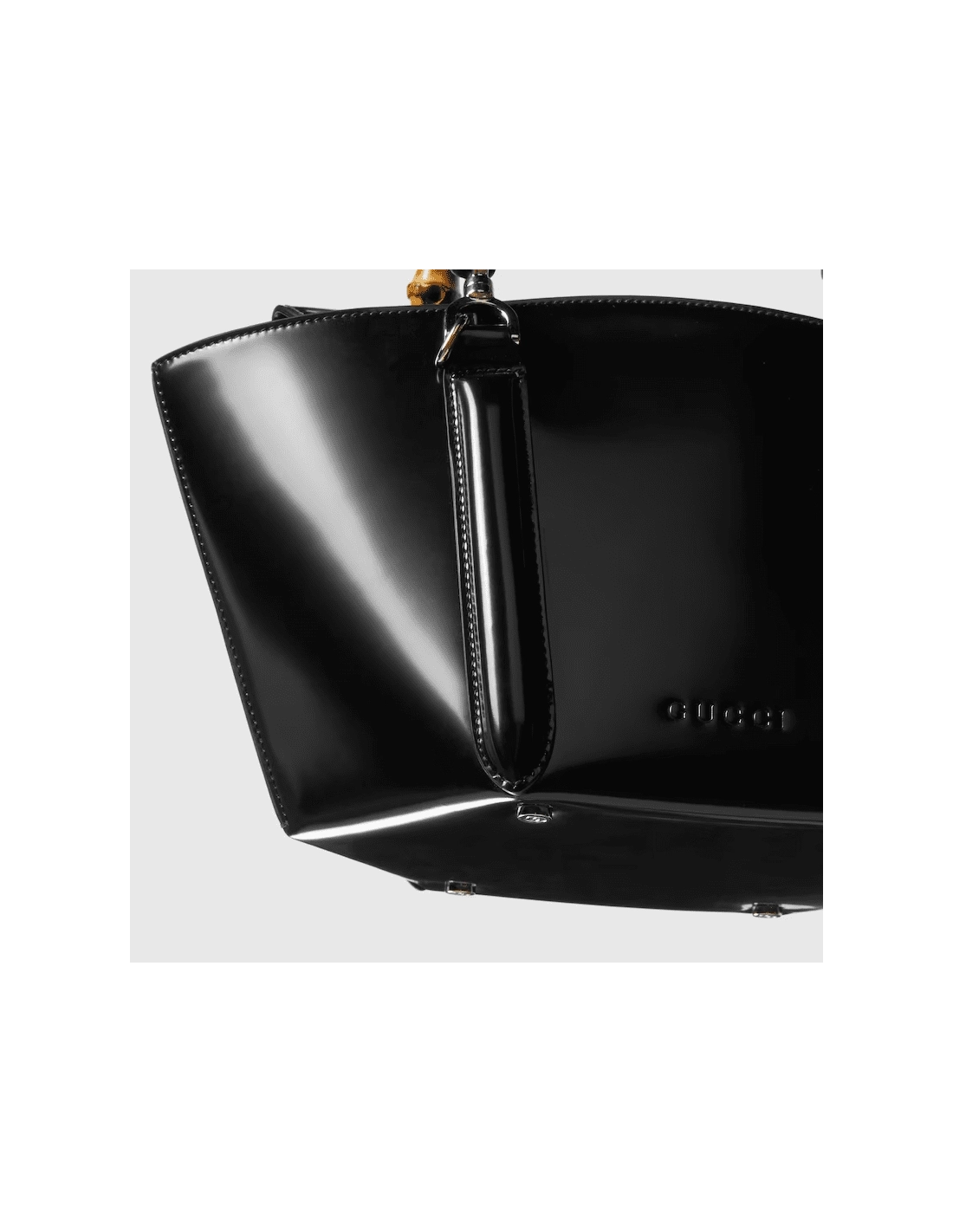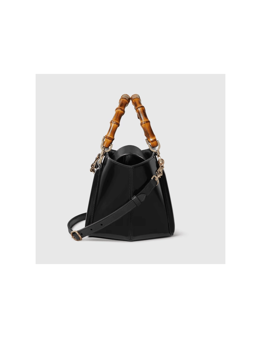 Introducing a bamboo top handle bag, this style from the womens Fall Winter 2024 runway blends the Houses expert craftsmanship with its iconic motif. The basket-shaped bag reveals a hexagonal base, highlighting its artisanal construction. The small size in black is complete with a detachable shoulder strap.