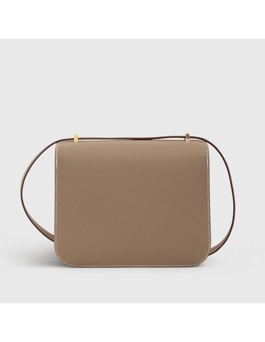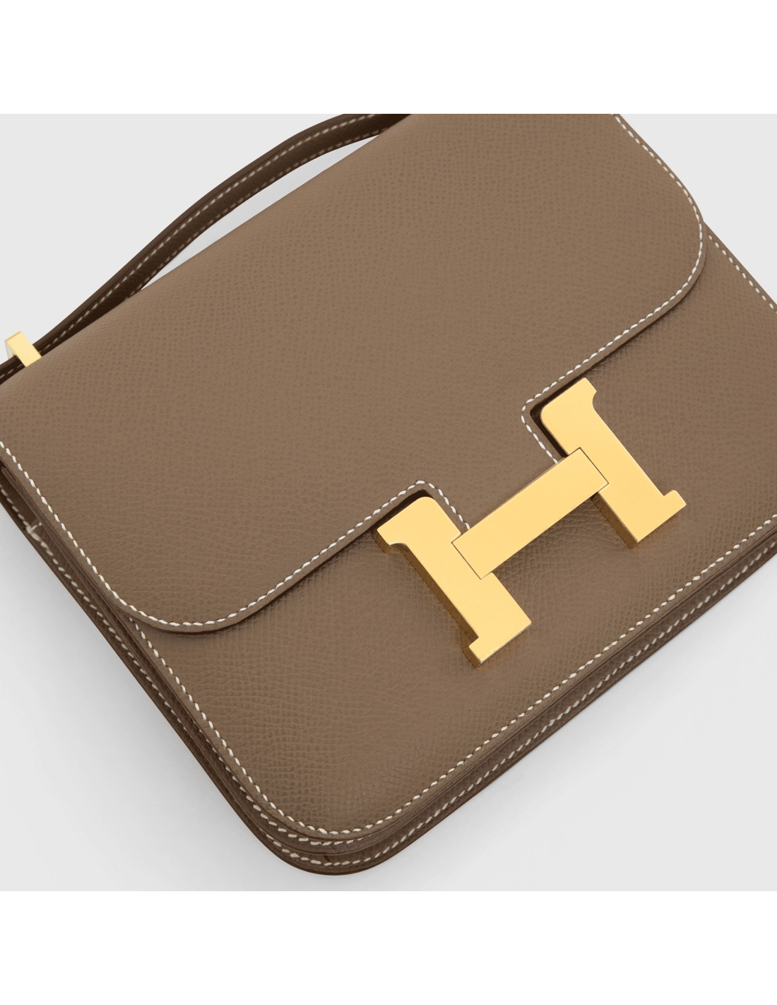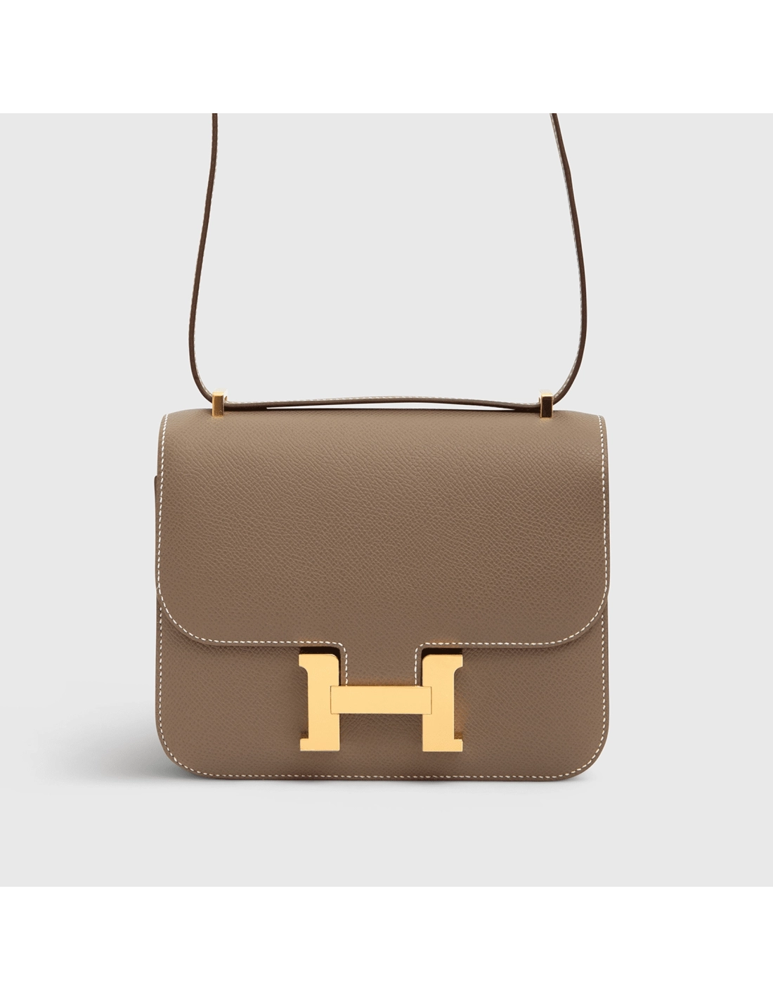 This Constance is a luxurious piece crafted from Etoupe?epsom leather and adorned with gold hardware. Its contrast stitching, metalH snap lock closure, and adjustable shoulder strap offer a classic and elegant look. The interior is lined with soft Gold lambskin and features an open pocket, a center divide, a removable mirror, and a slit pocket.