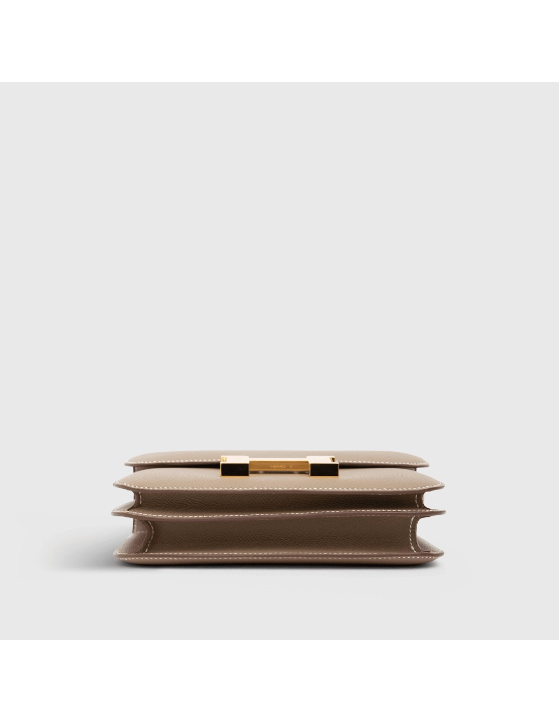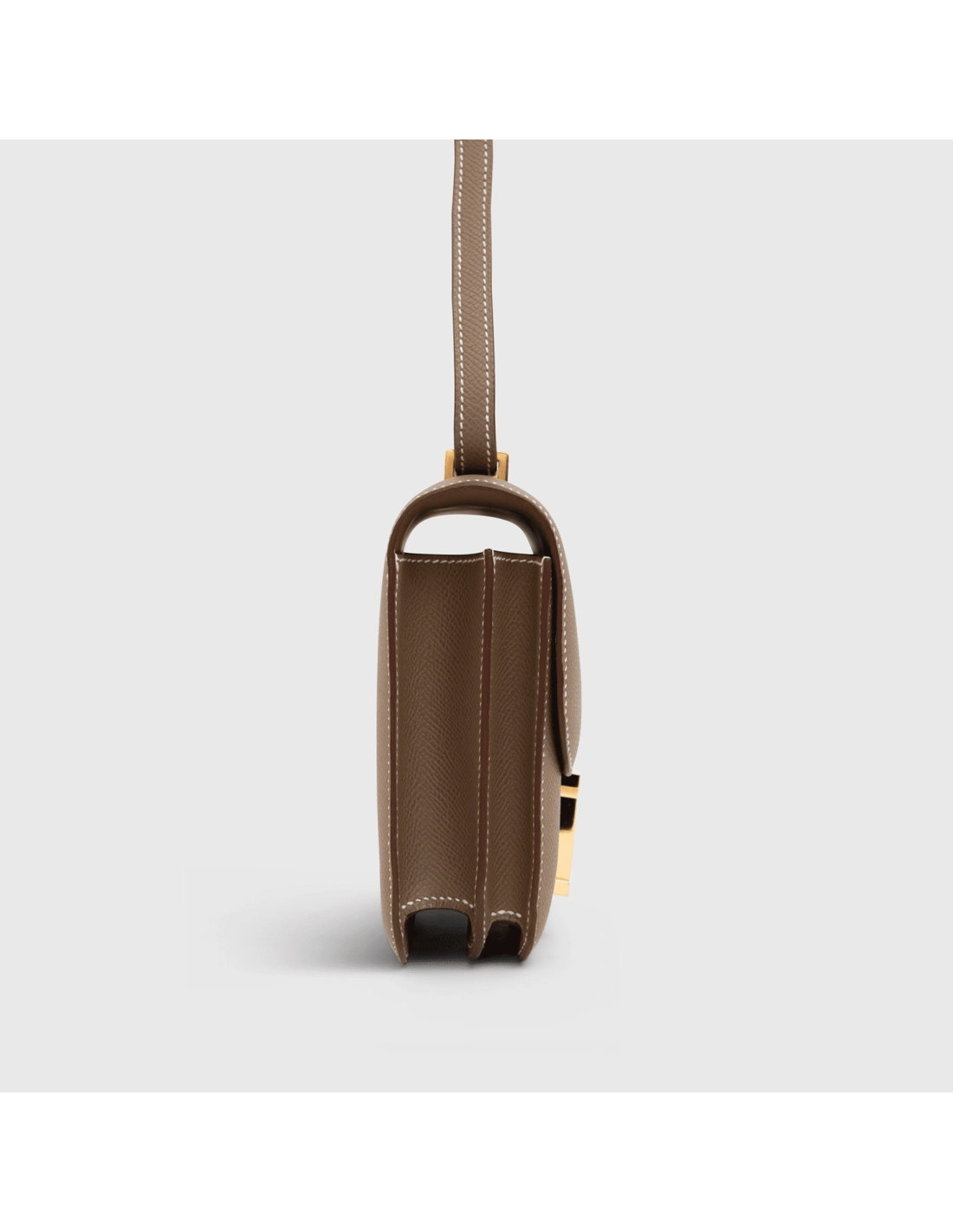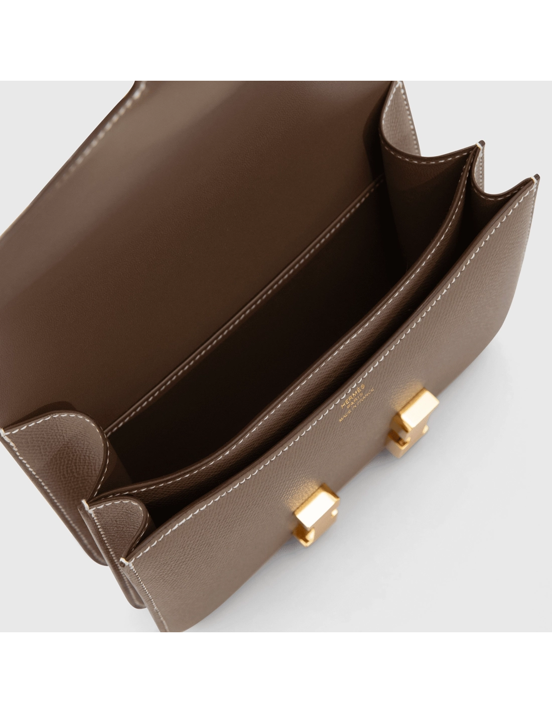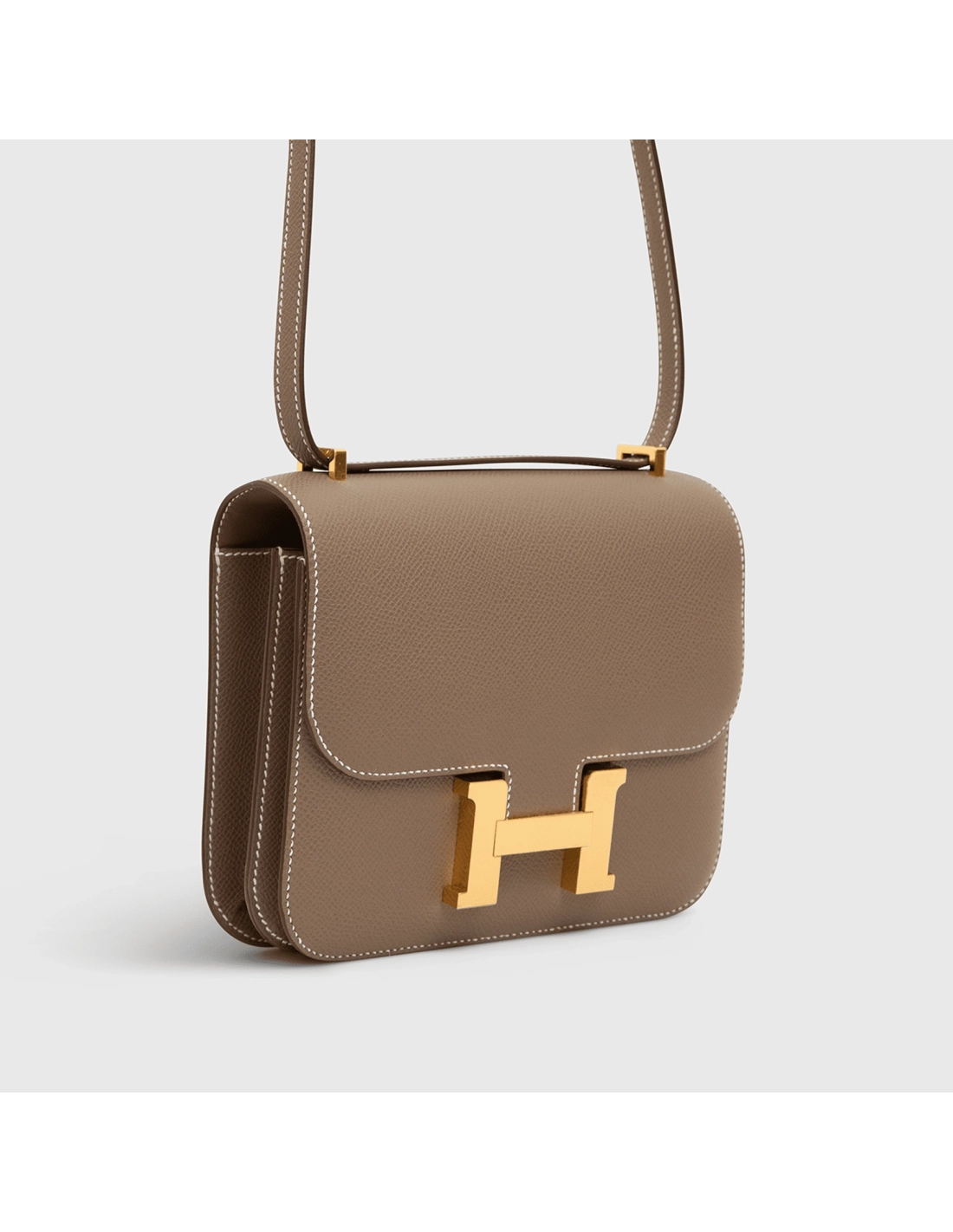 This Constance is a luxurious piece crafted from Etoupe?epsom leather and adorned with gold hardware. Its contrast stitching, metalH snap lock closure, and adjustable shoulder strap offer a classic and elegant look. The interior is lined with soft Gold lambskin and features an open pocket, a center divide, a removable mirror, and a slit pocket.