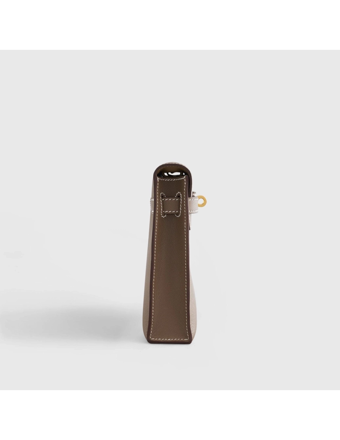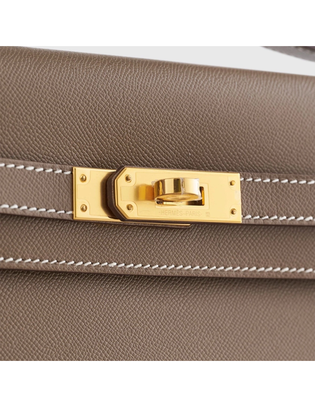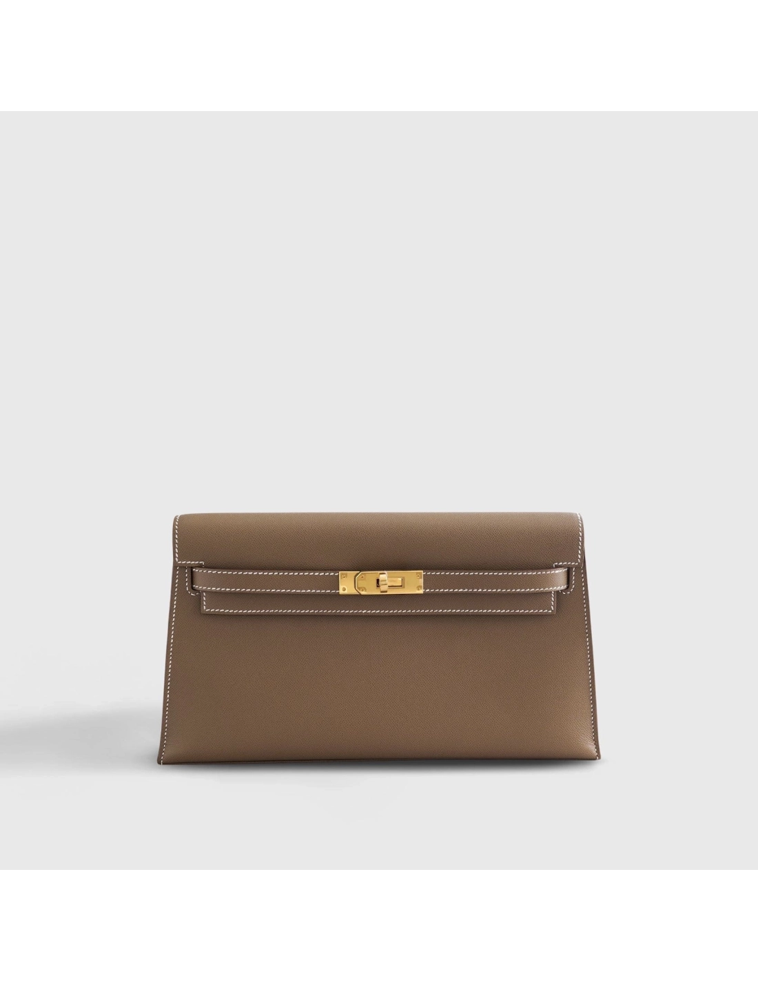 Introducing the Kelly Elan in sophisticated Etoupe Veau Madame leather with gold hardware, showcasing exquisite contrast stitching. This sleek design features two pull straps that attach to a toggle, with an interior equipped with snaps for the shoulder strap. The interior is elegantly lined with Etoupe lambskin, adding to its allure.