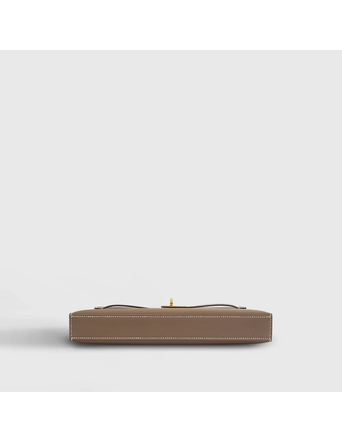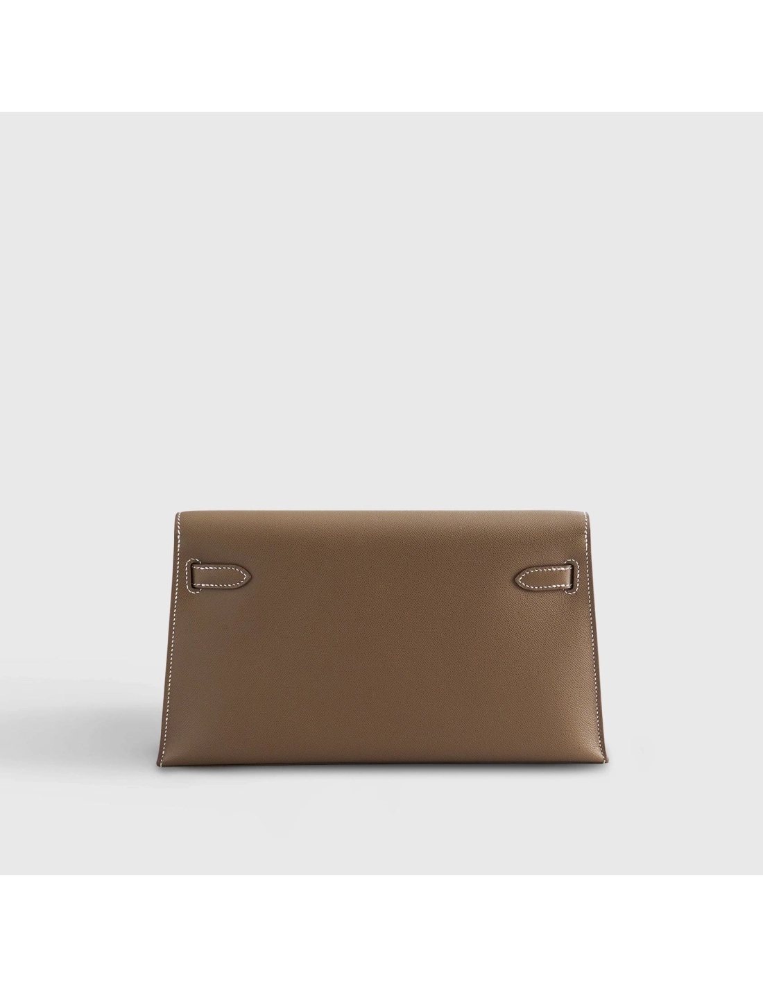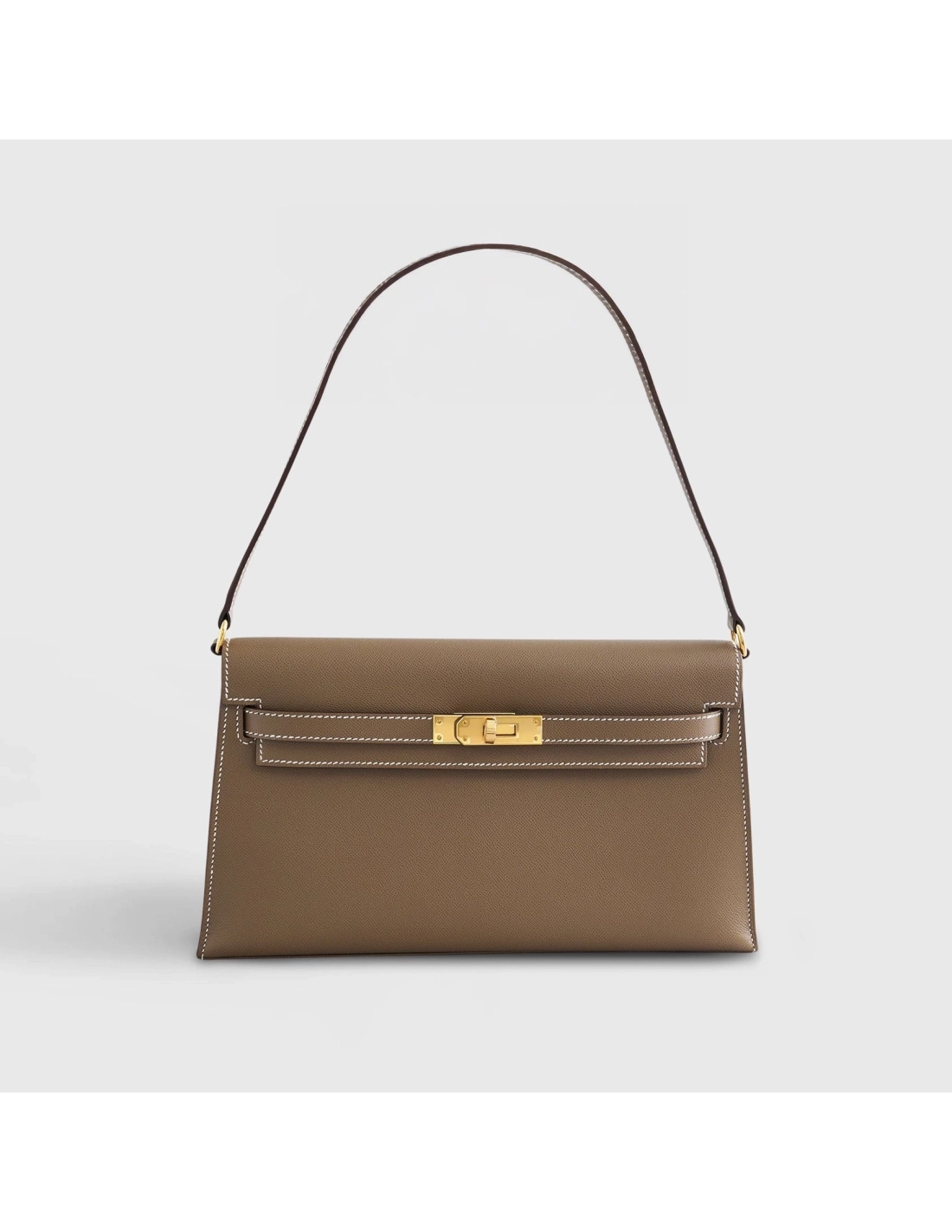 Introducing the Kelly Elan in sophisticated Etoupe Veau Madame leather with gold hardware, showcasing exquisite contrast stitching. This sleek design features two pull straps that attach to a toggle, with an interior equipped with snaps for the shoulder strap. The interior is elegantly lined with Etoupe lambskin, adding to its allure.