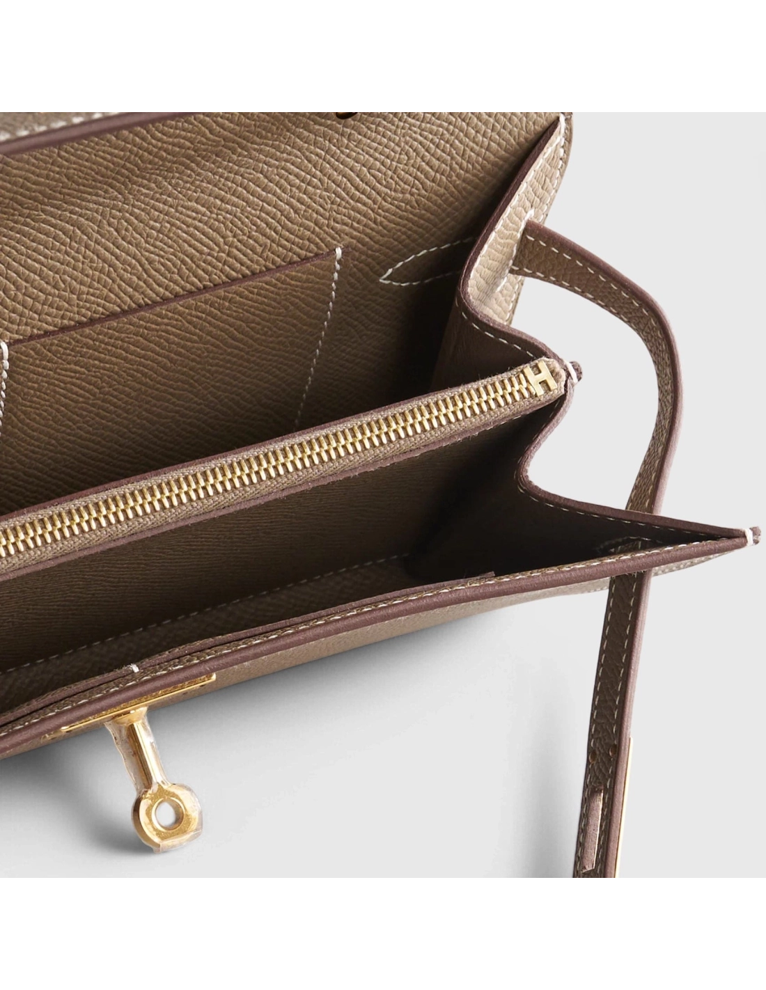 The Kelly Wallet To Go, crafted from Etoupe Epsom leather with gold hardware, features contrast stitching. It includes two straps with a front toggle closure and a removable crossbody strap for versatility. The interior, lined with matching Etoupe Epsom leather, is organized with two main compartments, four credit card slots, and a zippered center compartment with a distinctive Hermes H lock pull.