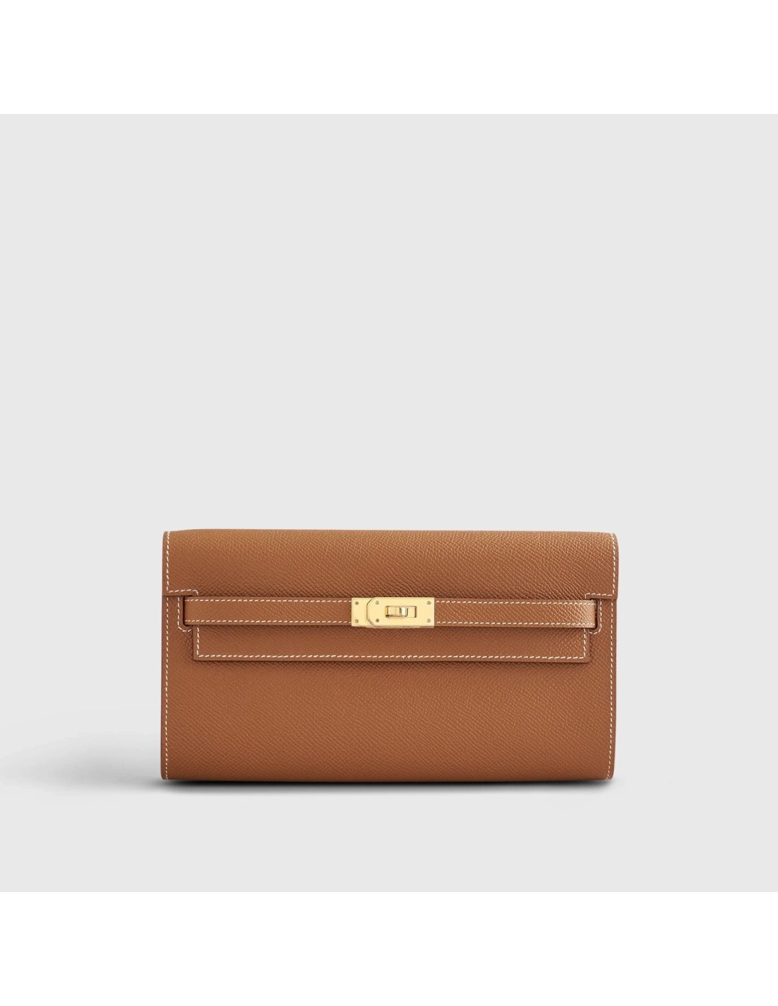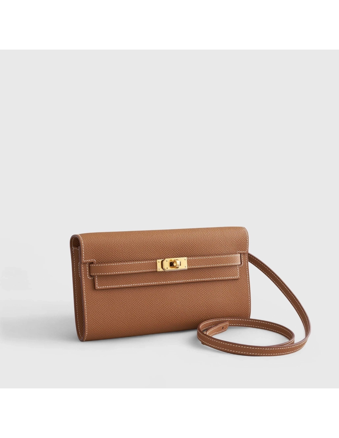 Presenting the Kelly To Go in Epsom leather with gold hardware, showcasing tonal stitching, front toggle closure straps, and a single rolled handle. Inside, discover a handy open pocket. Complementing this, the Kelly Wallet To Go offers functionality with tonal stitching, front straps, and a removable crossbody strap. Its interior boasts two main compartments, four card slots, and a zippered center compartment adorned with an Hermes H lock pull.