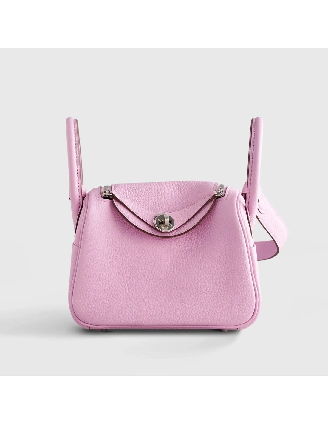 This Mini Lindy, crafted from Mauve Sylvester Clemence leather, features elegant palladium hardware and tonal stitching. It includes double zipper pulls, a front Hermes twist lock, and single pockets on each side. The design is completed with two rolled top handles connected by a flat shoulder strap. Inside, the bag is lined with matching Mauve Sylvester leather and offers a pocket on each side for added convenience.