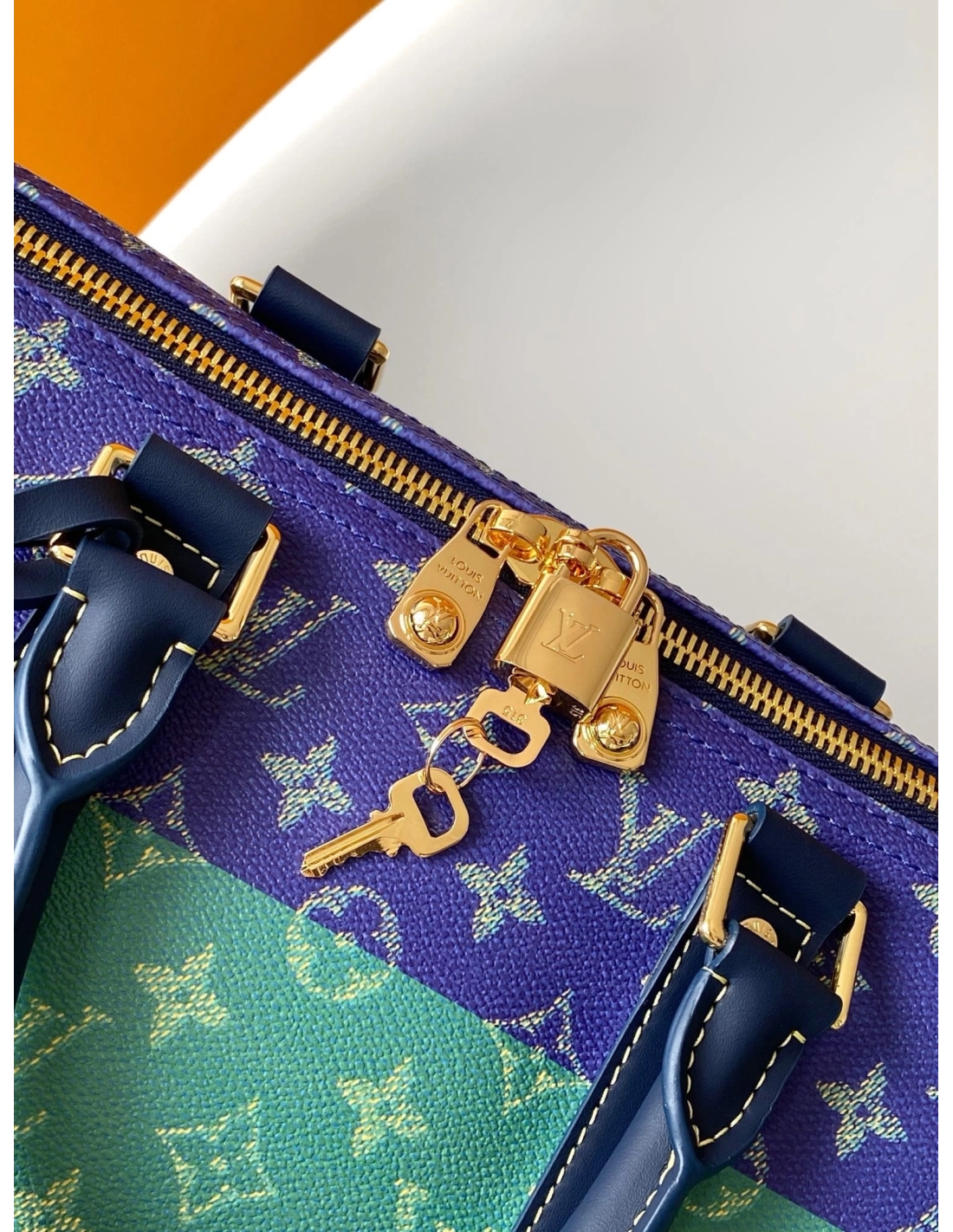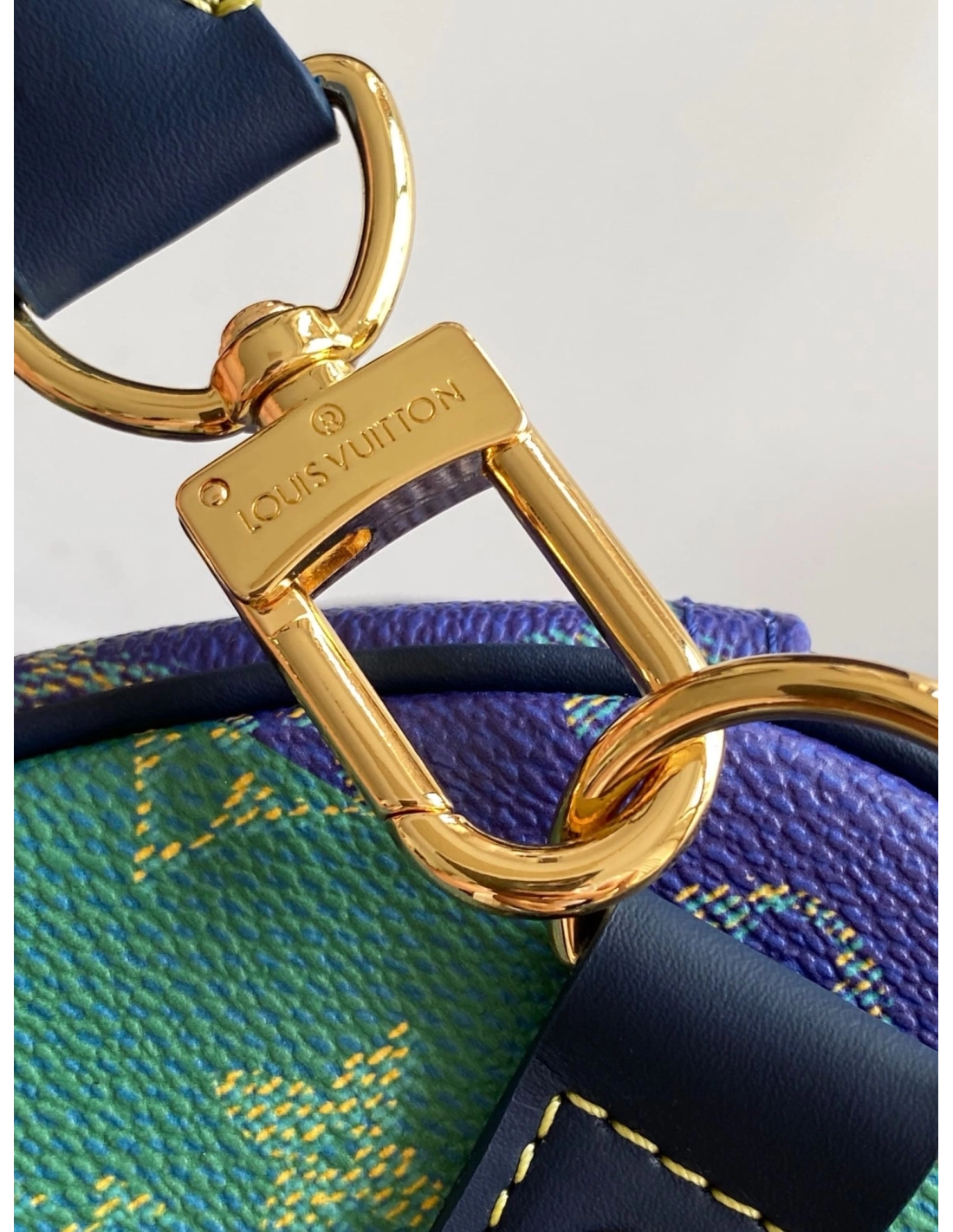 Inspired by the colors of English rugby, Pharrell Williams reimagines the Keepall Bandouliere 50 in Monogram-coated canvas with a bold striped colorway. Cowhide-leather top handles and reinforcement bands complement the palette, while a striped removable strap enhances the sporty feel. Lined in saffron textile, the bag is signed withMarque L. Vuitton Deposee.