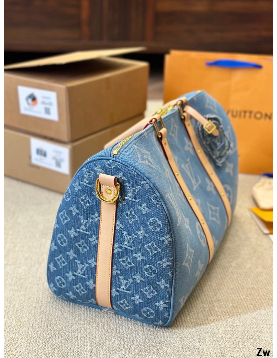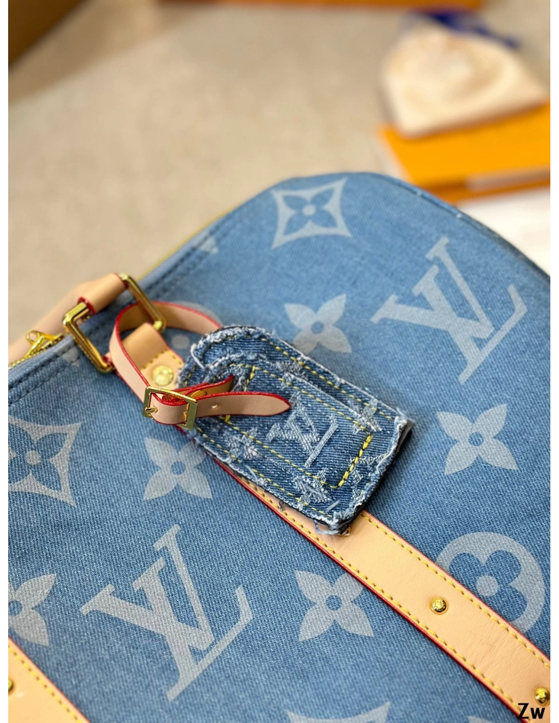 The classic Keepall Bandouliere gets a sporty-chic new look with the Monogram Denim theme. The Houses famous Monogram pattern is printed on certified organic canvas the color of blue jeans, creating an eye-catching contrast with the natural cowhide trim. Complete with a padlock and a removable strap, this spacious bag is ideal as a carry-on or for short trips.