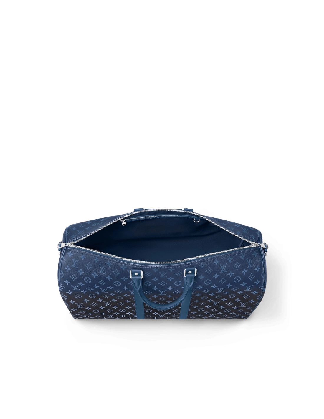 The gradient treatment of the Monogram motif makes this Keepall Bandouliere 55 unique. There and not there at the same time, the Monogram patterns fades at the top of the bag. The classic Keepall details ¨C lateral bands, rolled-leather top handles, removable name tag ¨C are all in colored cowhide-leather. A removable shoulder strap gives carry options.