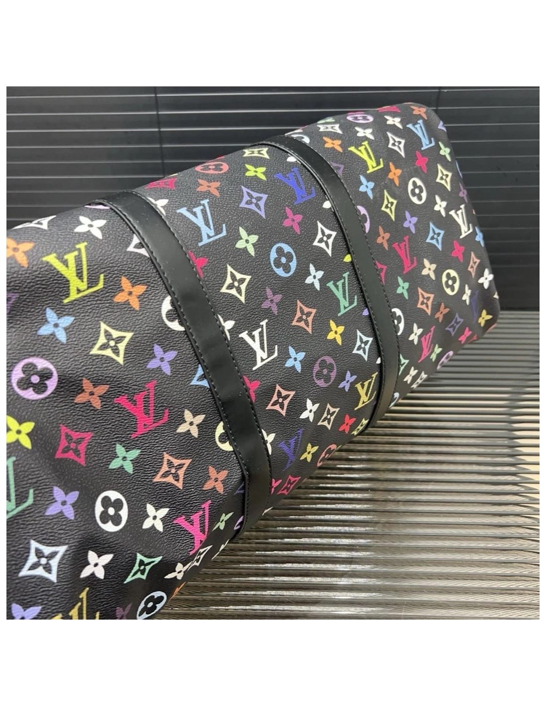 The iconic Keepall Bandouliere 50 makes a bold signature statement in Monogram coated canvas that has been playfully reimagined with vibrant rainbow tones inspired by the work of world-renowned Japanese artist Takashi Murakami. Sleek black leather bands add structure to the roomy cabin-sized design, complete with elegant top handles and a removable, adjustable strap. A padlock, a name tag and a keybell complete the look with a nod to the Houses travel heritage.