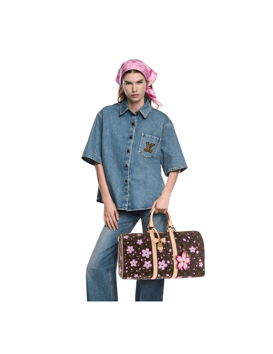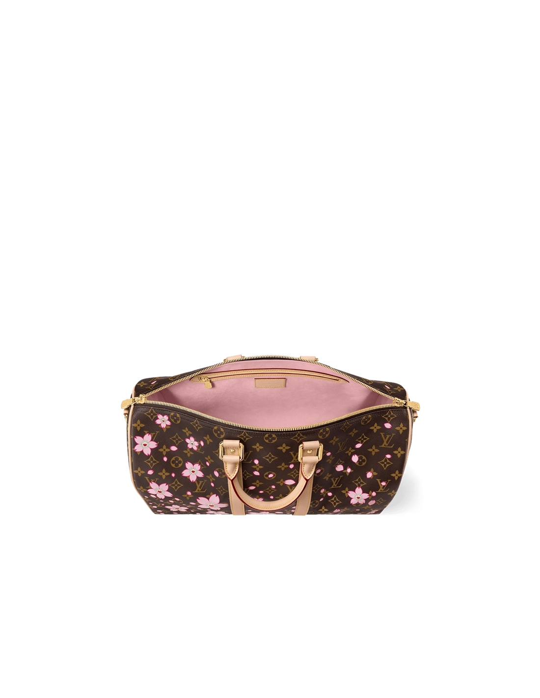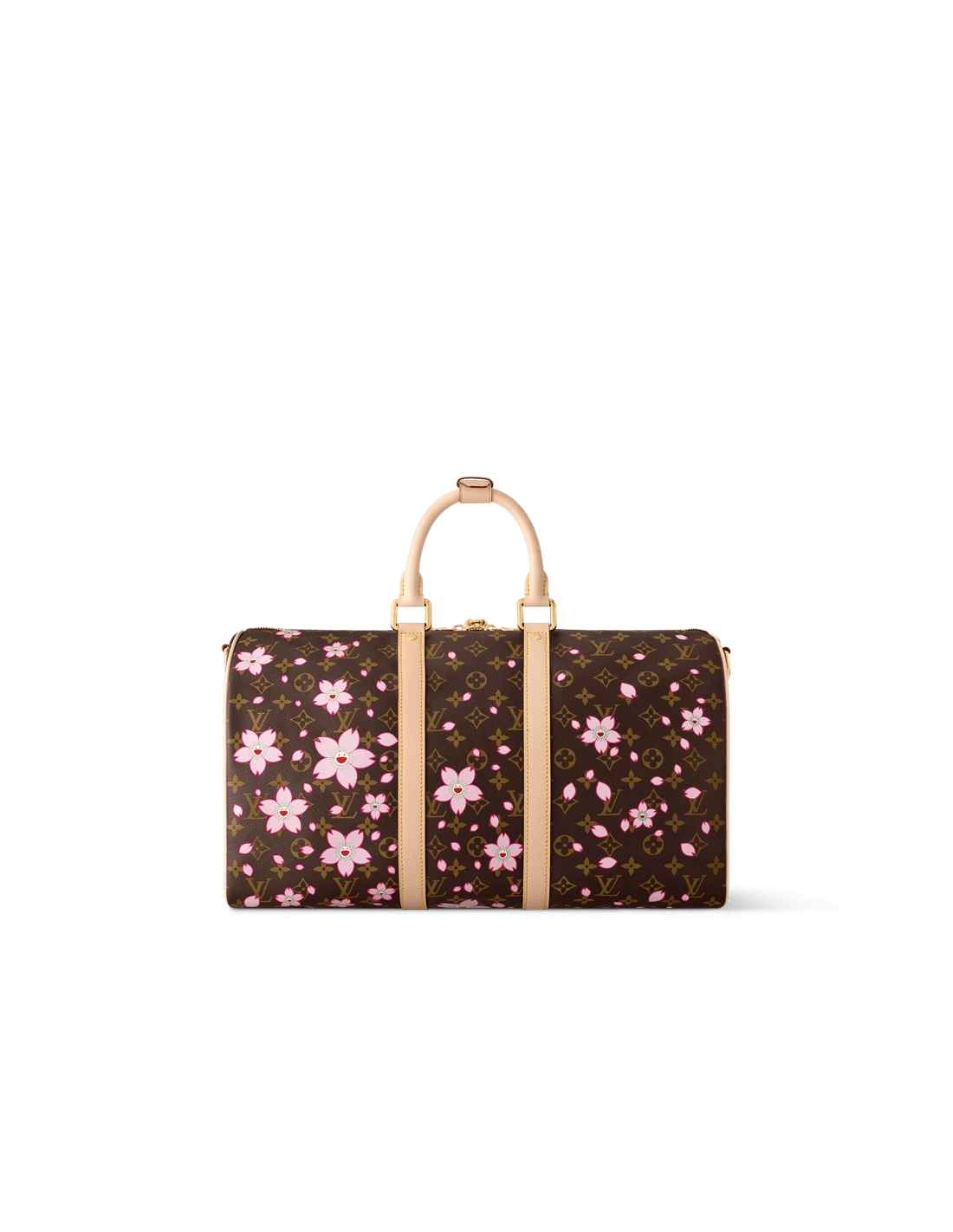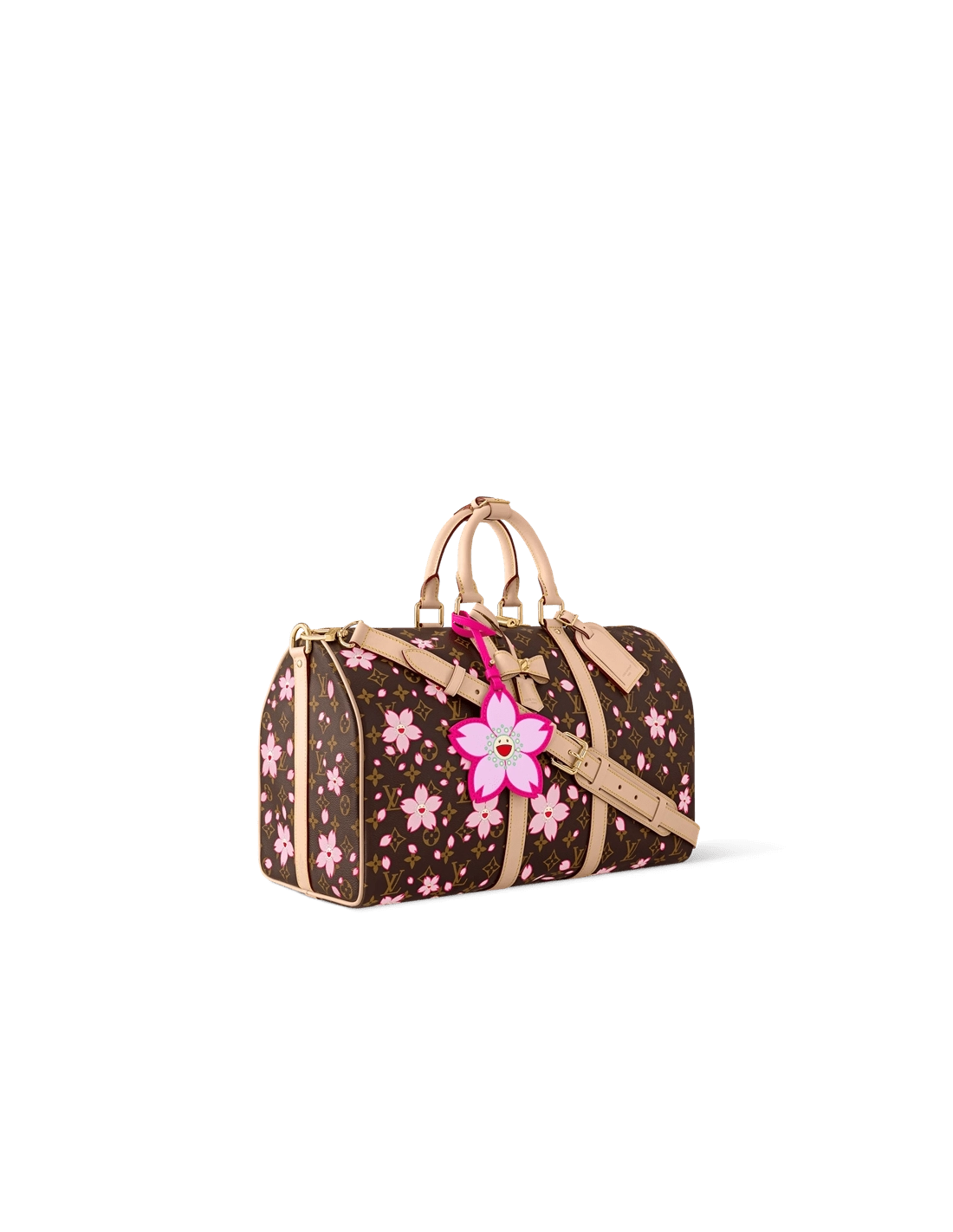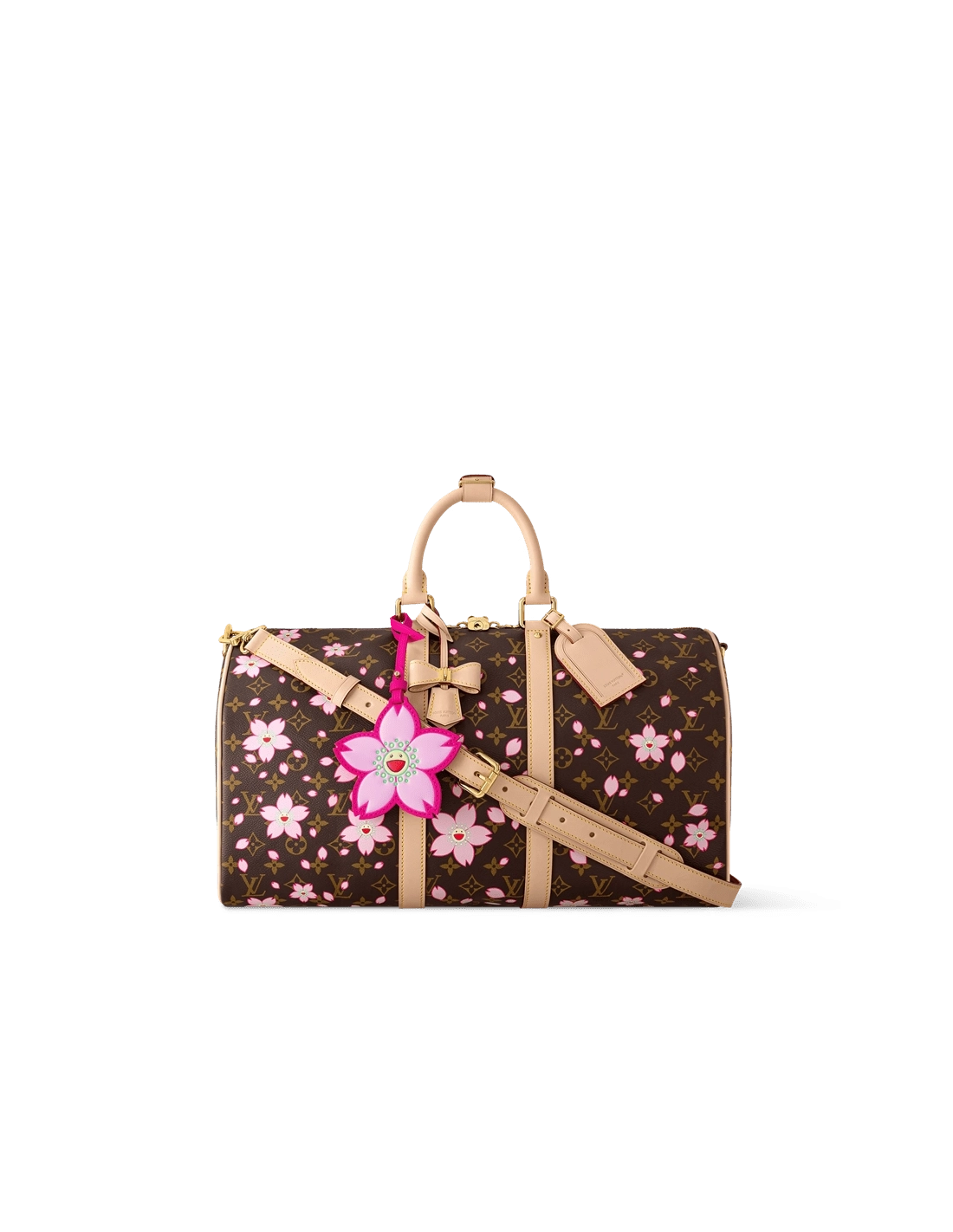 A true icon of the House, this playful version of the Keepall Bandouliere 45 twists a classic Monogram coated canvas finish with exuberant Cherry Blossom motifs from the celebratory re-edition of the Louis Vuitton x Takashi Murakami collection. The bag includes a keybell knot with padlock as well as a charm with the flower of the artist Murakami.