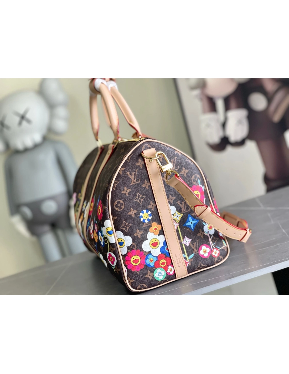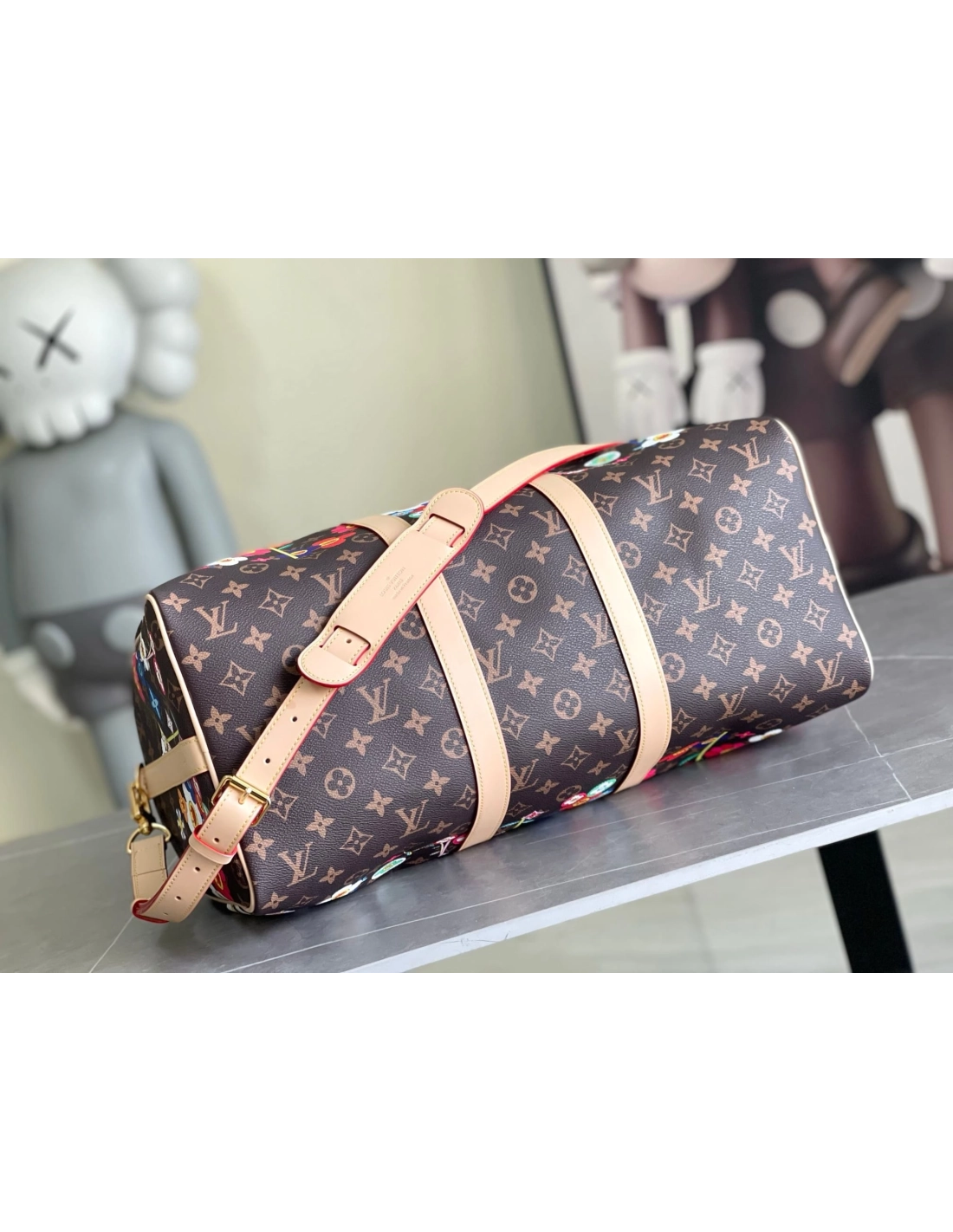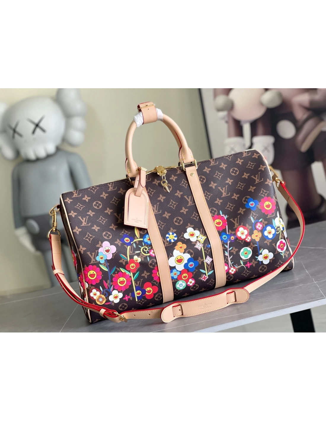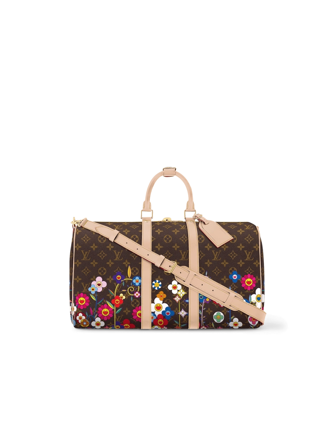 The Keepall Bandouliere 45 is crafted in practical cabin-sized proportions from timeless coated canvas with natural cowhide leather adding an elegant contrast to the lateral bands, top handles and removable cross-body strap. It features an allover Monogram motif that has been playfully overlaid with Monogram Flowers in the iconic superflat style of Japanese artist Takashi Murakami as part of the celebratory Louis Vuitton x Murakami collaboration.