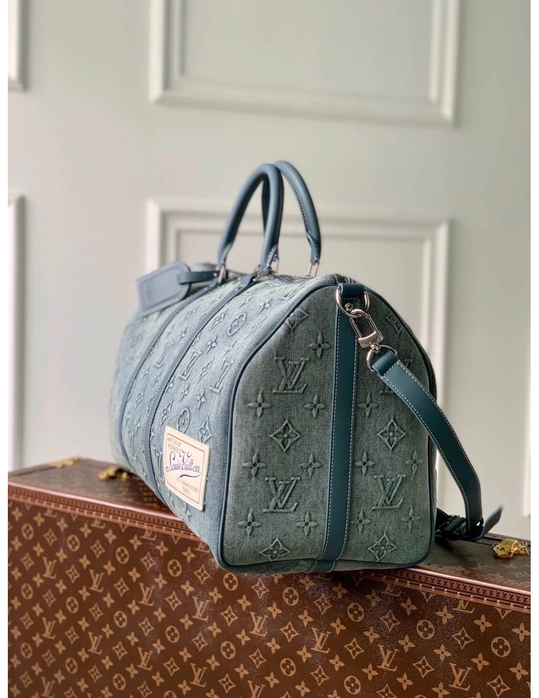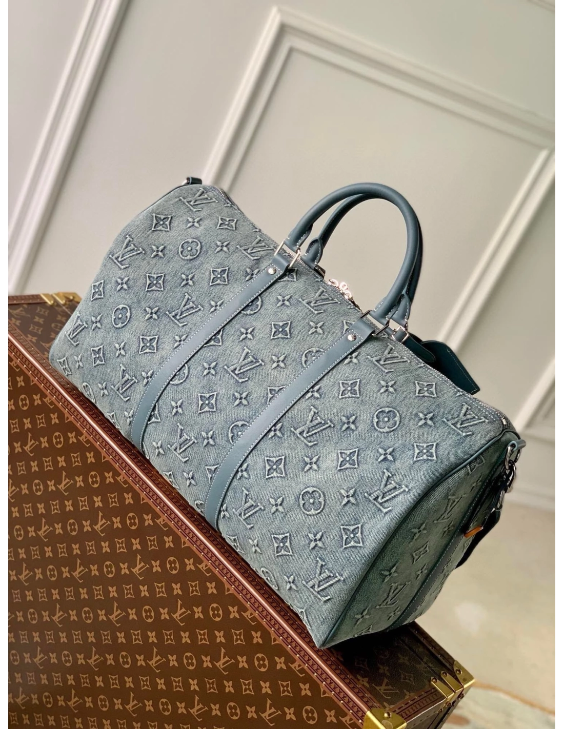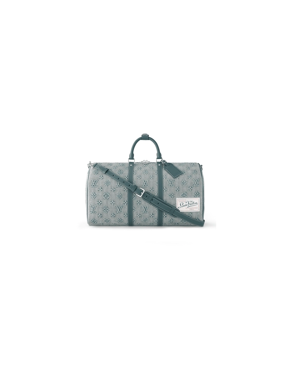 The Keepall Bandouliere 50 travel bag is a reimagining of one of Louis Vuittons most iconic designs, with faded denim embossed with the Monogram pattern. With reinforced side straps and top handles in cowhide leather, its a carry-on size with plenty of room for a weekend getaway.