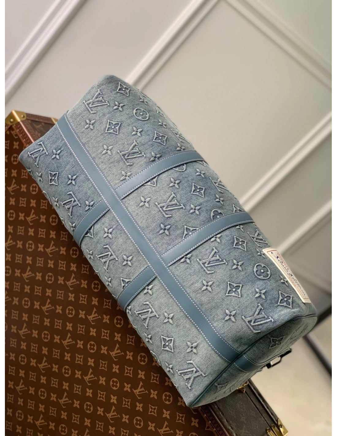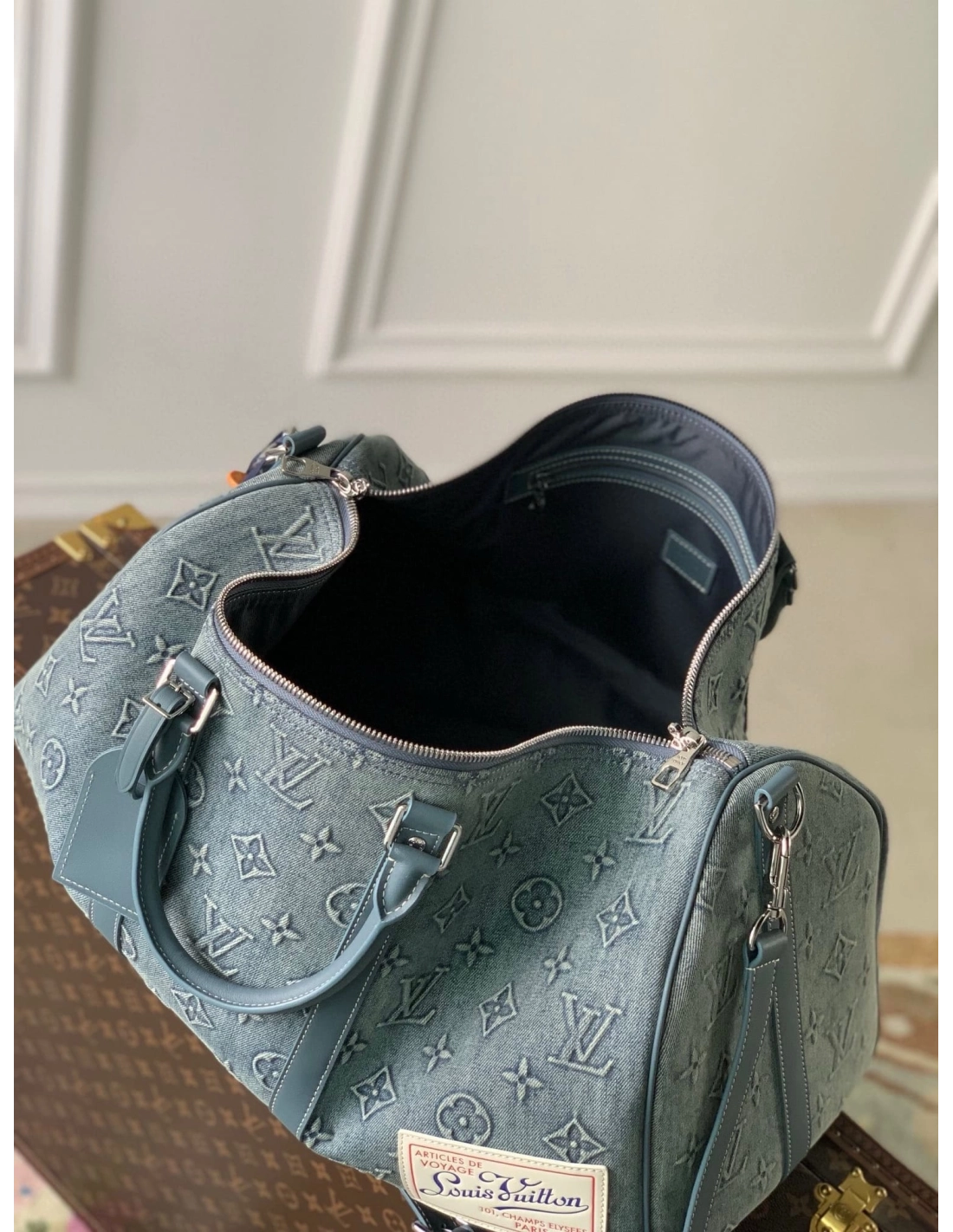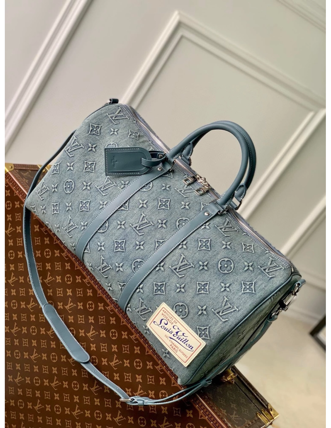 The Keepall Bandouliere 50 travel bag is a reimagining of one of Louis Vuittons most iconic designs, with faded denim embossed with the Monogram pattern. With reinforced side straps and top handles in cowhide leather, its a carry-on size with plenty of room for a weekend getaway.