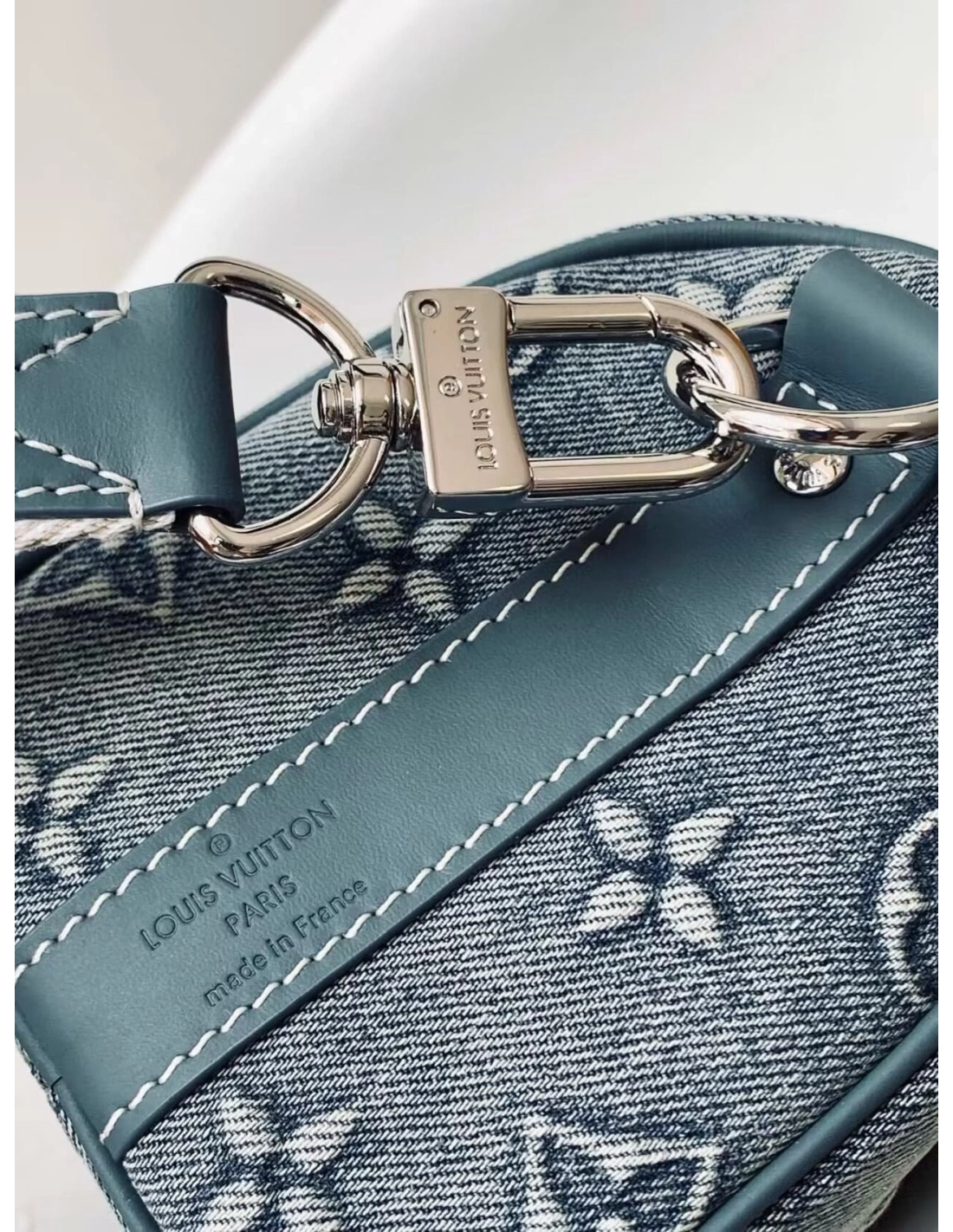 The Keepall Bandouliere 25 bag takes on a vintage feel in Monogram Washed Denim canvas, with its slightly worn, faded denim look. The Monogram is debossed into the fabric which is then hand-sprayed to emphasize the Monogram Flowers and LVs. The bag features a retro-style name tag and a detachable and adjustable strap for shoulder carry.