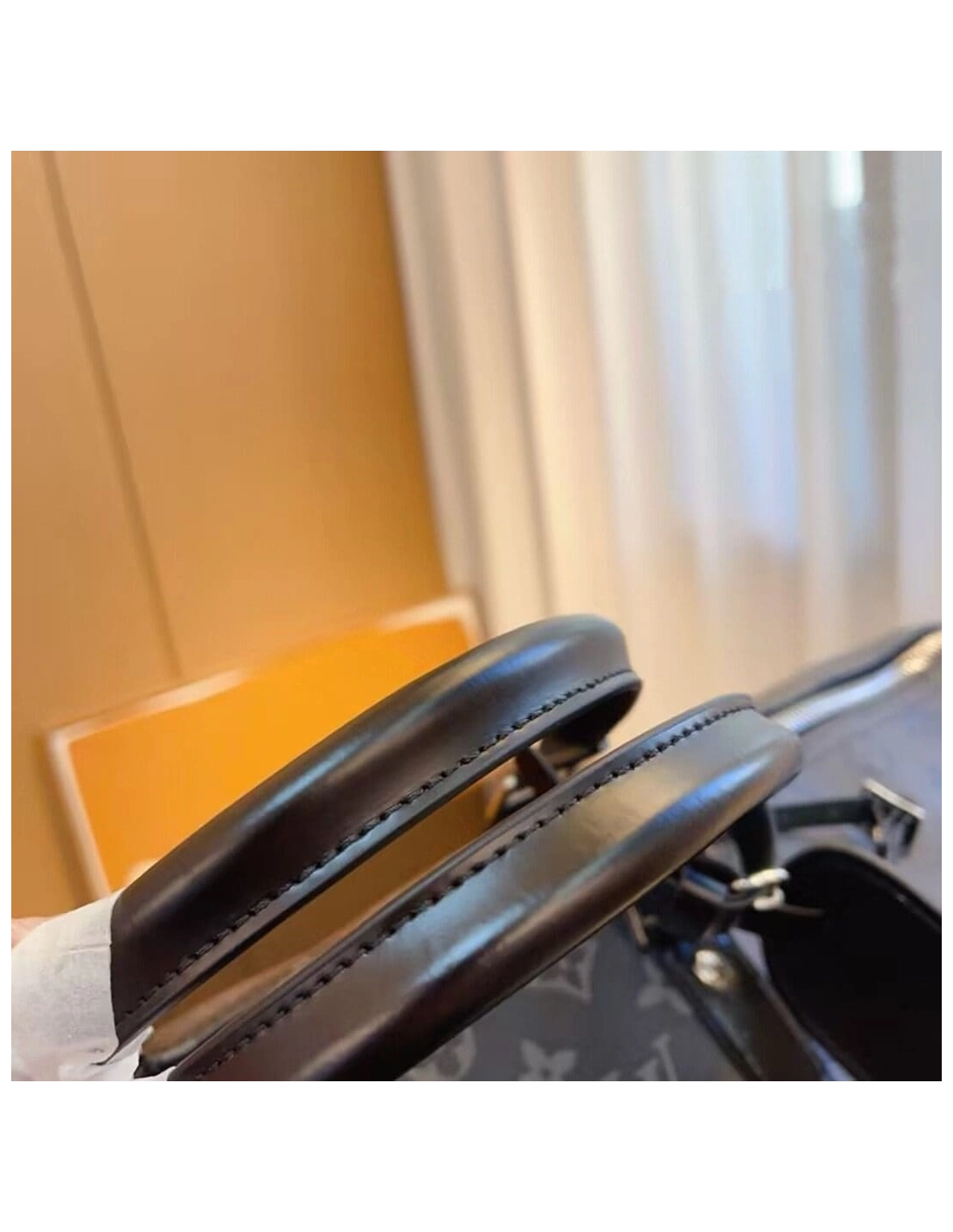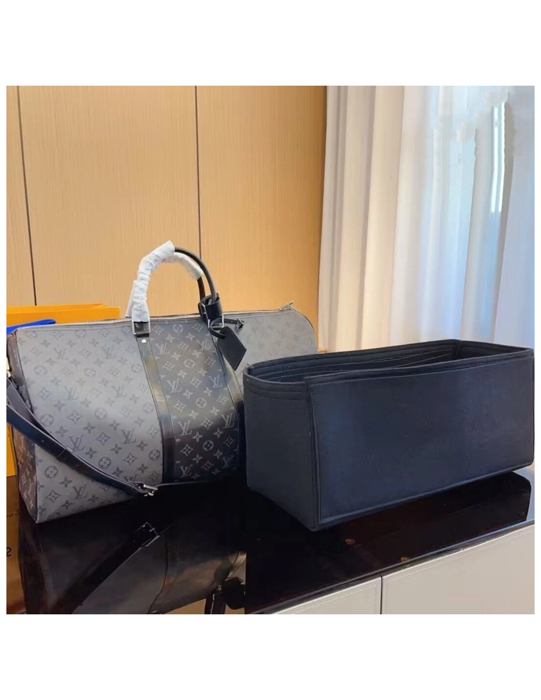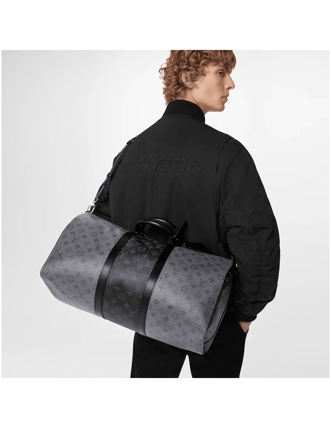 The Keepall Bandouliere 50 alternates blocks of dark Monogram Eclipse canvas with lighter Monogram Eclipse Reverse to create a bold masculine feel. This classic soft travel bag boasts leather top handles and two leather bands along the side, all in black, making it instantly recognizable. Cabin-friendly, it has an unexpectedly spacious interior.
