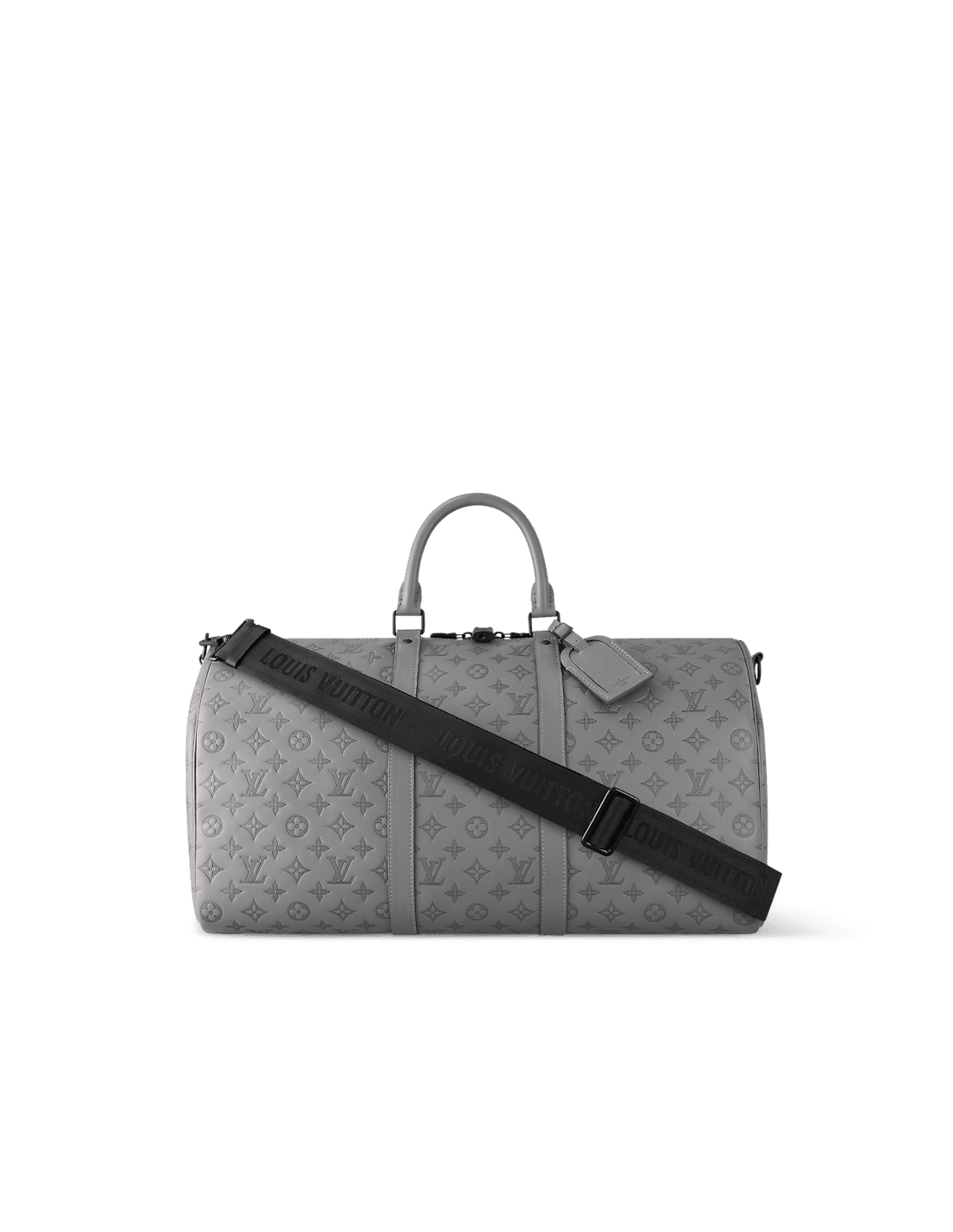 Louis Vuittons classic Keepall gets a contemporary new look with Monogram Shadow leather in a sophisticated shade of gray. Soft, supple calf leather is embossed with the Houses historic Monogram pattern for a refined signature touch. A large-capacity bag, perfect for short trips or as a carry-on.
