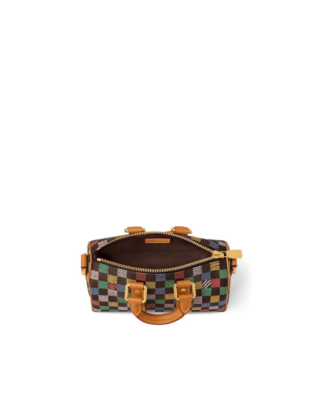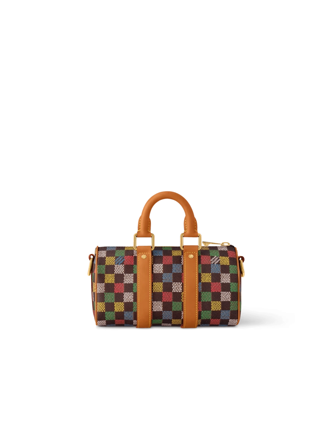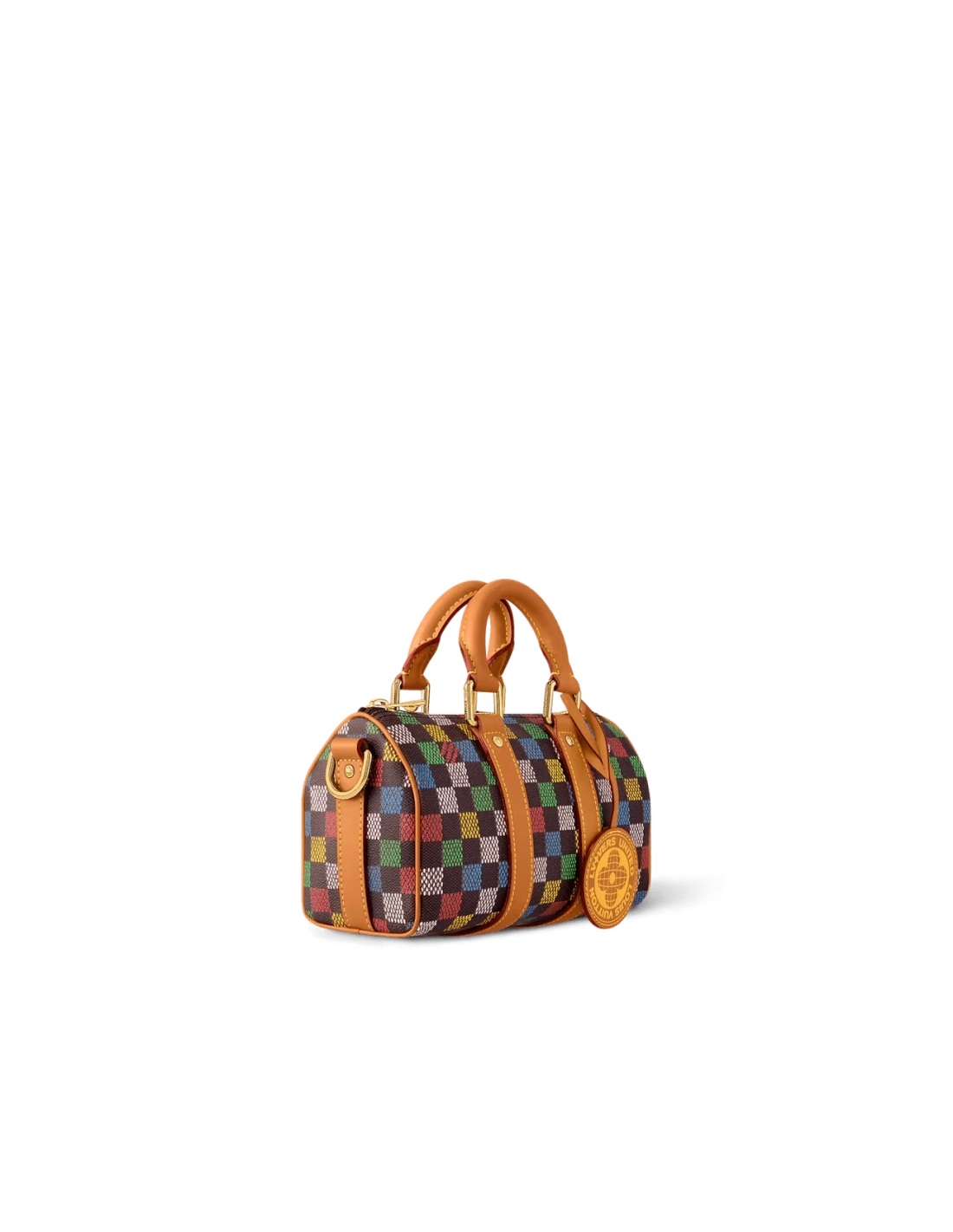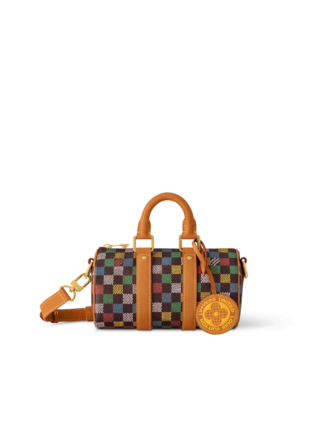 The Keepall Bandouliere 25 city bag is made from Pharrell Williams LV Vers Damier Ebene canvas, on which what looks to be hand-painted squares are printed over the Damier Ebene checkerboard. Luxurious details, like the pearl zip pull, LV Vers UNITED tag, and theMarque Louis Vuitton Deposee on the Damier incarnates Williams blending of past and present.